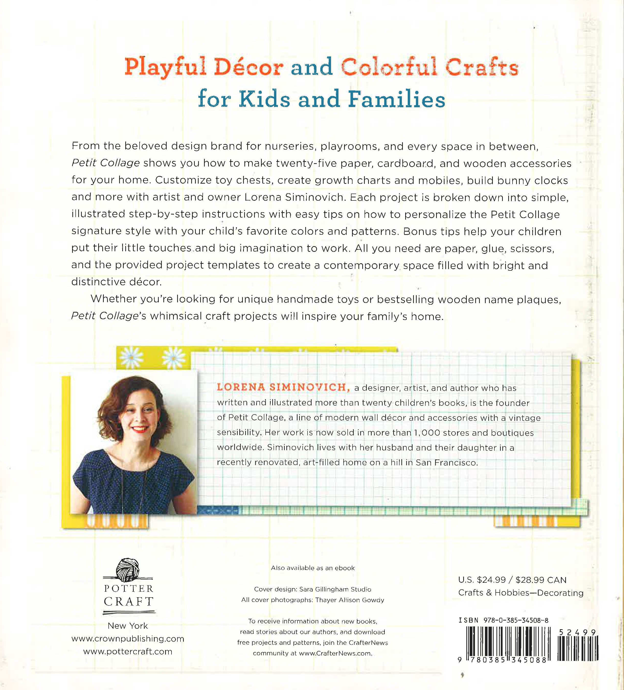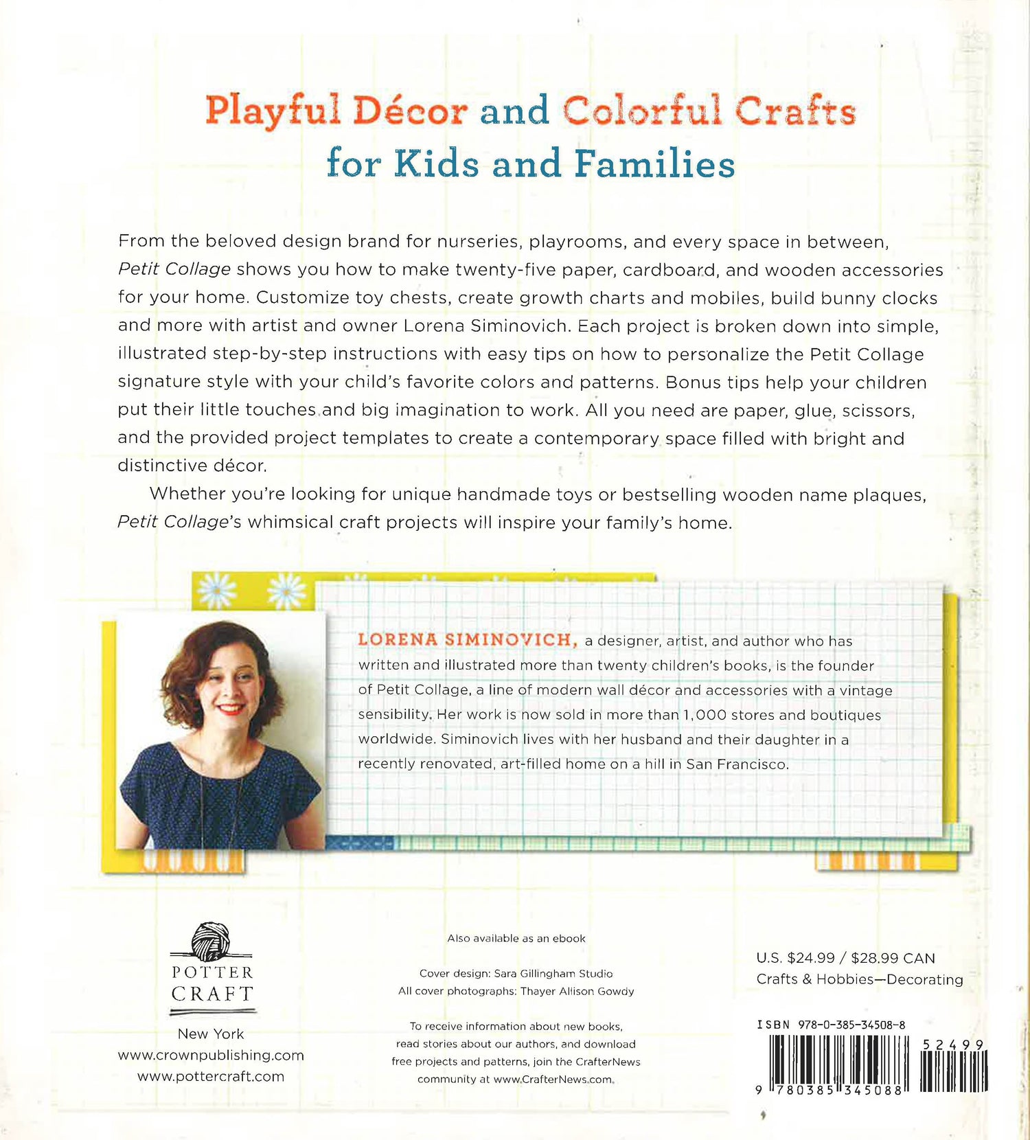 This is perfect to decorate a chic nursery, give as baby gifts, or personalise kids' rooms. For the first time, award-winning artist Lorena Siminovich shares 25 of her vintage modern handcrafted designs for children and families. These fun, imaginative projects range from a paper toy dollhouse and personalised baby blocks to an adorable bunny clock and Petit Collage's signature name plaque, growth chart, and paper mobiles. With smart ideas, simple decoupage and paper techniques and inspiring projects, this book will help parents create handmade items for kids that adults will also adore.