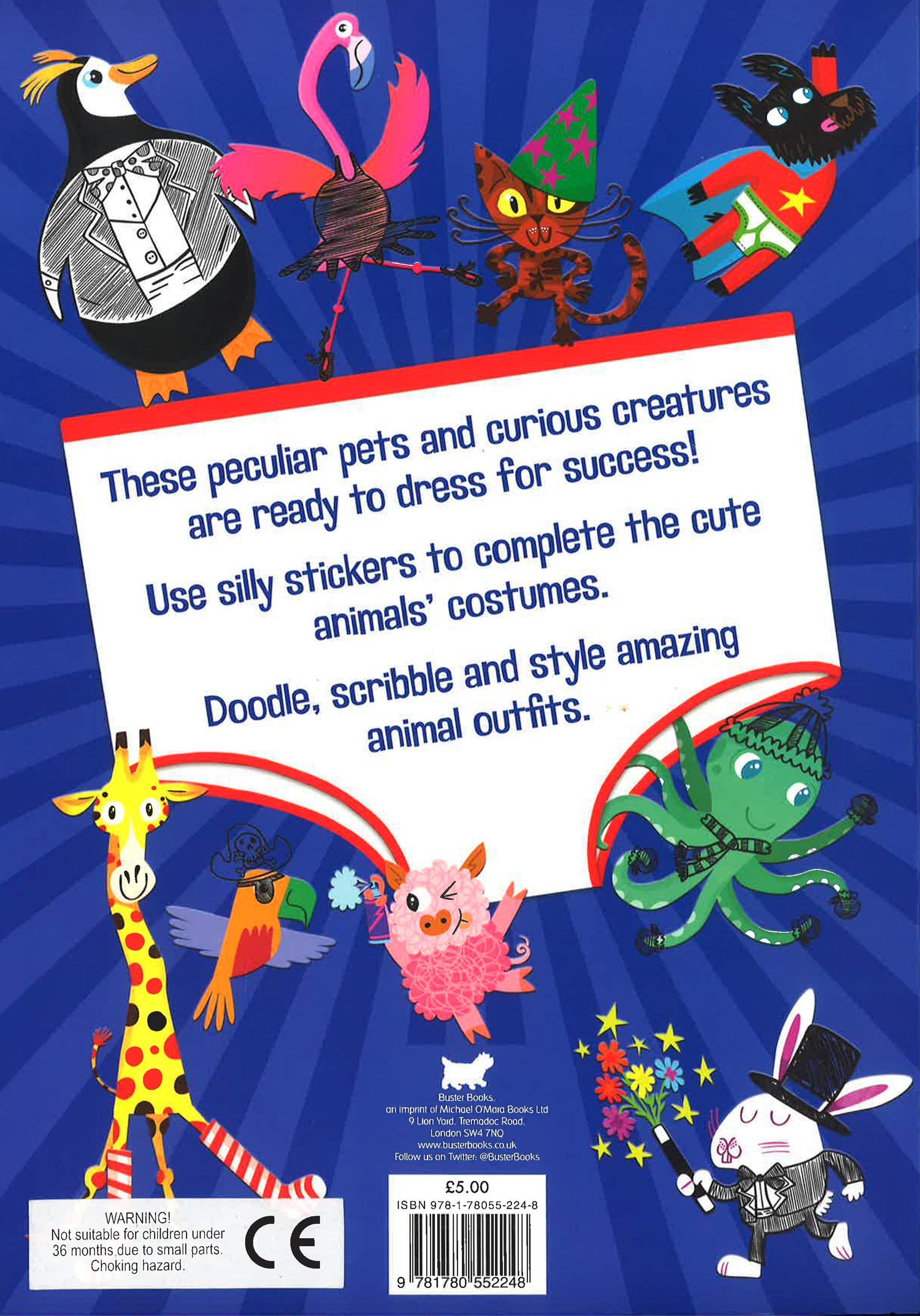 These peculiar pets and curious creatures are ready to dress for success! Use silly stickers to complete the cute animals' costumes. Doodle, scribble and style amazing animal outfits.