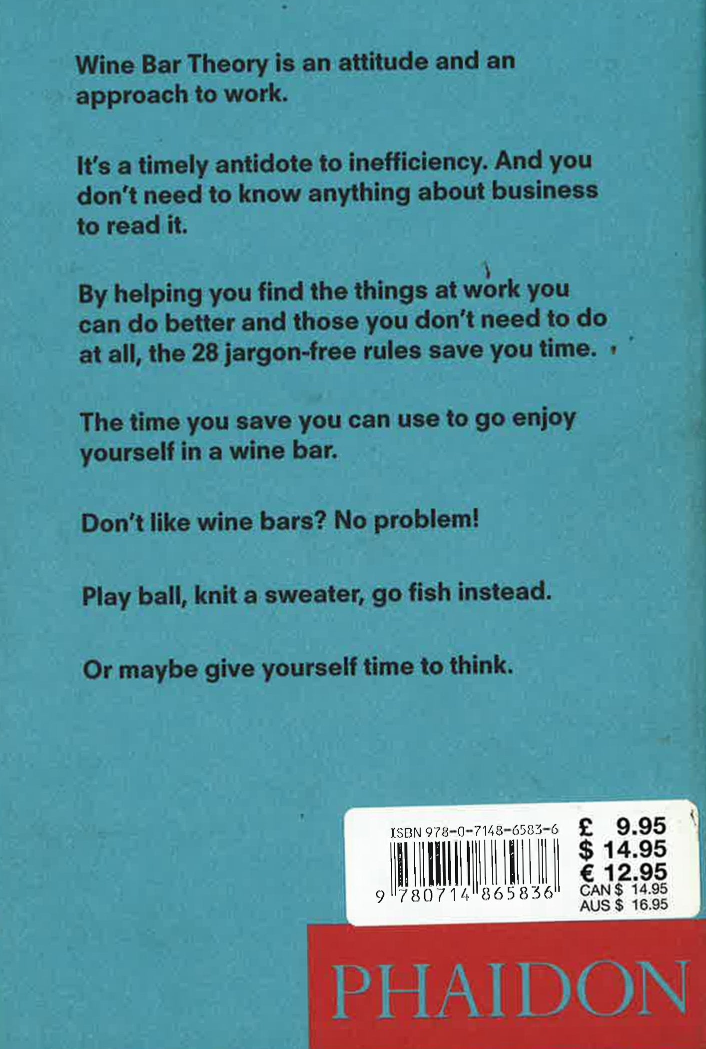 Wine Bar Theory is an attitude and an approach to work. It's not about cutting corners, it's about wanting the very best and not settling for less. It's a theory that can pave your road to success. Wine Bar Theory shows you things you can do more easily, and things you don't need to do at all. It's about being effective and not just busy. This affordable, pocket-sized book is a business book like no other.