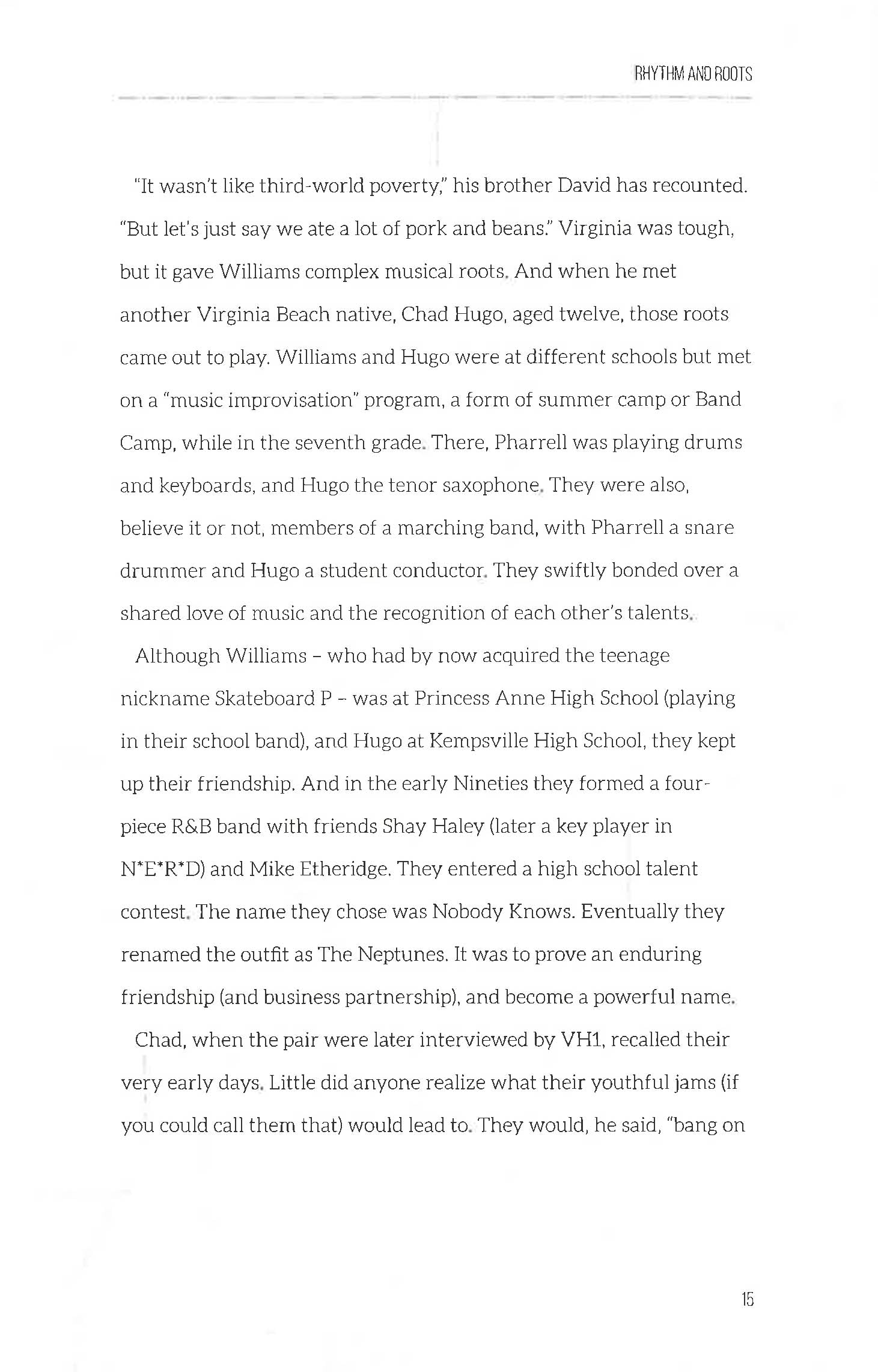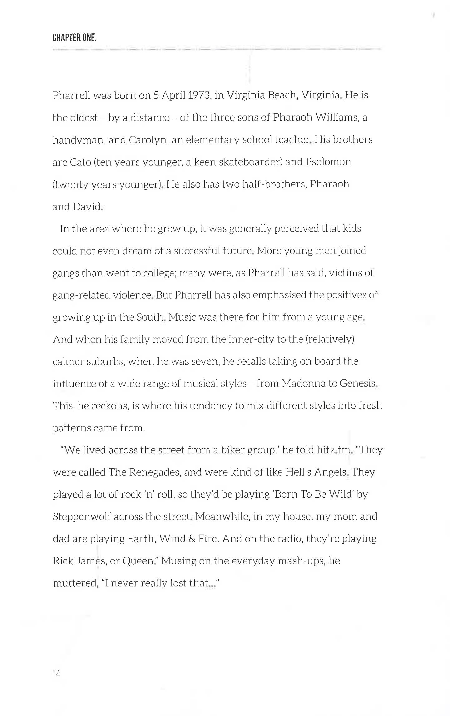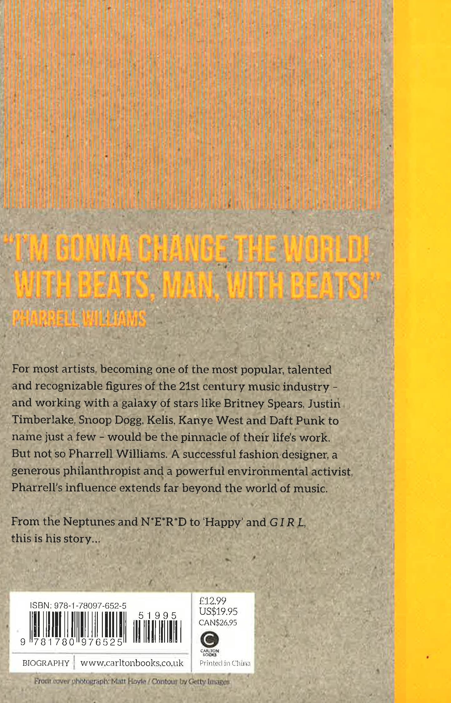 Pharrell Williams tells the story of the global megastar, including details of his prolific and varied collaborations with the best-known musicians of the 21st century. It charts his extraordinary life, from his pre-fame days to becoming pop's most sought-after and inventive pioneer, and highlights the singer/rapper's most famous moments, best-known songs (including "Get Lucky" and "Happy"), and rise to international pop-superstardom. The book includes eight pages of photos.