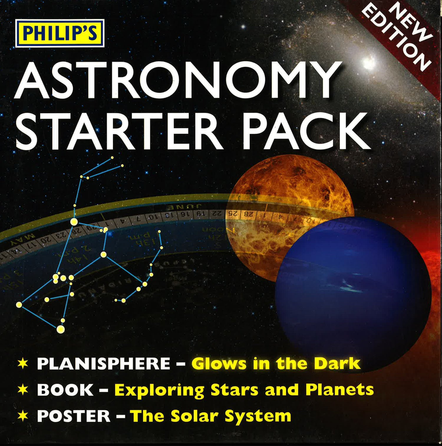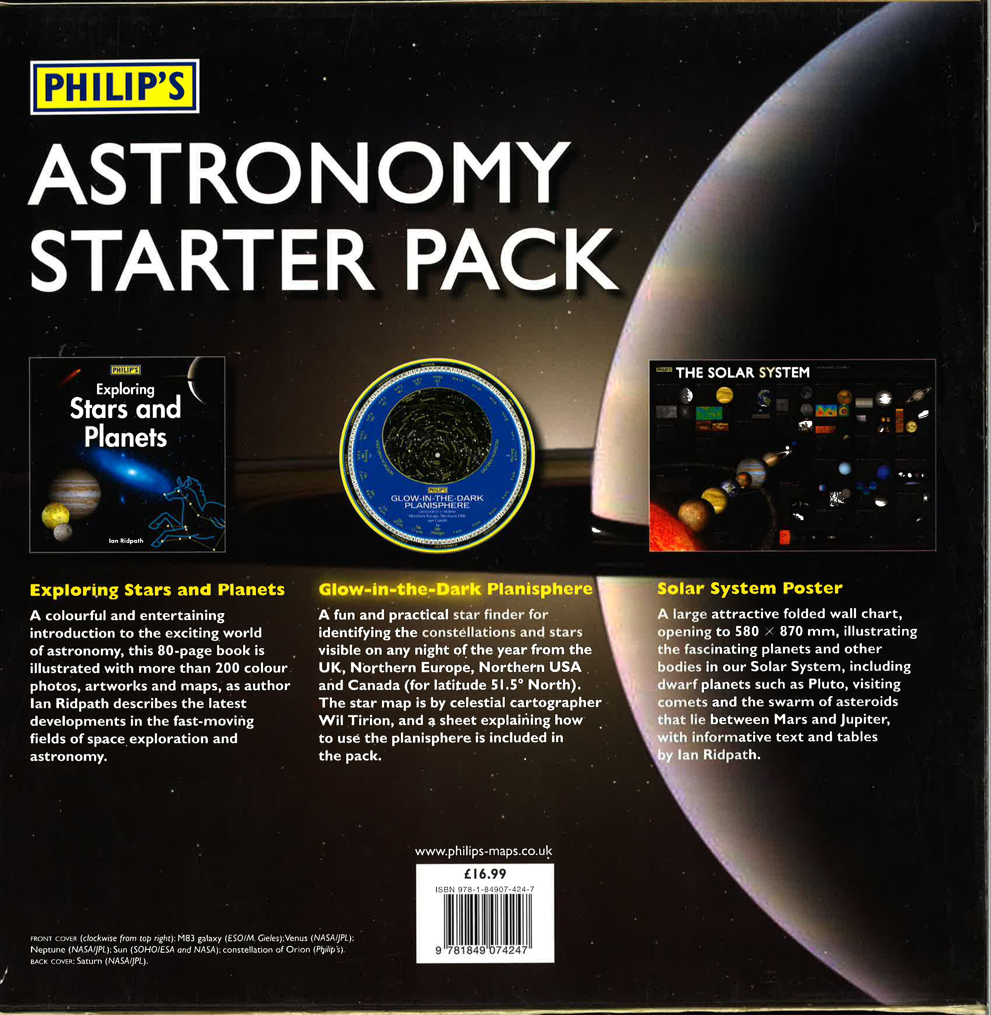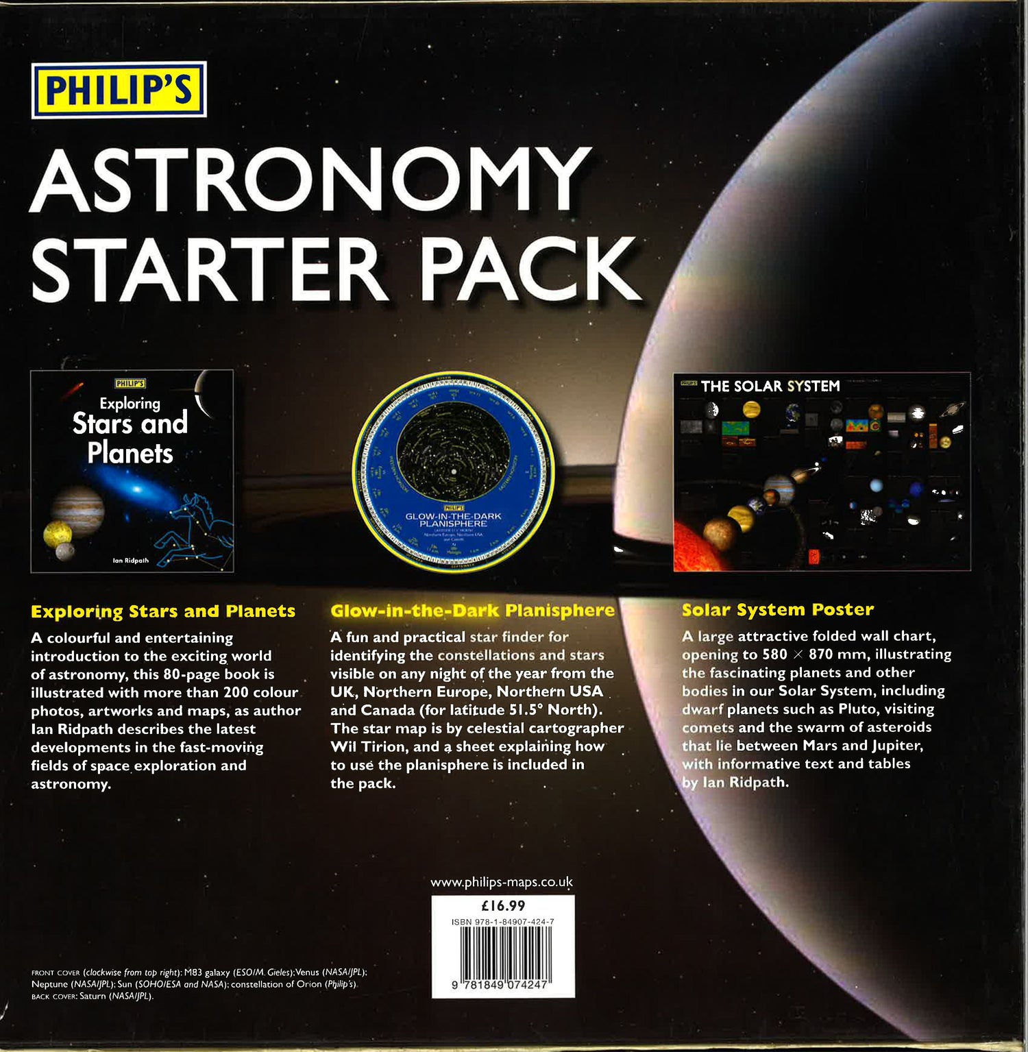 A new edition of the exciting Philip's Astronomy Starter Pack, suitable for use in the Northern Hemisphere, containing three essential items to introduce the beginner to the fascinating hobby of astronomy: a 'glow-in-the-dark' planisphere, an 80-page paperback book about the stars and planets, and a colourful wall poster of the Solar System. Philip's Glow-in-the-Dark Planisphere: This planisphere has been specially made so that, after being held under a bright light, the stars and the names and shapes of the constellations will glow in the dark for a period. It is both a fun and practical starfinder for identifying the stars and constellations visible on any night of the year from the UK, Northern Europe, Northern USA and Canada (51.5 degrees North); the star map is drawn by the well-known celestial cartographer Wil Tirion. A sheet explaining how to use the planisphere is included in the pack. Philip's Exploring Stars and Planets: A colourful and entertaining introduction to the exciting world of astronomy, this 80-page paperback is illustrated with more than 200 colour photographs, artworks and maps, as the author Ian Ridpath describes the latest developments in the fast-moving fields of space exploration and astronomy. Concise chapters introduce the Sun, the Earth and all the other planets in our Solar System. Then, moving further into space, the author examines the stars and galaxies, and explores the origin of the Universe. Philip's Solar System Poster: A large attractive folded wall chart (580 x 870mm) illustrating the planets and other bodies in the Solar System, with informative text and tables by Ian Ridpath.