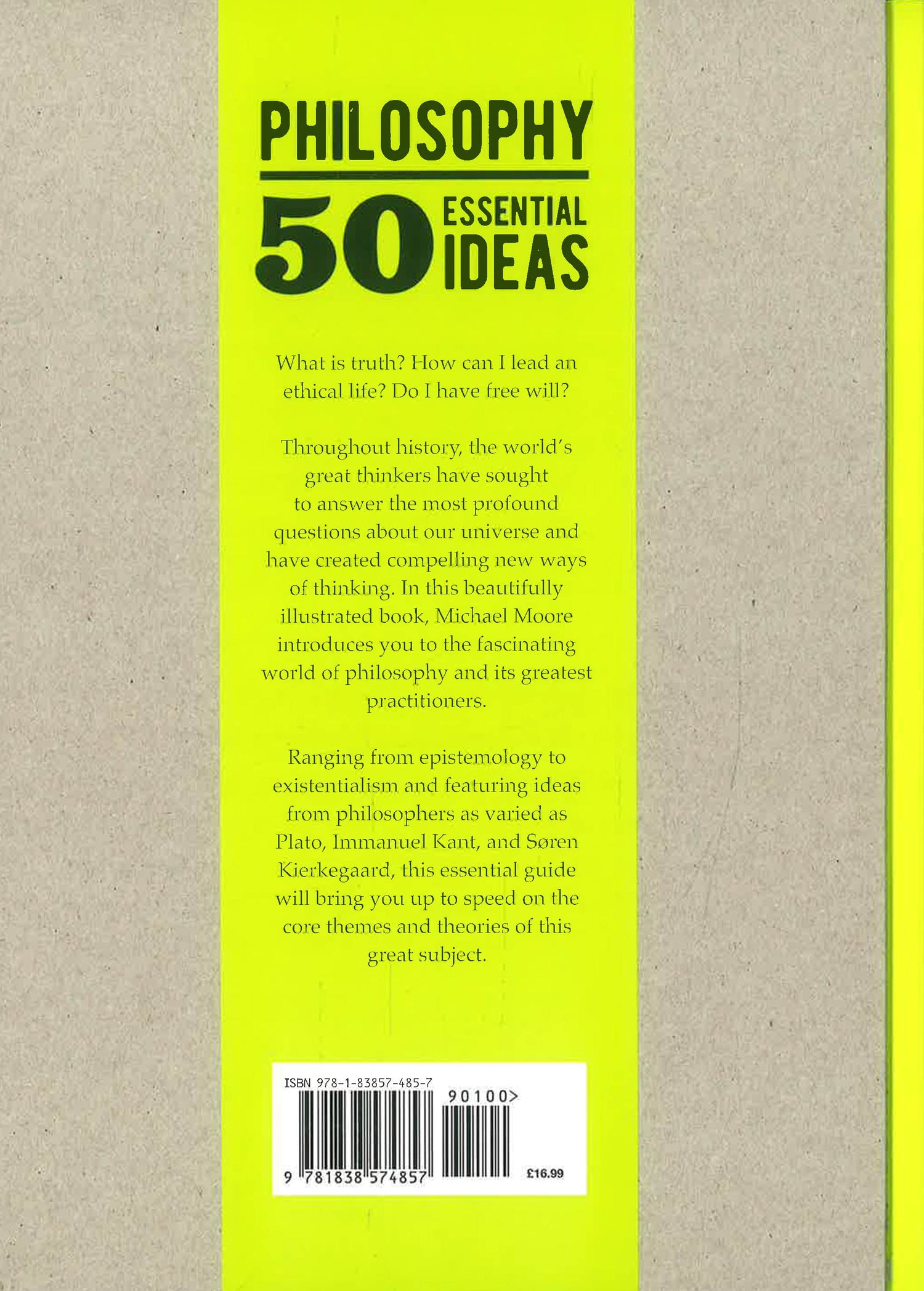 What is truth? How can I lead an ethical life? Do I have free will?Throughout history, the world's great thinkers have sought to answer the most profound questions about our universe and have created compelling new ways of thinking. In this beautifully illustrated hardback, Michael Moore introduces you to the fascinating world of philosophy and its greatest practitioners. Ranging from epistemology to existentialism and featuring ideas from philosophers as varied as Plato, Immanuel Kant, and Jean-Paul Sartre, this essential guide will bring you up to speed on the core themes and theories of this great subject.ABOUT THE SERIES: The Essential Ideas series brings together entertaining, highly visual guides to different disciplines, from philosophy to physics. It explores the subject's 50 greatest ideas, giving readers an accessible overview of its defining theories and breakthroughs.
