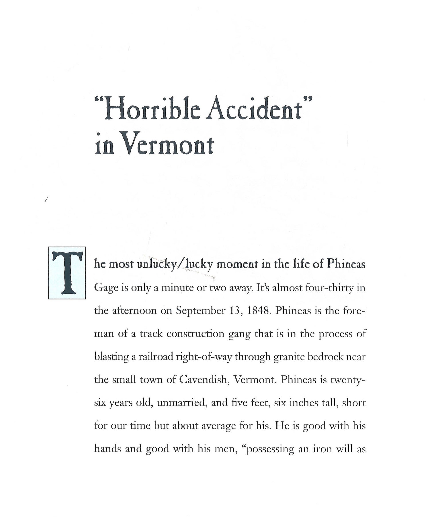 Phineas Gage was truly a man with a hole in his head. Phineas, a railroad construction foreman, was blasting rock near Cavendish, Vermont, in 1848 when a thirteen-pound iron rod was shot through his brain. Miraculously, he survived to live another eleven years and become a textbook case in brain science.