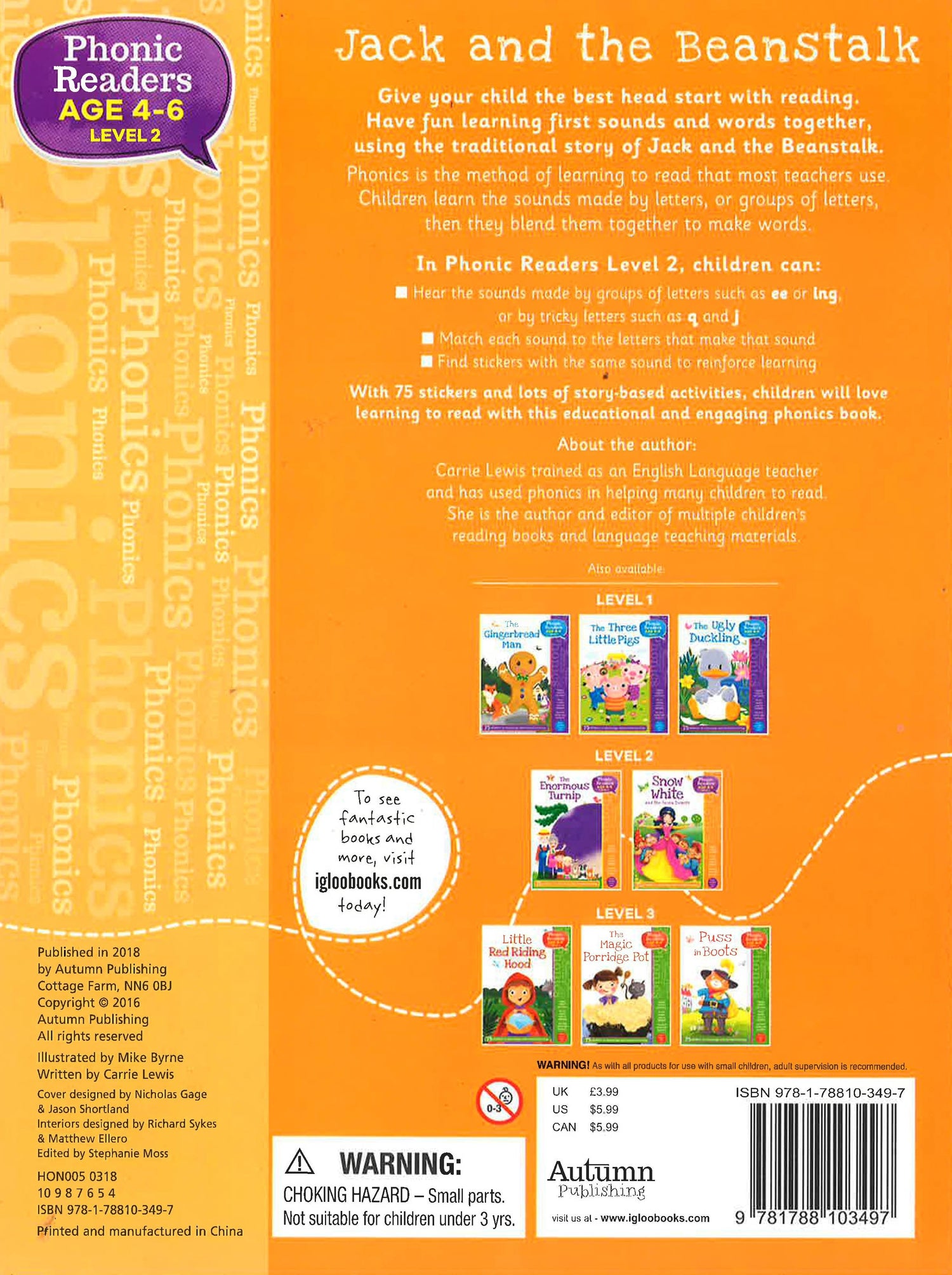 Give your child the best head start with reading. Have fun learning first sounds and words together, using the traditional story of Jack and The Beanstalk. Phonics is the method of learning to read that most teachers use. Children learn the sounds made by letters, or group of letters, then they blend them together to make words. With 75 stickers and lots of story-based activities children will love learning to read with this educational and engaging phonics book.