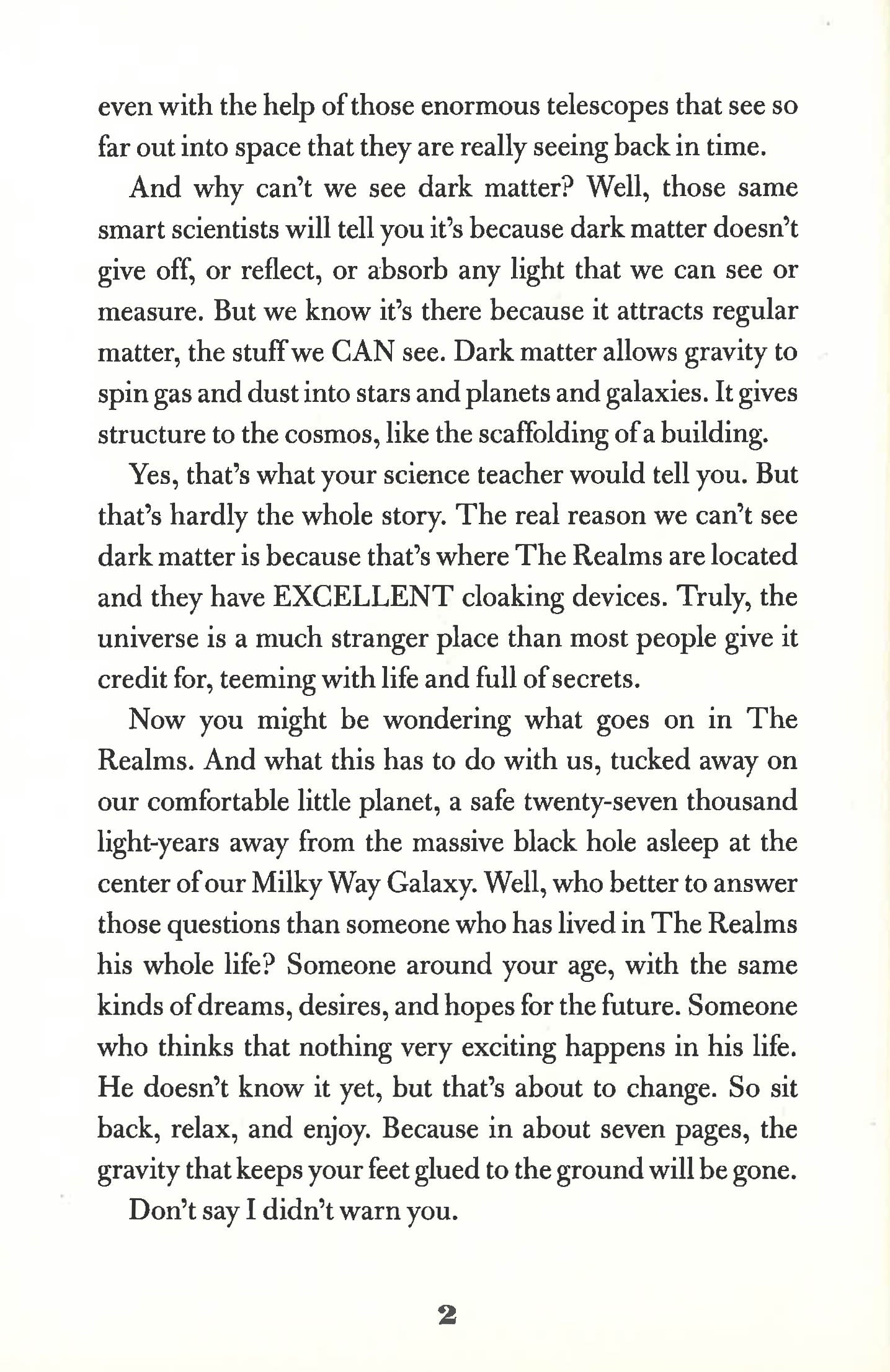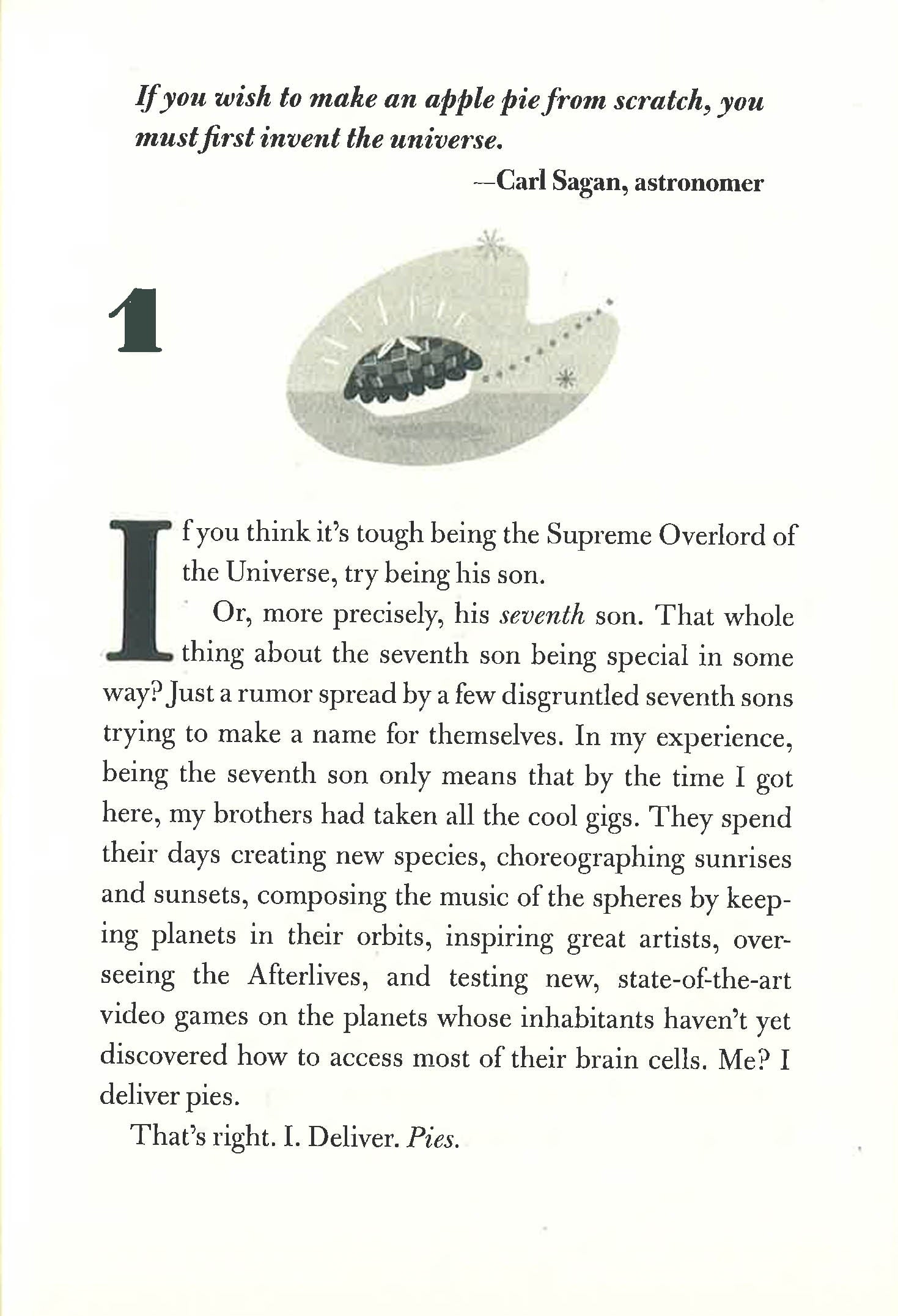 Joss is the seventh son of the Supreme Overlord of the Universe. His older brothers help his dad rule the cosmos, but all Joss gets to do is deliver pies. That's right: pies. Of course, these pies actually hold the secrets of the universe between their buttery crusts, but they're still pies. Joss is happy to let his older brothers shine. He has plenty to keep his hands full: attempting to improve his bowling score; listening to his best friend, Kal, try (and fail) to play the drums; and exploring his ever-changing home, The Realms. But when Earth suddenly disappears, Joss is tasked with the seemingly impossible job of bringing it back. With the help of Annika, an outspoken girl from Earth, he embarks on the adventure of a lifetime... and learns that the universe is an even stranger place than he'd imagined. From the New York Times bestselling author of The Candymakers comes a world-hopping tale that leads the reader deep into the heart of the mysteries of time and space. Plus, there's pie.