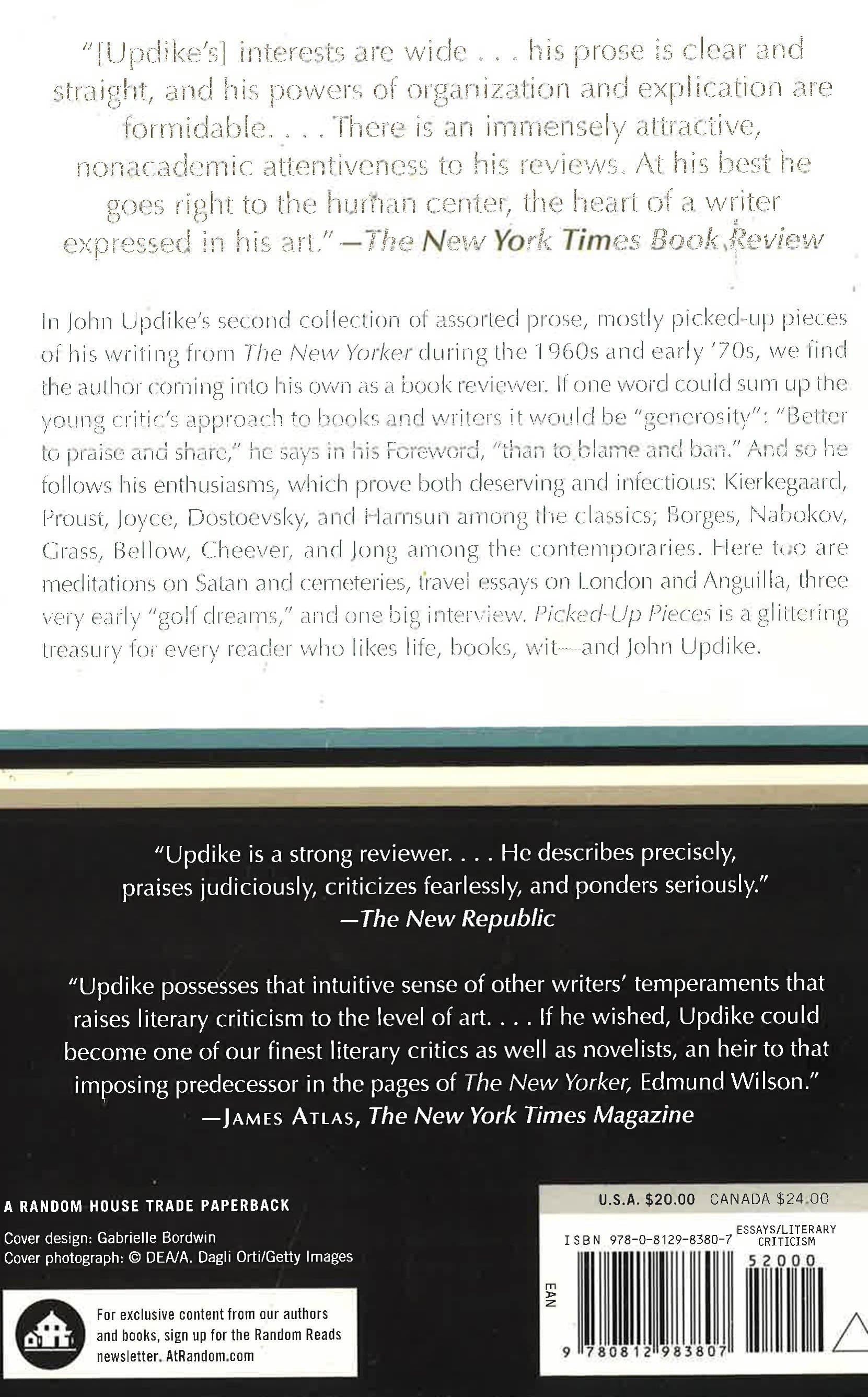 In John Updike's second collection of assorted prose he comes into his own as a book reviewer; most of the pieces picked up here were first published in The New Yorker in the 1960s and early '70s. If one word could sum up the young critic's approach to books and their authors it would be "generosity" "Better to praise and share," he says in his Foreword, "than to blame and ban." And so he follows his enthusiasms, which prove both deserving and infectious: Kierkegaard, Proust, Joyce, Dostoevsky, and Hamsun among the classics; Borges, Nabokov, Grass, Bellow, Cheever, and Jong among the contemporaries. Here too are meditations on Satan and cemeteries, travel essays on London and Anguilla, three very early "golf dreams," and one big interview. Picked-Up Pieces is a glittering treasury for every reader who likes life, books, wit--and John Updike.