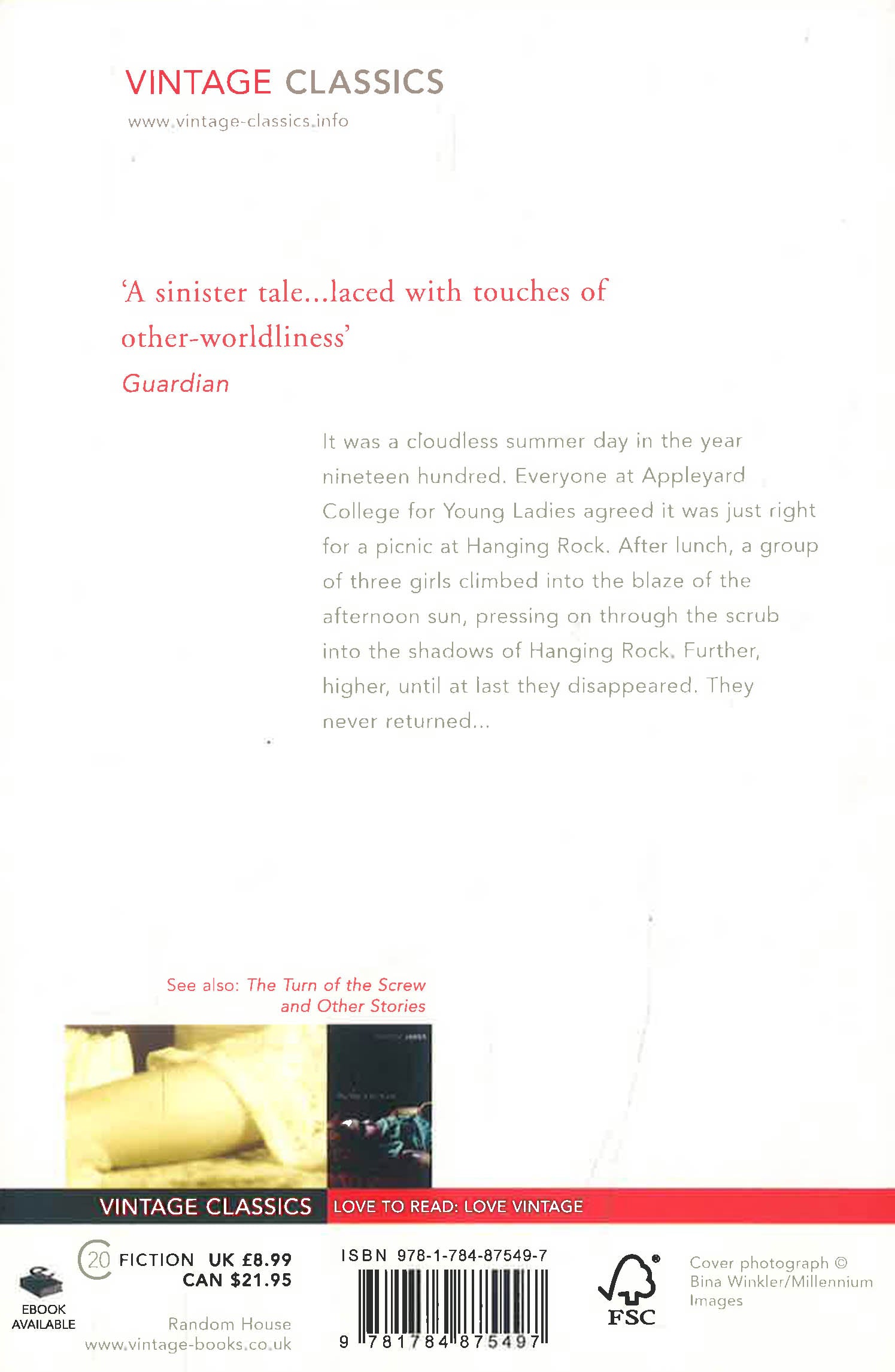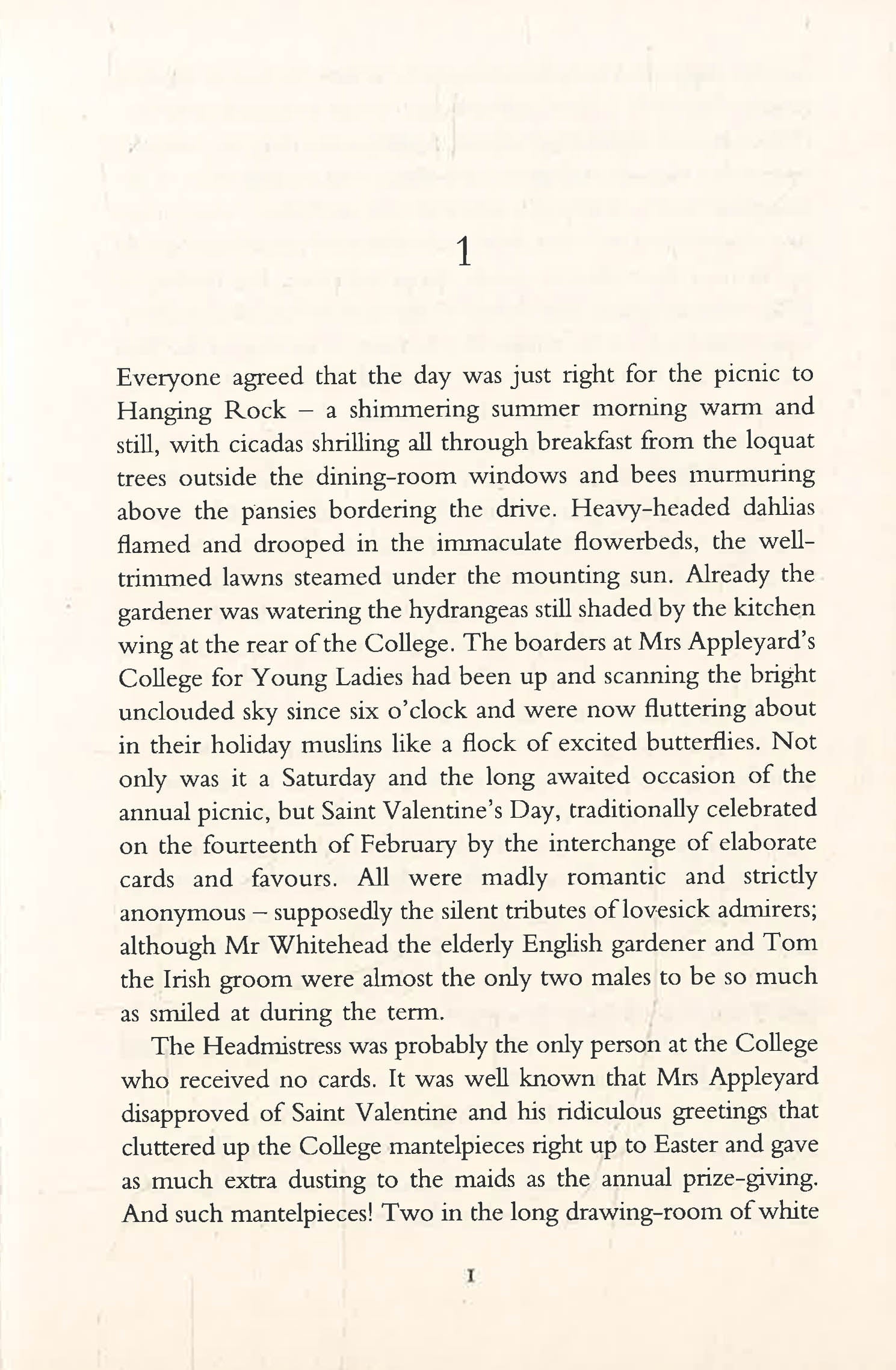 Everyone at Appleyard College for Young Ladies agreed it was just right for a picnic at Hanging Rock. After lunch, a group of three girls climbed into the blaze of the afternoon sun, pressing on through the scrub into the shadows of Hanging Rock. Further, higher, till at last they disappeared.