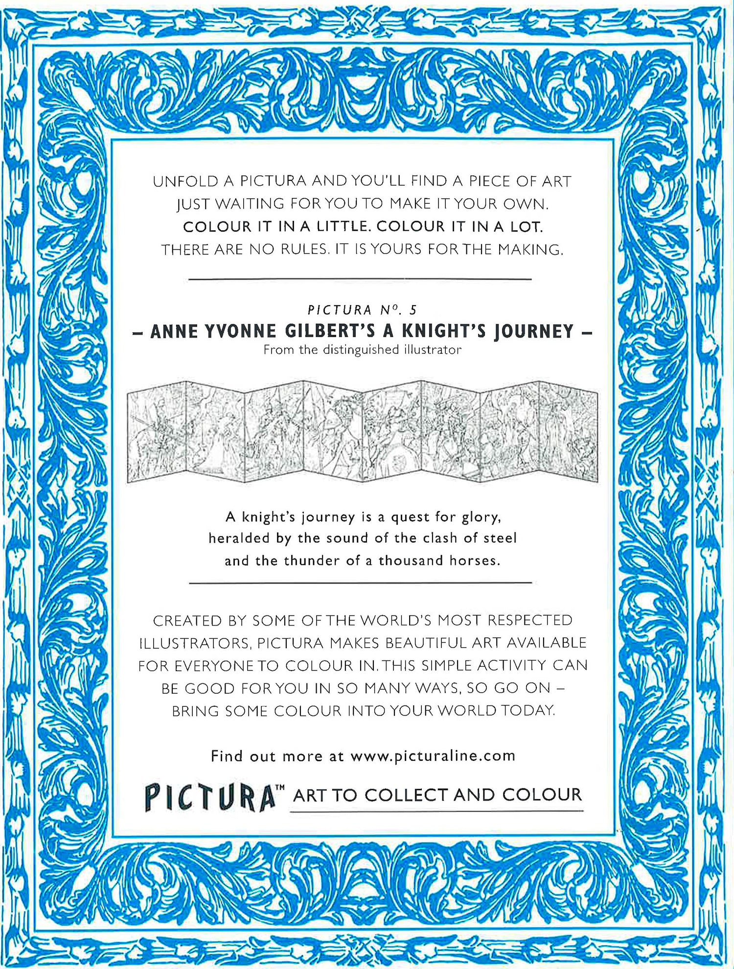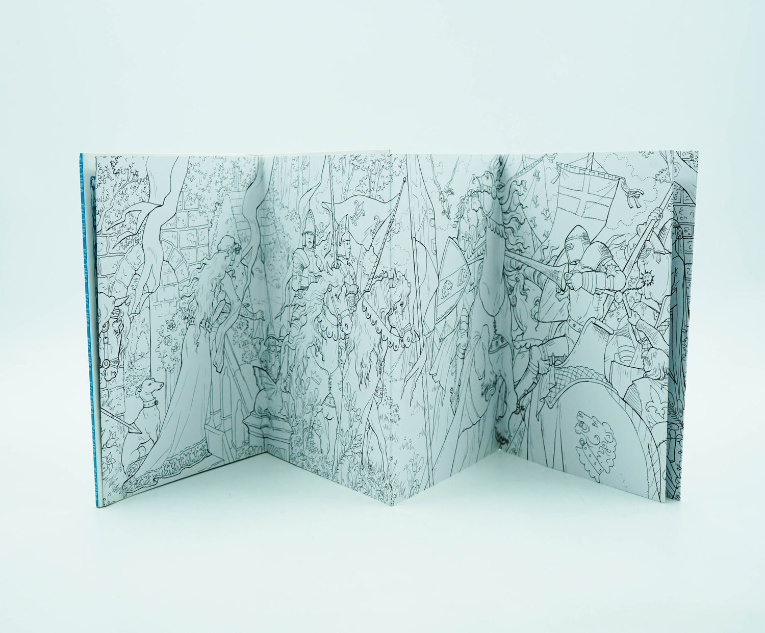 Pictura is a stunning range of black-and-white artworks to collect and colour, for ages 9 to 90. A Knight's Journey is a detailed and dramatic portrayal of a knight's life, from riding on horseback to jousting to the knighting ceremony itself. The reverse of the concertina has added non-fiction content that sheds light on the ceremonies, costumes and people pictured on the front.