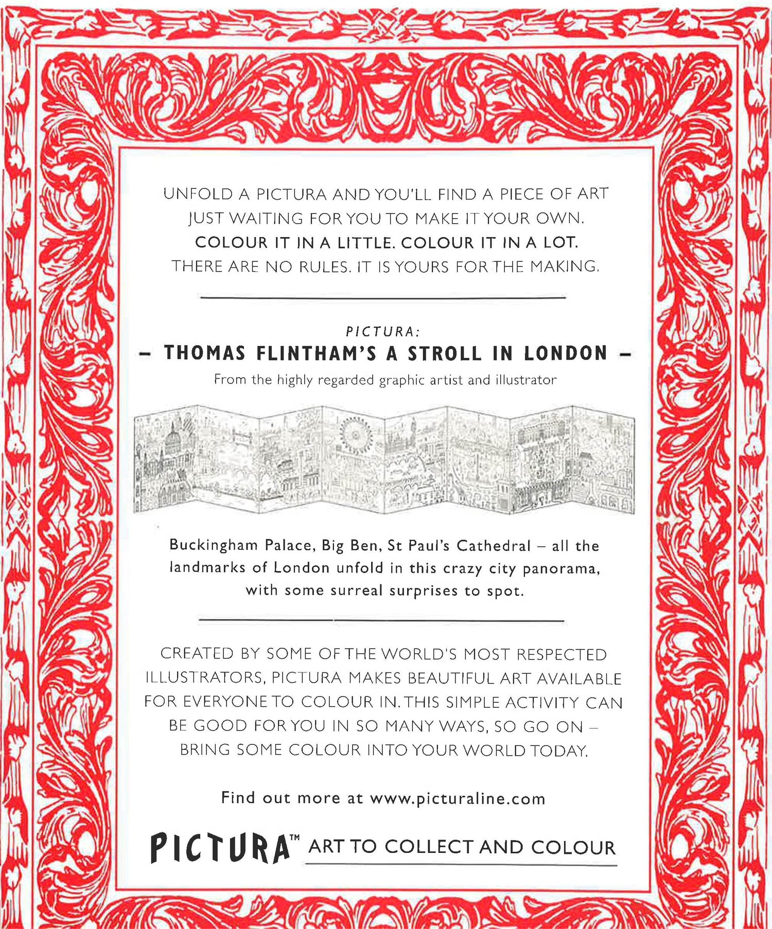 Pictura is a stunning range of black-and-white artworks to collect and colour for all ages. In Thomas Flintham's A Stroll In London. Take a stroll through London from St Paul's Cathedral to Marble Arch, passing iconic landmarks on the way. Today is a very special day in London, however...can you spot the giant in Bank and and the sea monsters on the Thames? Pictura is upmarket colouring-in, with better artwork than rival product detailed scene of gridlocked city has plenty of humour and 'Where's Wally' style funIncludes Q & A that gives tips on drawing from the artist. Colouring-in IS for adults and has many benefits: it relieves stress, enhances connectivity in the brain, increases focus and improves cognitive function.