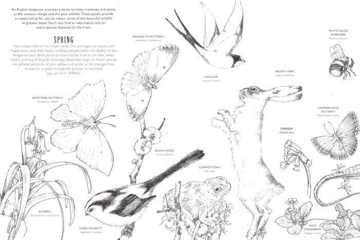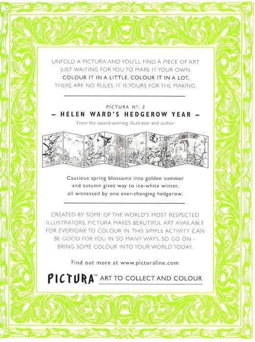 Pictura is a stunning range of black-and-white artworks to collect and colour, for ages 9 to 90. In Hedgerow Year, the beautiful seasons of the English countryside are witnessed by one ever-changing hedgerow, from the bright colours of summer flowers to the white snow of winter. The back of the concertina features a guide to species with informative facts on each.