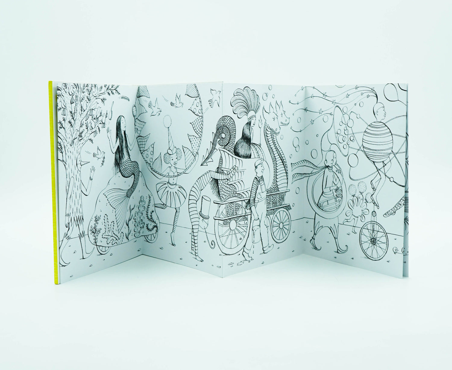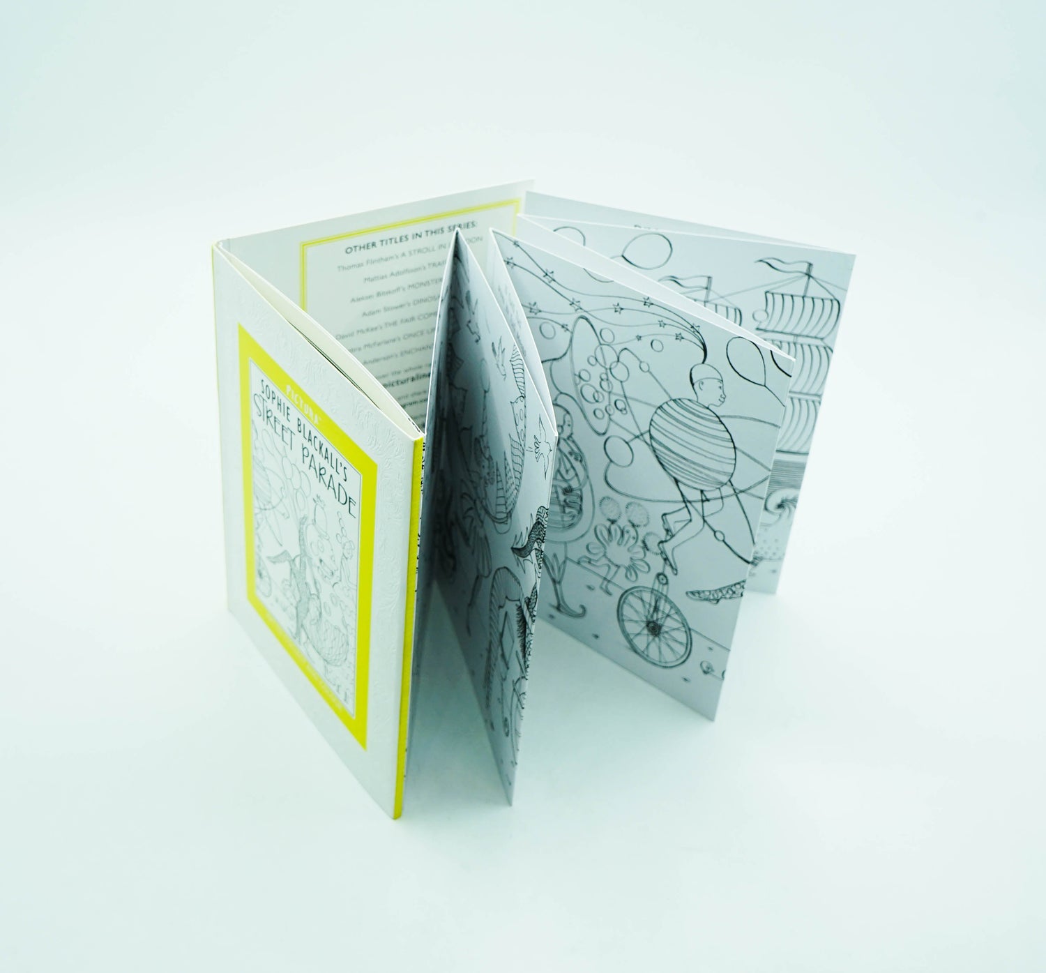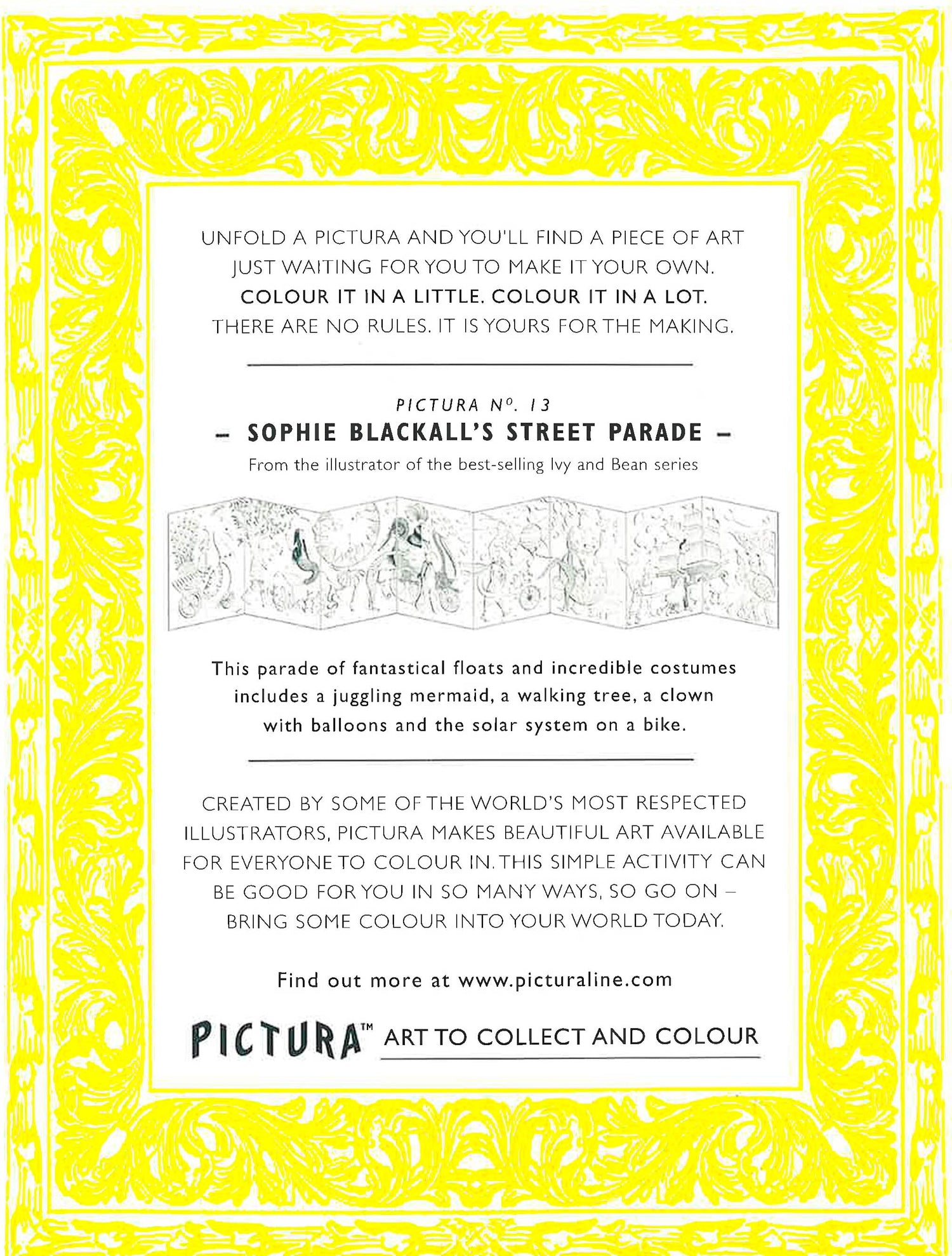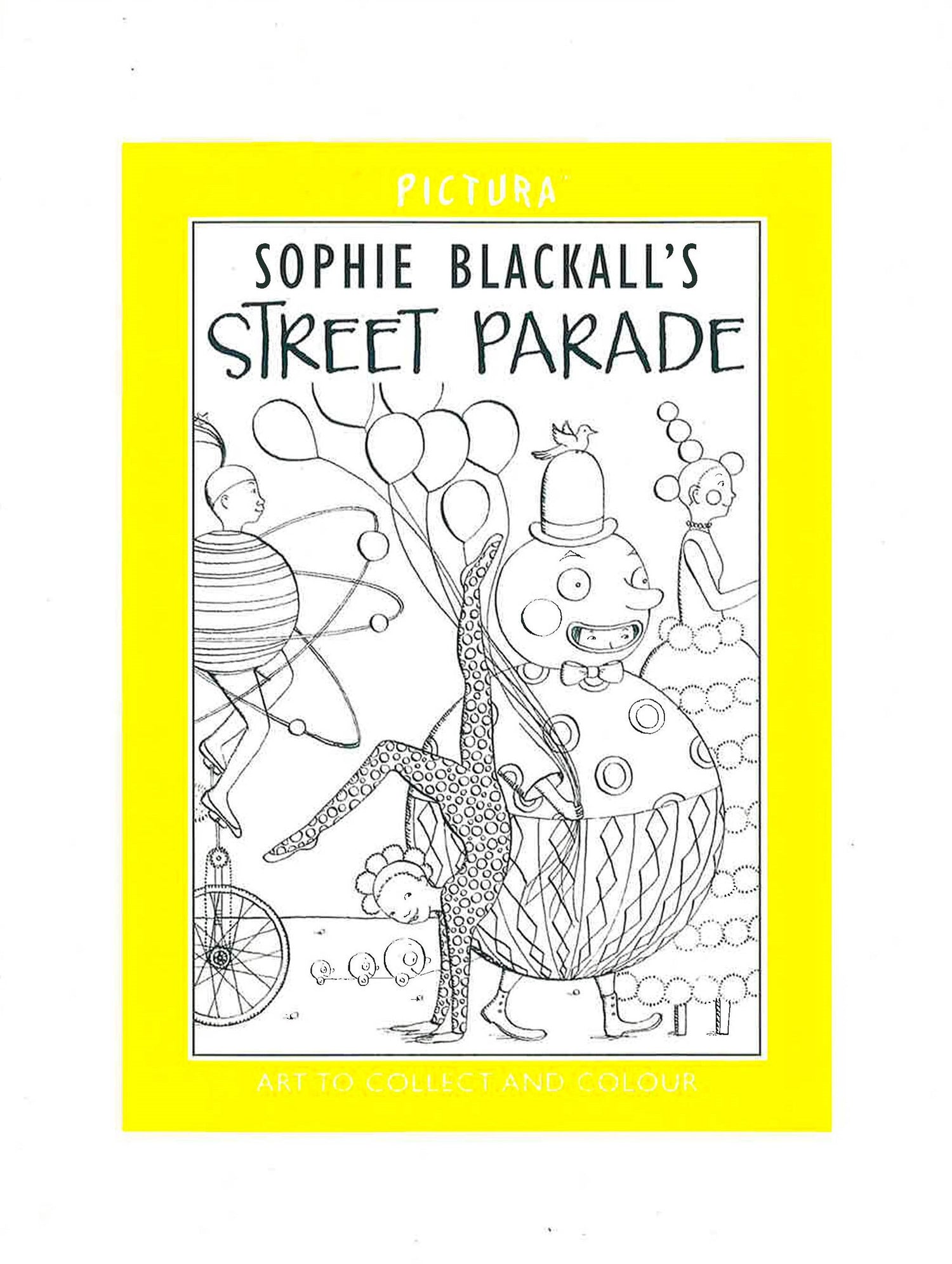 Pictura is a stunning range of black-and-white artworks to collect and colour for all ages. The Street Parade has come to town! In this riotous scene from Sophie Blackall, a procession of fantastical floats and incredible costumes are yours for the colouring. Includes acrobats, a mermaid travelling on a rock, a walking tree, musicians and a unicyclist dressed as a globe.