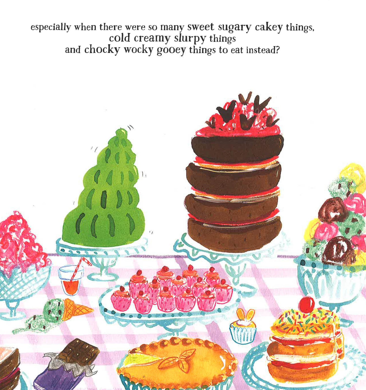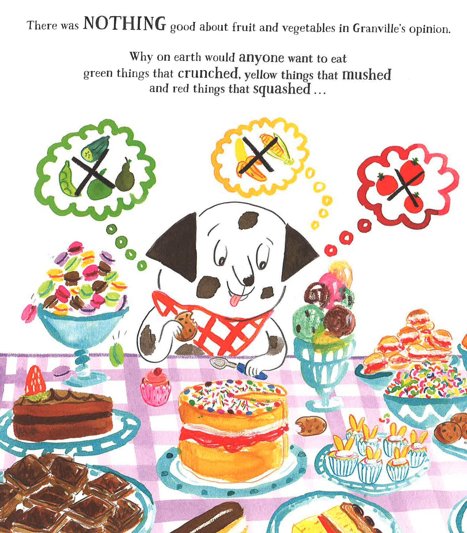 Granville the Dalmatian loves sweet, sugary, chocky wocky gooey things to eat. NOT fruit and vegetables. Which is a shame, because he comes from a long line of greengrocers and gardeners. So his family come up with a plan to persuade him to be passionate about parsnips and bonkers about broccoli. Only, Granville has a plan of his own – and it will surprise everyone!