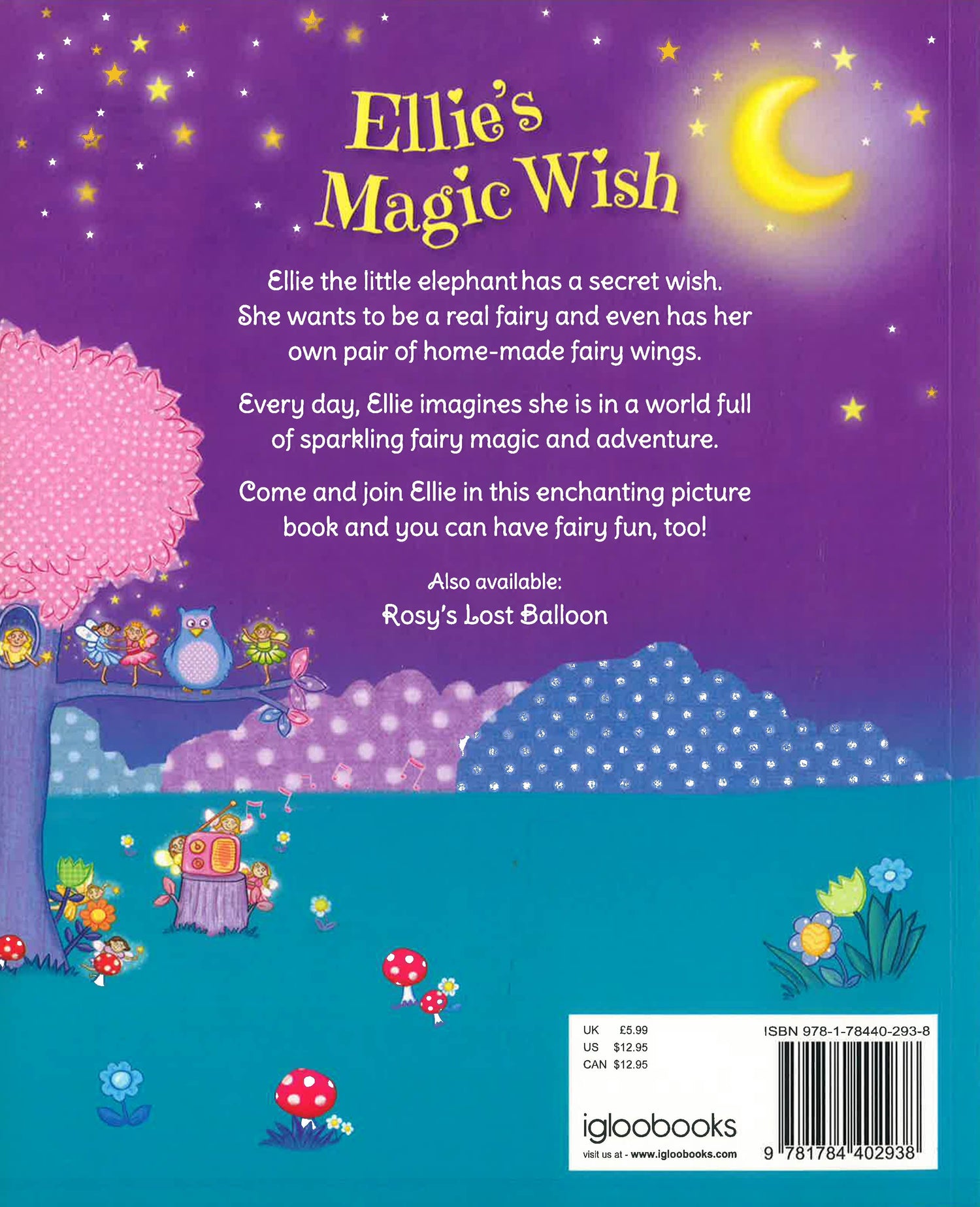 Ellie the little elephant has a secret wish. She wants to be a real fairy and even has her own pair of home-made fairy wings. Every day, Ellie imagines she is in a world full of sparkling fairy magic and adventure. Come and join Ellie in this enchanting picture book and you can have fairy fun,too!