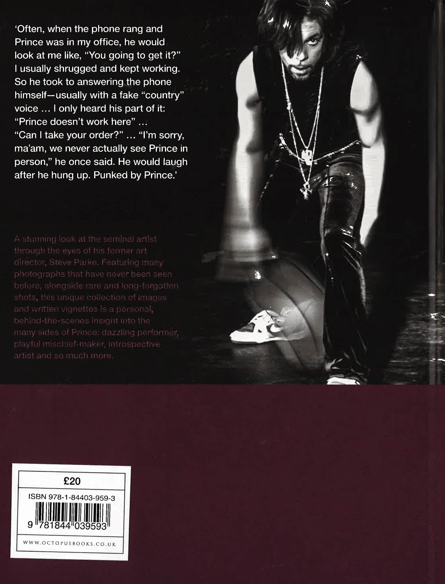 Alongside these remarkable images are fifty engaging, poignant and often funny written vignettes by Parke, which reveal the very human man behind the reclusive superstar: from shooting hoops to renting out movie theatres at 4am; from midnight requests for camels to meaningful conversations that shed light on Prince as a man and artist.