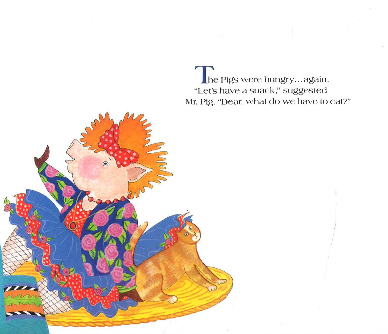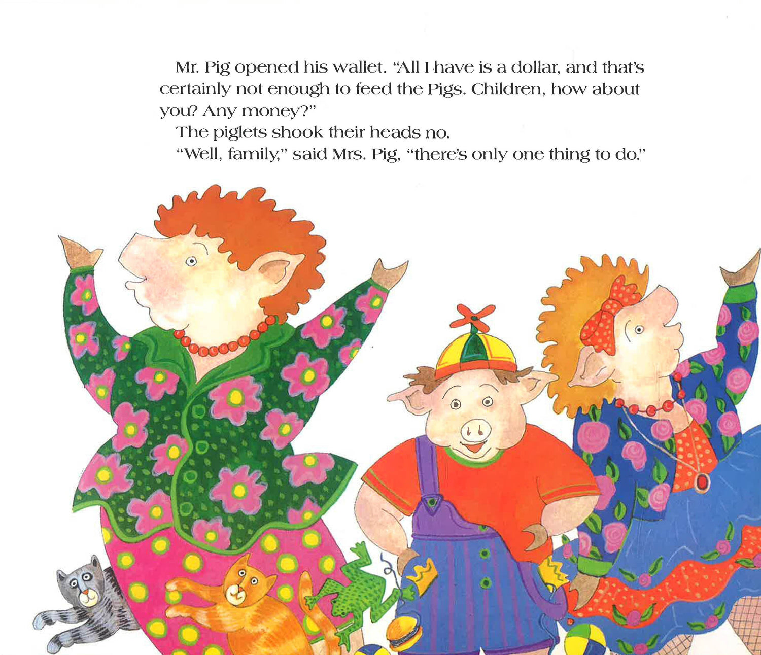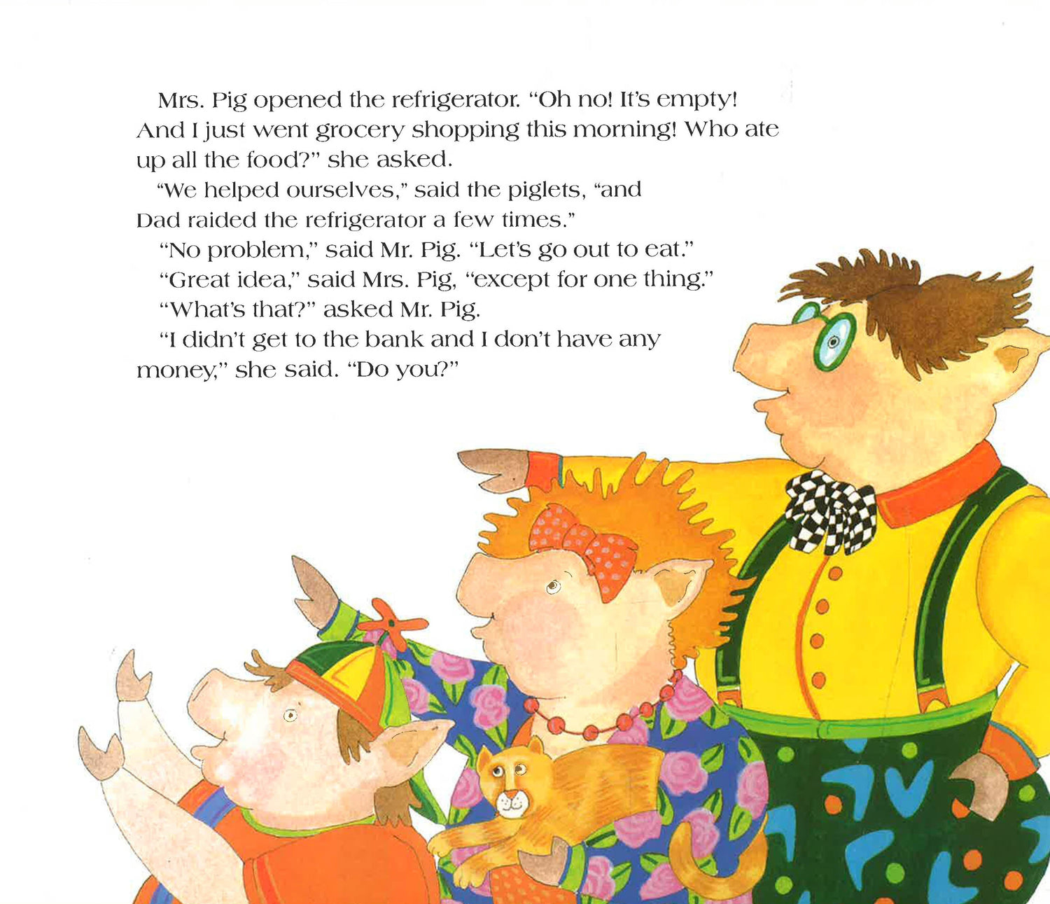 The pigs are very hungry, and there's no food in the house. Mr. Pig suggests eating out--but oh, no! The Pigs are out of money!