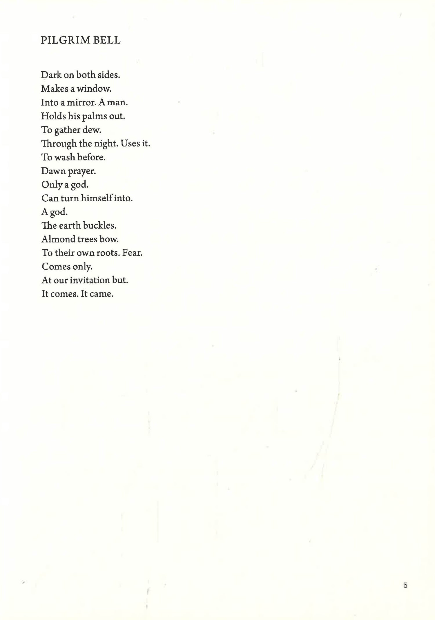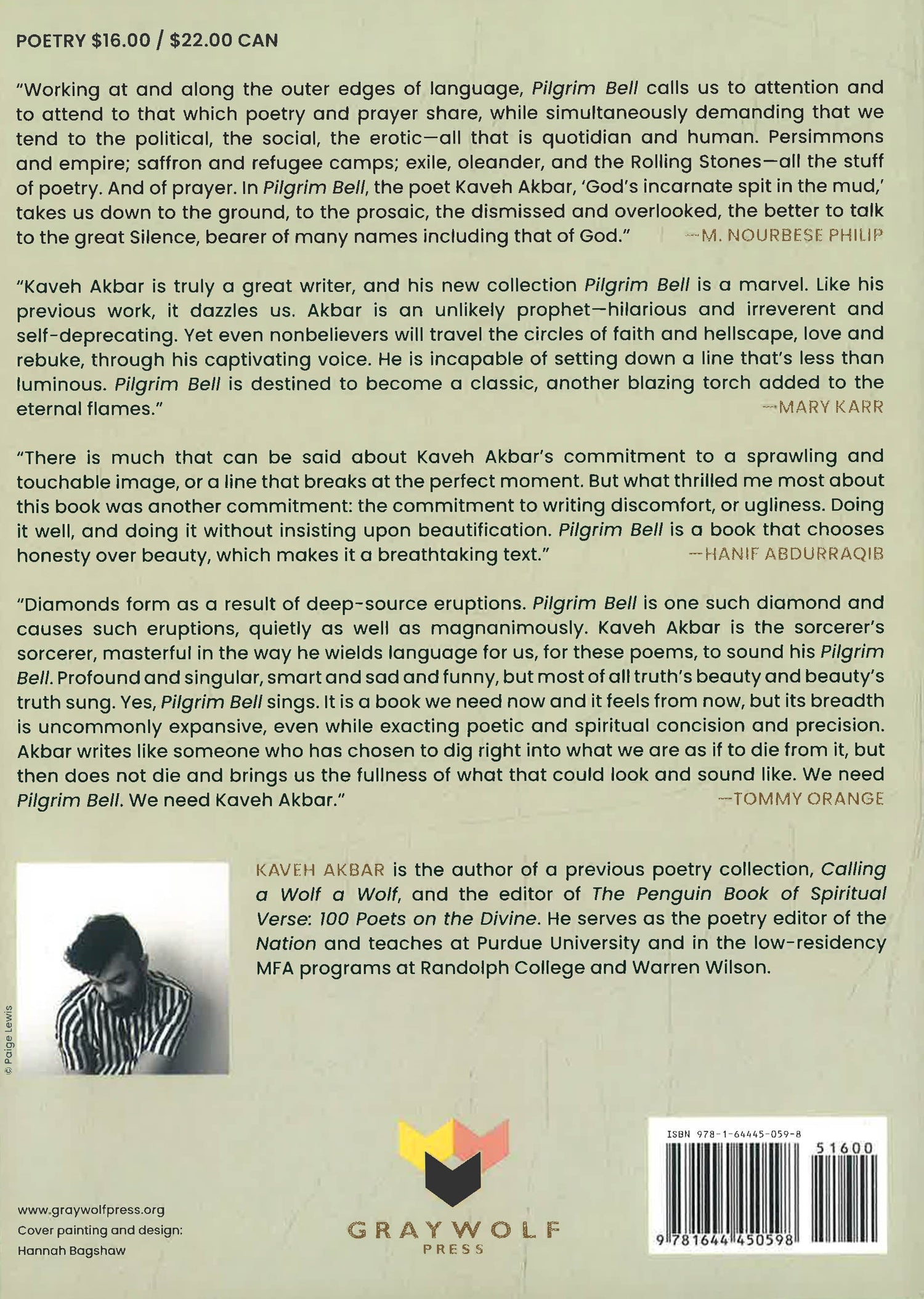 Richly crafted and generous, Pilgrim Bell's linguistic rigor is tuned to the register of this moment and any moment. As the swinging soul crashes into its limits, against the atrocities of the American empire, and through a profoundly human capacity for cruelty and grace, these brilliant poems dare to exist in the empty space where song lives--resonant, revelatory, and holy.