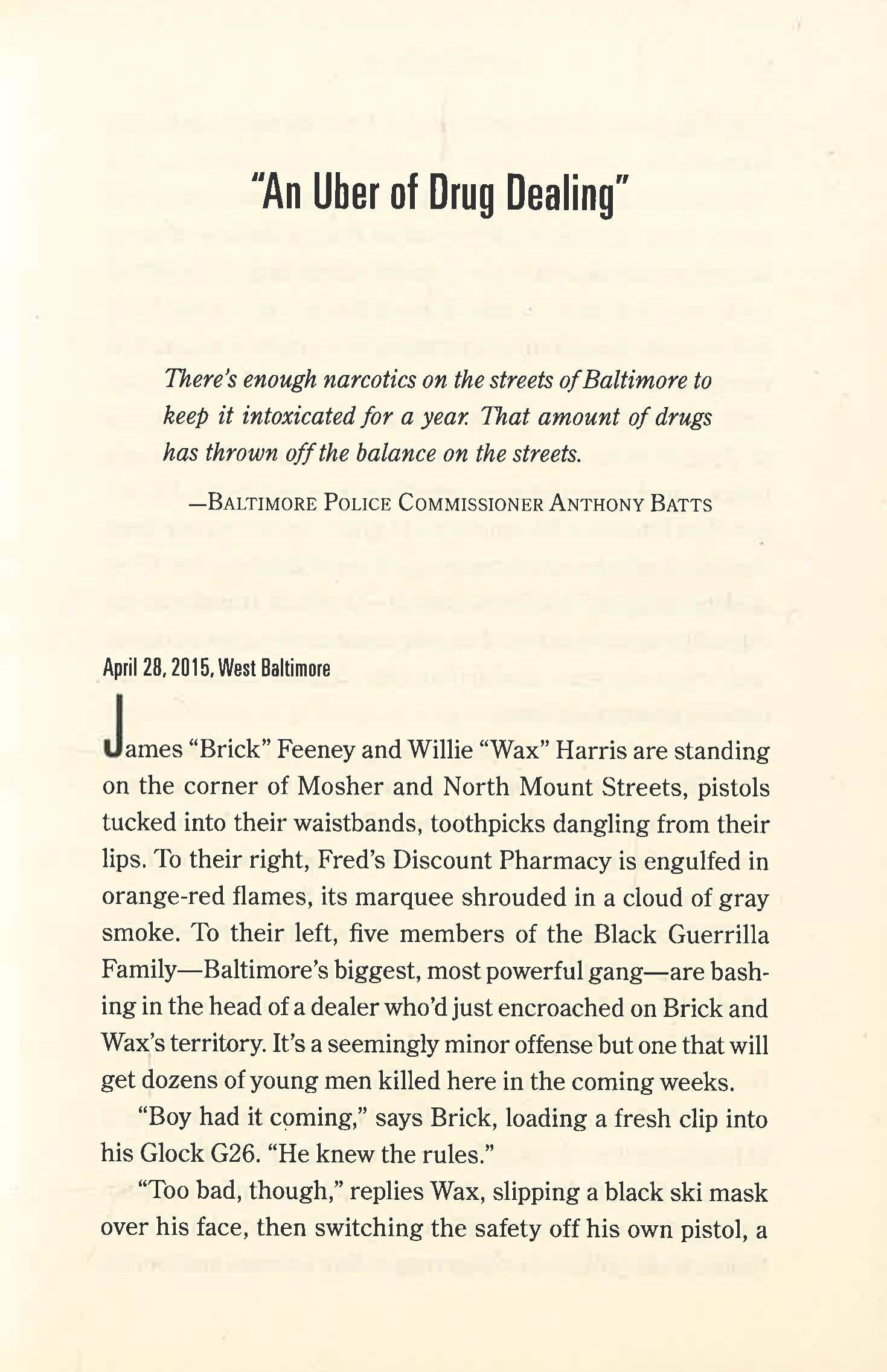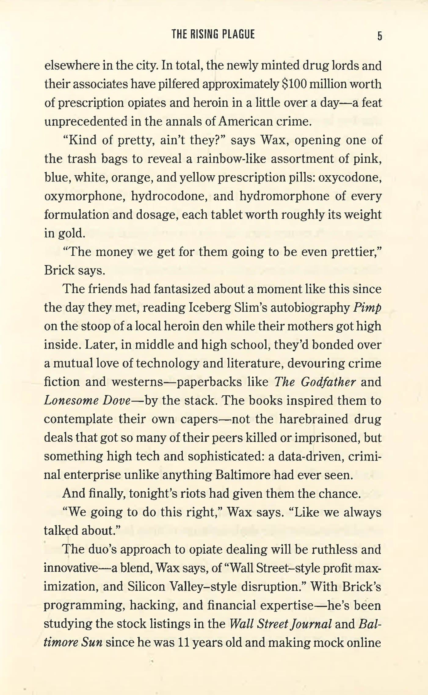 Meet Brick and Wax, two bright eighteen-year-olds looking for a route out of poverty. When Baltimore was engulfed in riots in 2015 they helped loot pharmacies, stealing over $100 million worth of opiates. The plan: to use their gang connections and programming skills to set up a high tech drug delivery service. The result: the teens became America's youngest drug lords, in the process sparking bloody gang warfare and a nationwide wave of addiction and murder. Now mixing in deadly circles, Brick and Wax soon found their own lives were on the line . . .