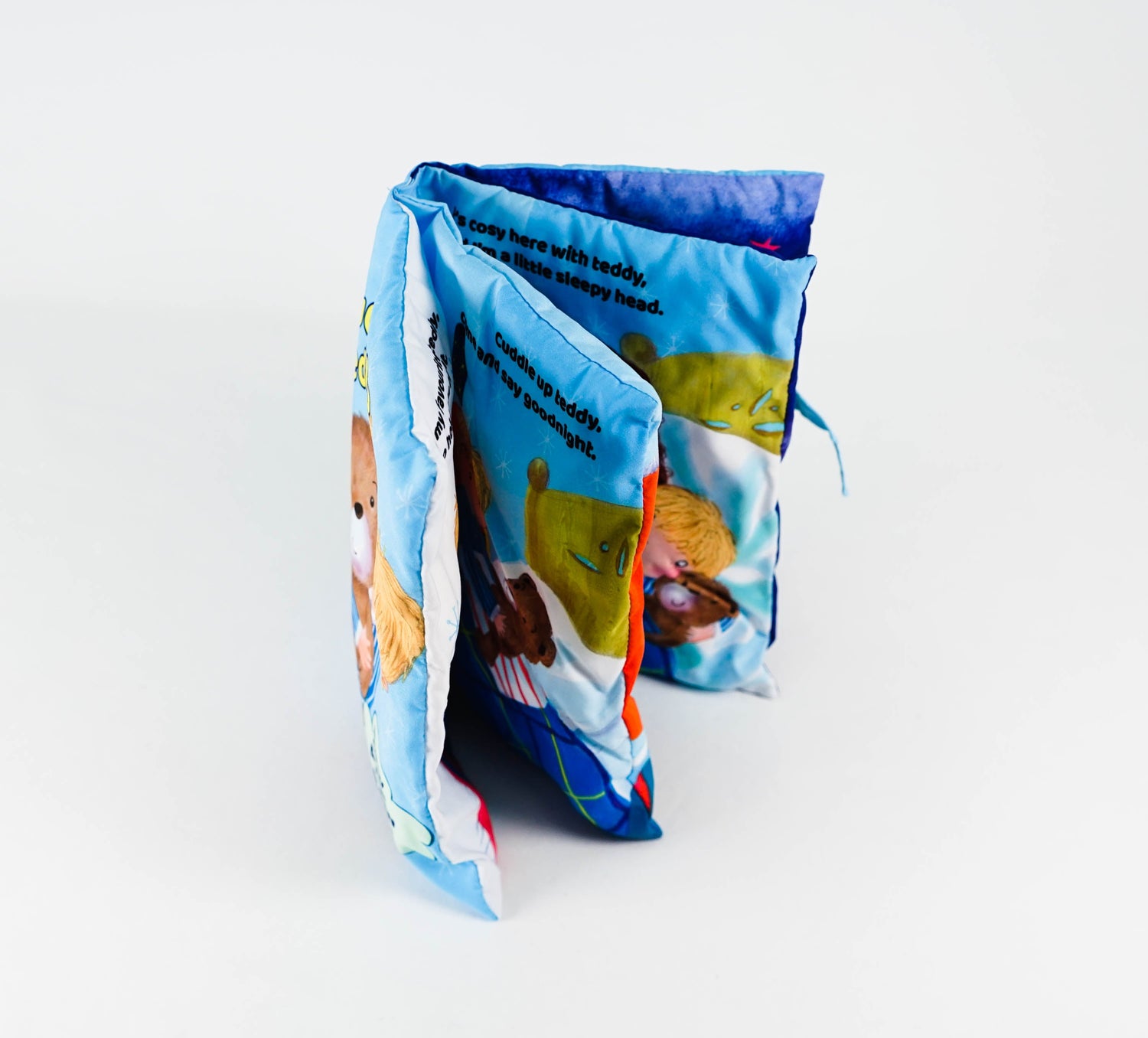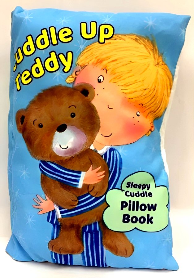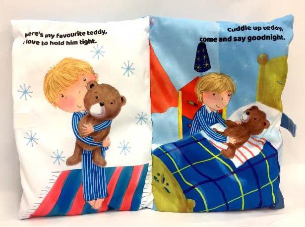 This unique book doubles as a pillow, making it perfect for travel, long days out and about, and of course bed time. Inside, soft pages tell the story of a little boy and his teddy getting ready for bed. Machine-washable. A velcro fastener keeps the book closed when it's not being used.