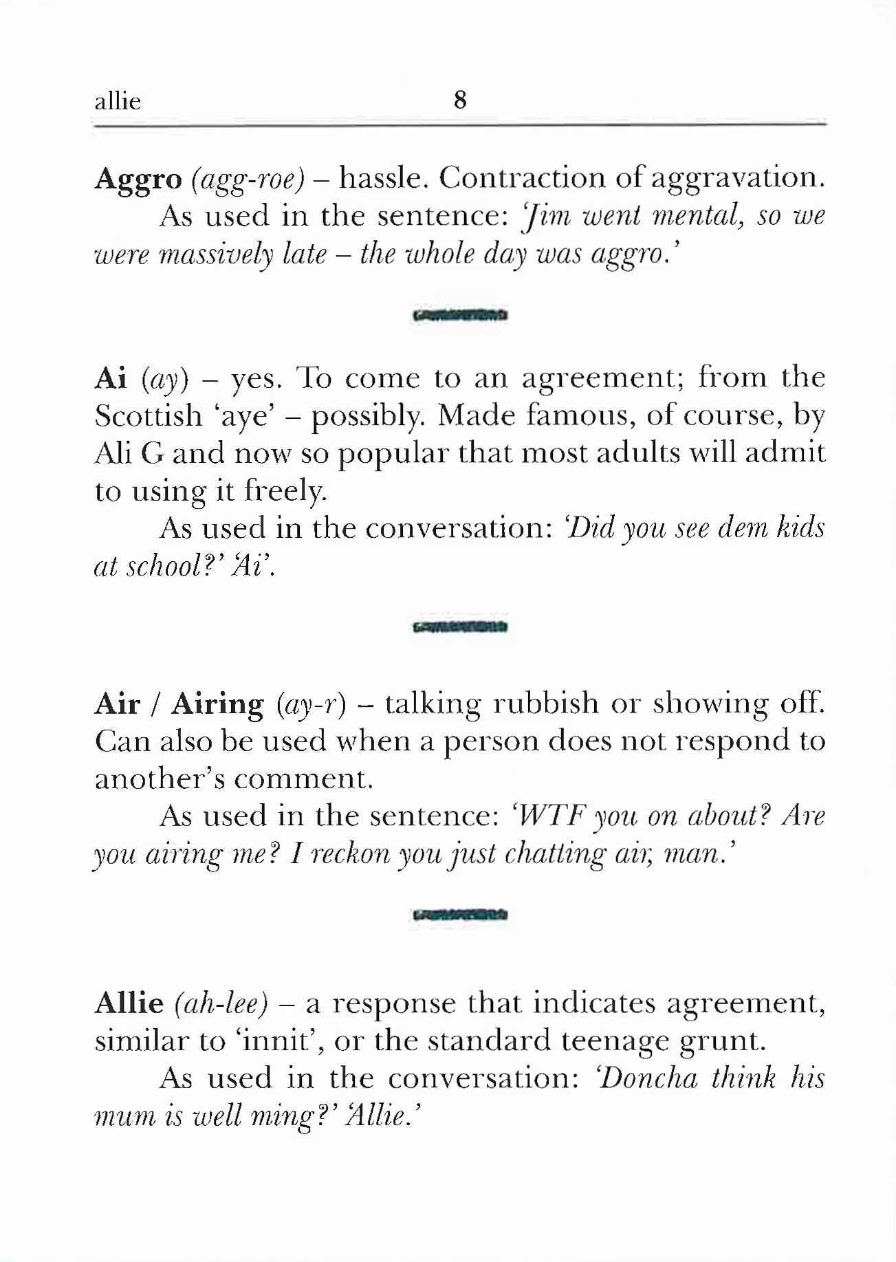 An old English proverb says 'he that converses not, know nothing' - but you might be forgiven for thinking that young people nowadays speak a completely different language from the English you were taught at school. A vast number of bewildering terms, with no apparent relevance to the rules of grammar or sense, have proliferated among 'the youth of today'. You might hear this strange new language on the back of the bus, in student bars across the land, and online - indeed, wherever teens chat breeze (make conversation) together. And how to decipher this cryptic talk? Unfortunately, a trawl through Webster's or the OED won't enlighten you as to what a milf is, things that are alternately sick and skankaroo, or what it means to get poked on Facebook. As for expletives, well, in the modern age the F-word is the most versatile part of speech around - a handy verb, adjective or noun. Pimp Your Vocab! is your insider's guide to making sense of Teenglish. To bridge the communication gap between teachers and students, parents and kids, here is a dictionary of the words du jour...standard.