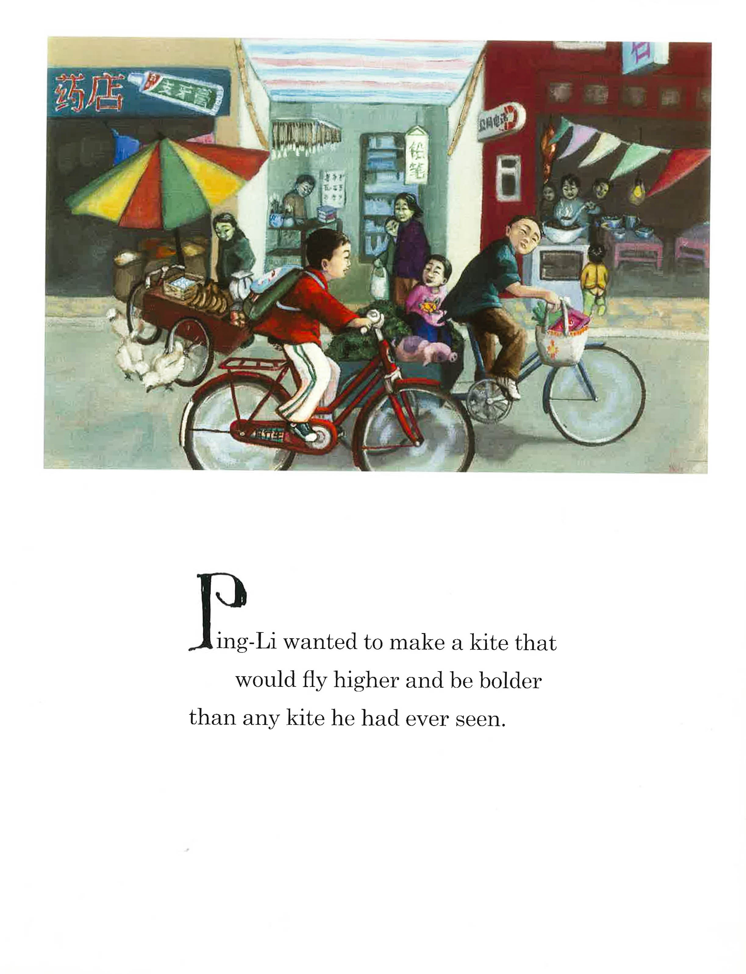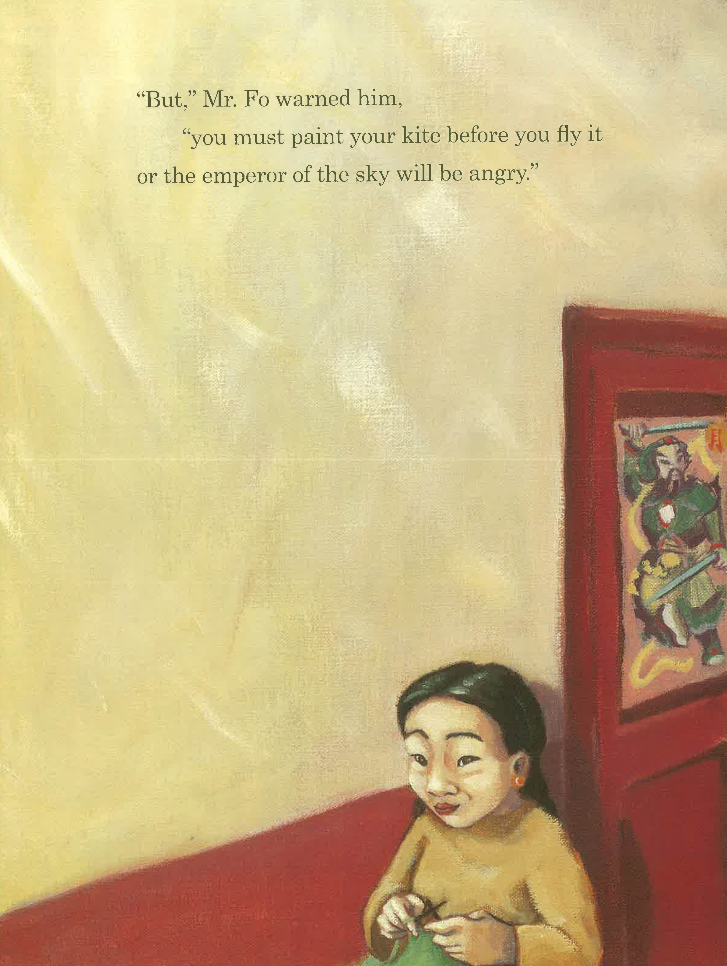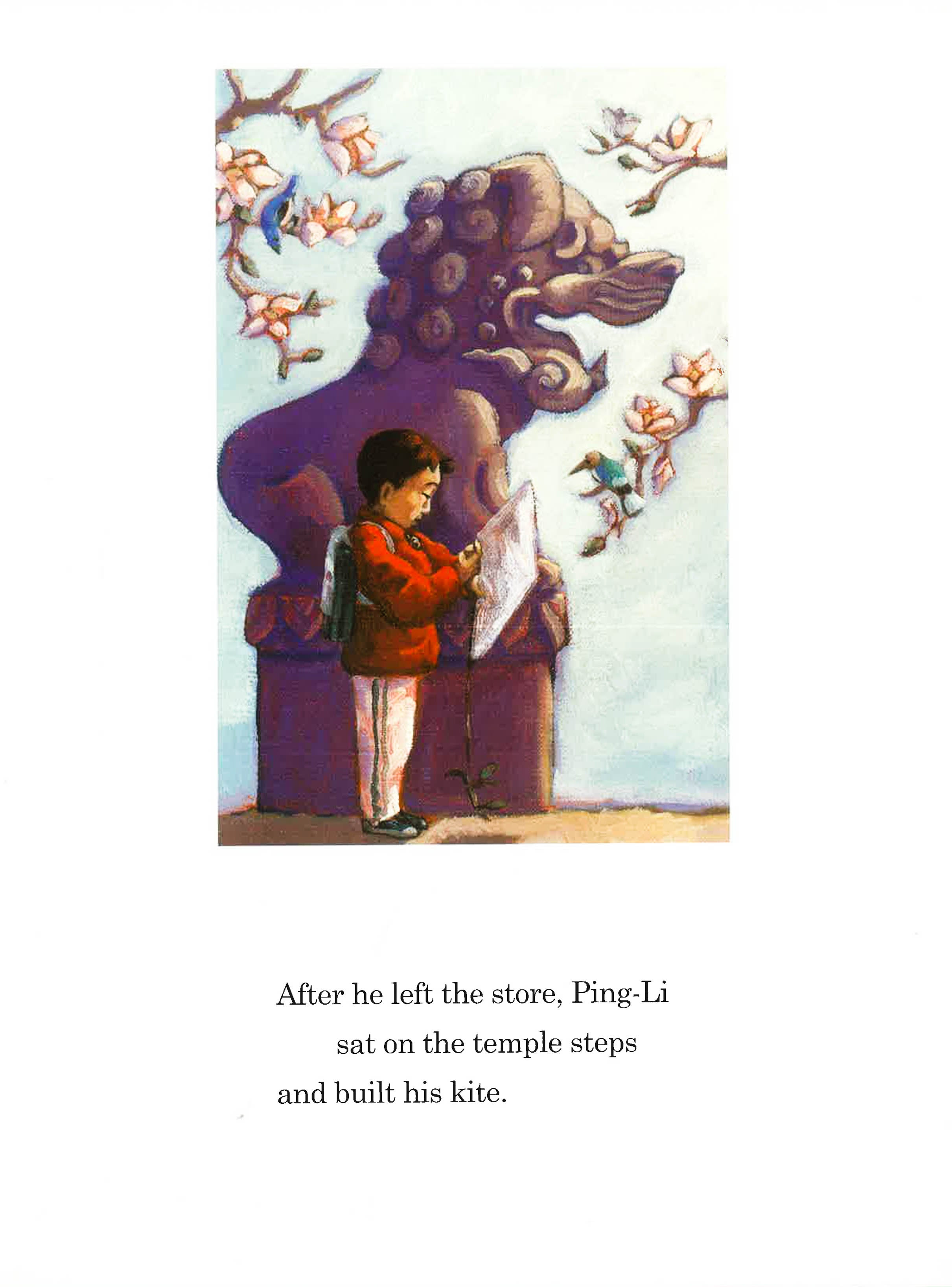 Ping-Li is riveted by the fantastical shapes that streak across the sky above a city park. He will make his own kite, he decides, and it will be better than all the rest. He goes to Mr. Fo to buy the supplies, and the man tells him that he must paint his kite -- or the emperor of the sky will be angry. But on the way home, the boy cannot resist flying his unpainted kite, and incurs the wrath of the emperor. Then Ping-Li's only recourse is to paint the most beautiful kite he can.