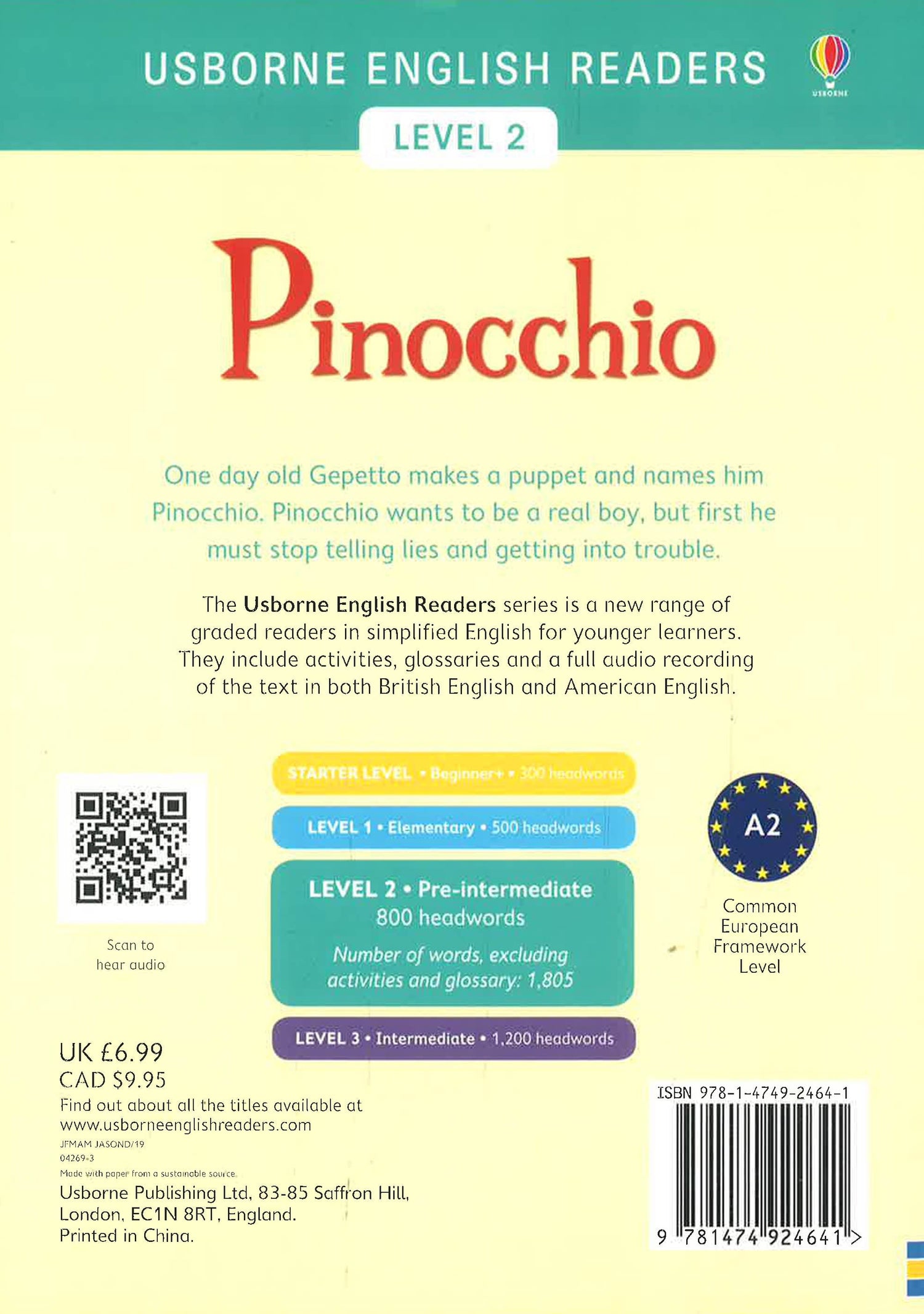 One day old Gepetto makes a puppet and names him Pinocchio. Pinocchio wants to be a real boy, but first he must stop telling lies and getting into trouble. Includes a word list, 5 pages of activities and free online audio (British English and American English). 800 headwords, 1,805 words