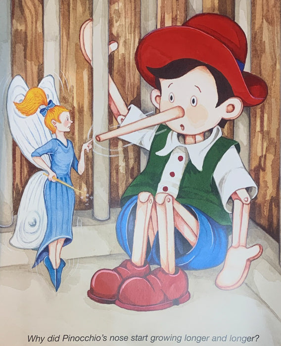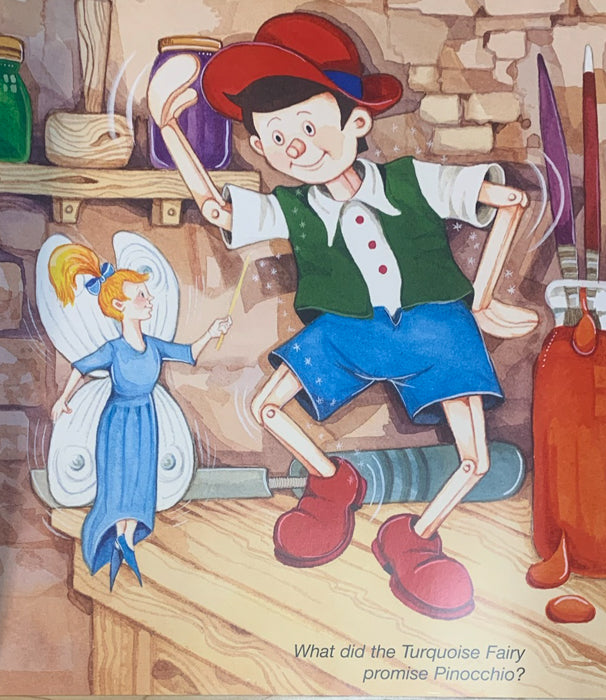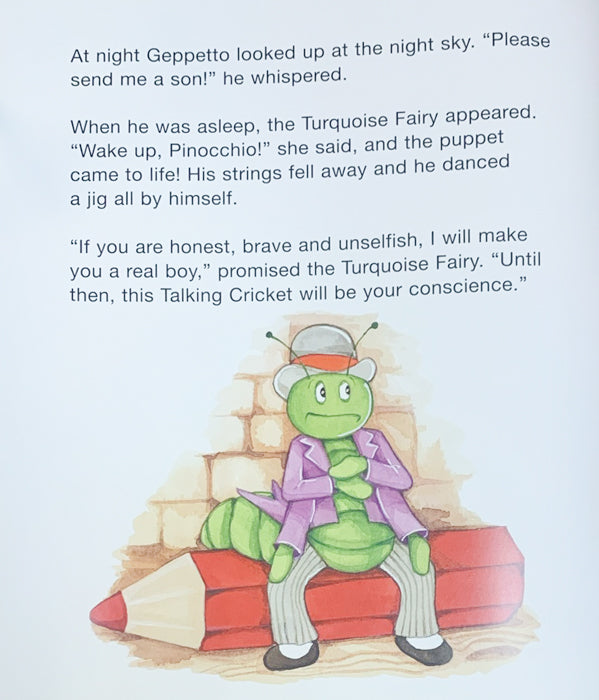 My First Reading Book. This is an illustrated first reading book in a large, fun format - ideal for use in show-and-tell. Janet Brown's fresh and lively storyline is designed to appeal to youngsters, with appropriate vocabulary for those who are learning to read by themselves. Interactive pages and an odd-one-out puzzle at the back of the book encourage literacy and observation. It is an enchanting retelling of a timeless fairy tale, with bright and imaginative paintings by Ken Morton. Gepetto the woodcarver longs to have a son. One day, he makes himself a wooden puppet in the shape of a boy, which he calls Pinocchio. That night, while Gepetto is sleeping, a fairy brings Pinocchio to life. He is still made from wood, but the fairy promises that he can become a boy if he remains honest, brave and unselfish. Will Pinocchio succeed...? This classic story is retold for a new generation. It is illustrated with engaging images throughout, and uses simple vocabulary and familiar language that children can easily follow and enjoy.