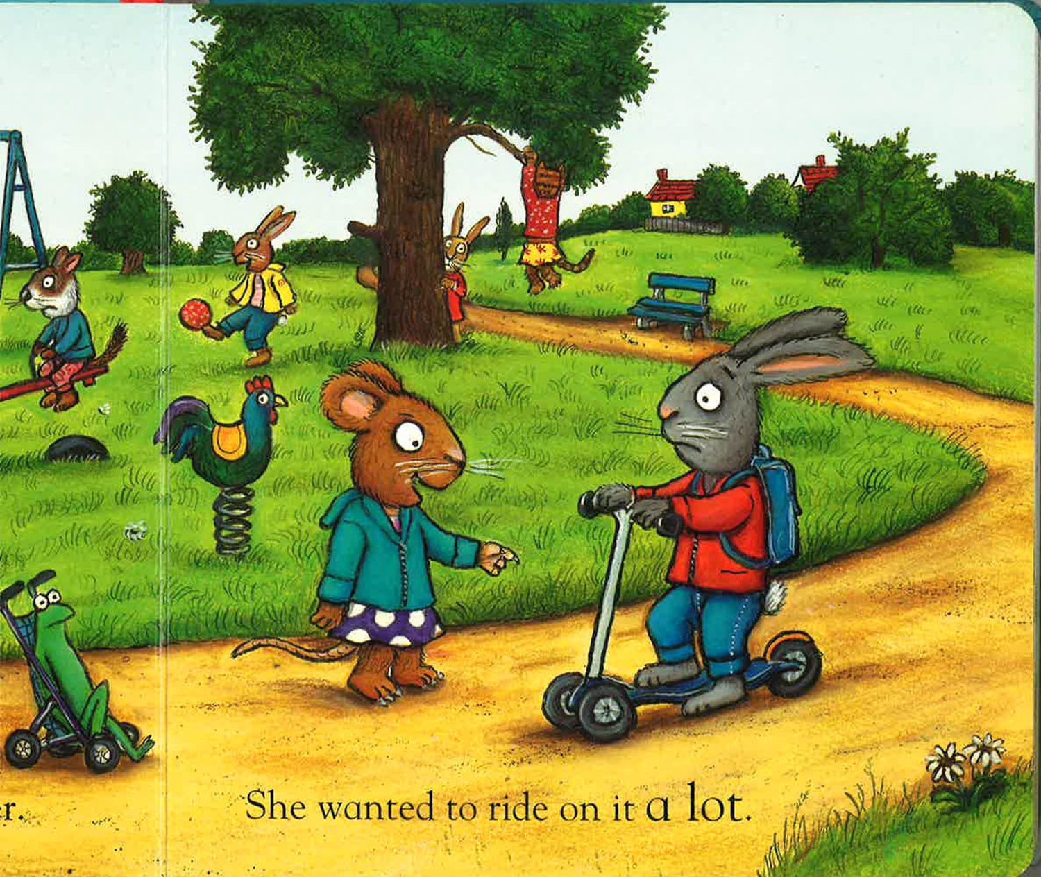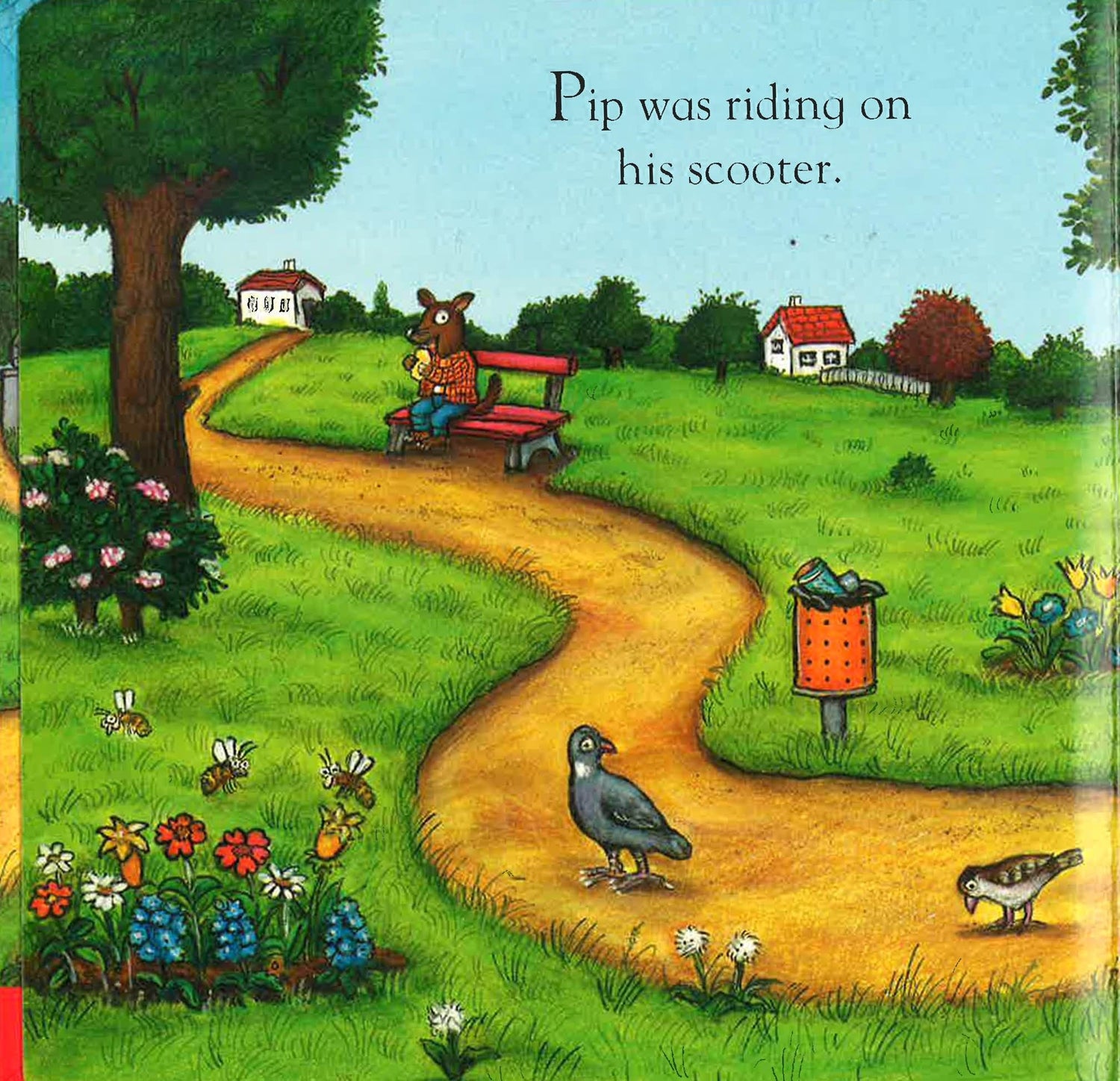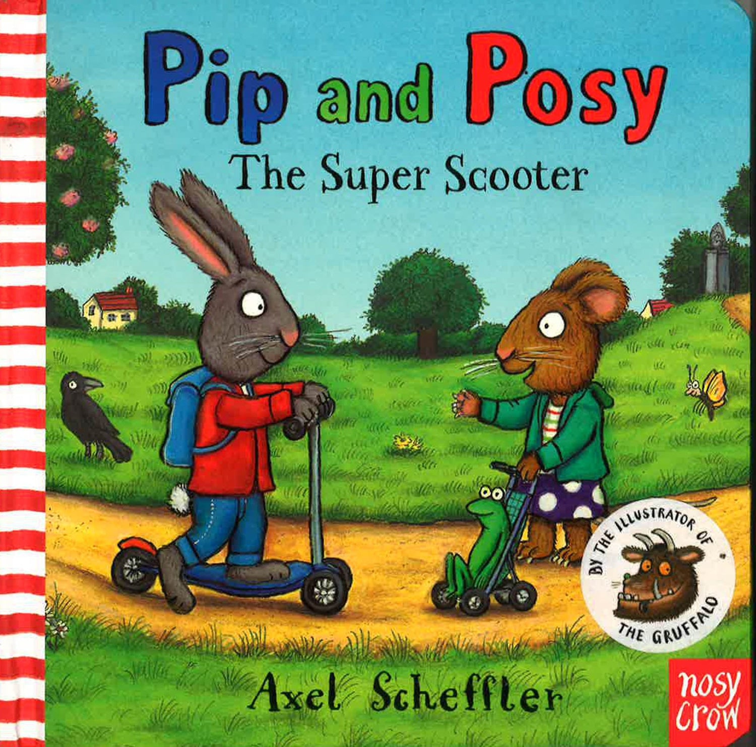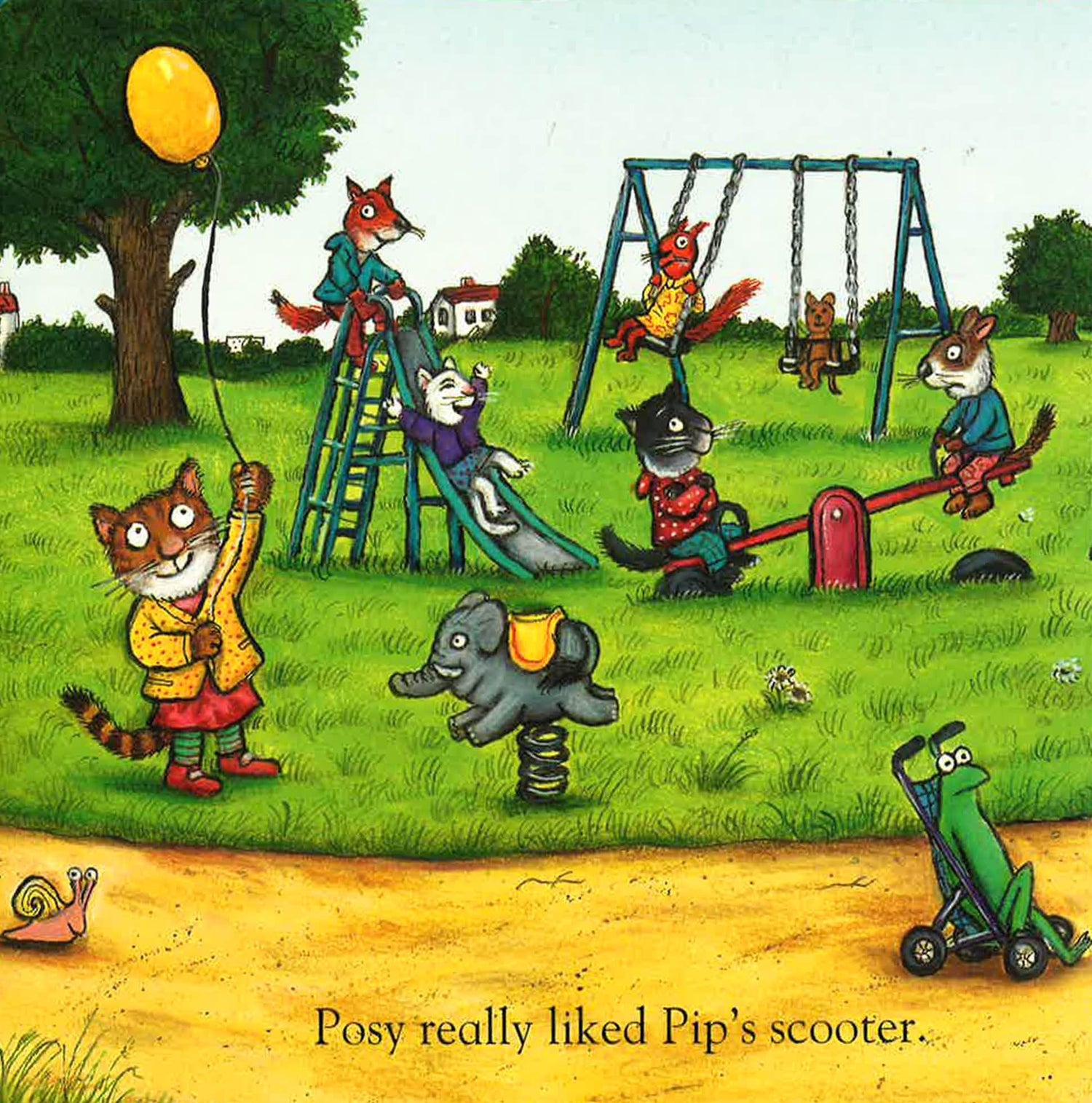 Pip and Posy are typical toddlers: they are best friends and they have fun... but sometimes, just like any other toddler, they get cross and sad, so sometimes it takes friendship, sharing and understanding - and a cuddle - to make things better. In Pip and Posy and the Super Scooter, Posy snatches Pip's scooter and tries to ride it, but she falls off and hurts her knee. Though Pip was very cross, he comes running to help her. Posy says sorry, and Pip forgives her before they all build a sandcastle in the sandpit where it's nice and soft.