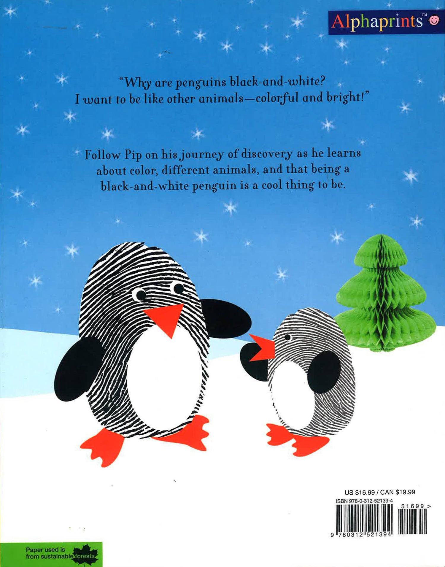 Pip is a little penguin with a big imagination! Dissatisfied with being black and white, he asks his dad why he can't be colorful, like orange orangutans, or pink flamingos, or red foxes. Through his discussion with his dad, follow Pip on his journey of discovery, meeting different animals and learning about color along the way, until he finally concludes (after meeting some pretty cool black-and-white creatures) that he's fine just as he is. This warm and humorous rhyming story combined with the very best Alphaprint characters make this second Alphaprint picture book a joy to share with young children.