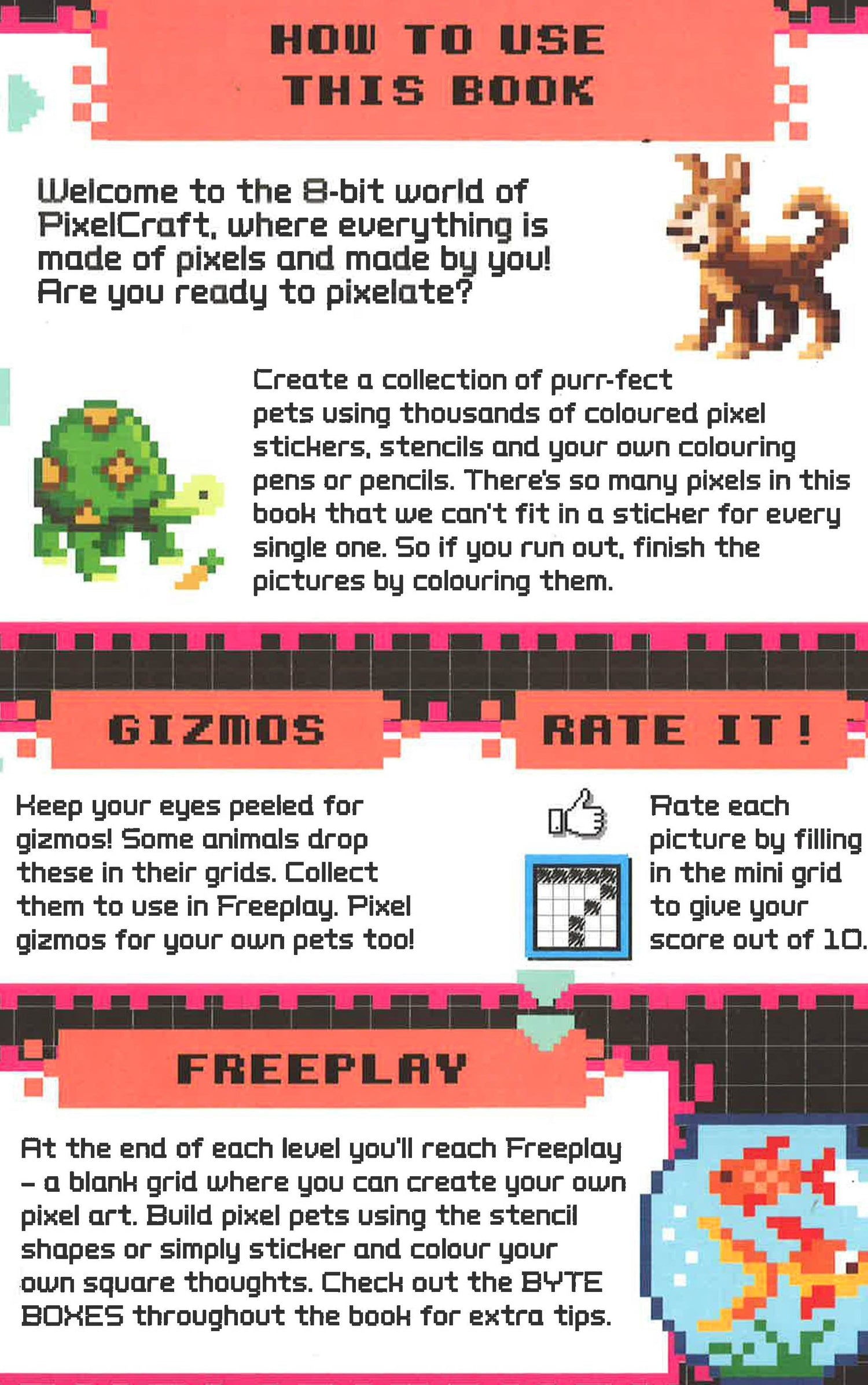 PixelCraft is a new range of sticker activity books that allow kids to build an 8-bit world with endless creative possibilities. Each book includes a card stencil sheet of characters, animals and objects, and more than 3000 colour brick stickers. Copy and build pixel images with stickers, colour in cube-y people and use the stencils to fill in scenes. Plus, there are blank gridded pages for readers to build their own works of Pixelcraft. Create a collection of purr-fect pets in 'PixelCraft Pet Shop' and see if you can make it from Level 1: Basic Builder to Level 5: Pixel Pro. Add your pixel stickers to a friendly golden retriever, create a fluffy guinea pig by colouring in the squares and create a picture of a colourful parrot by precise pixelling.