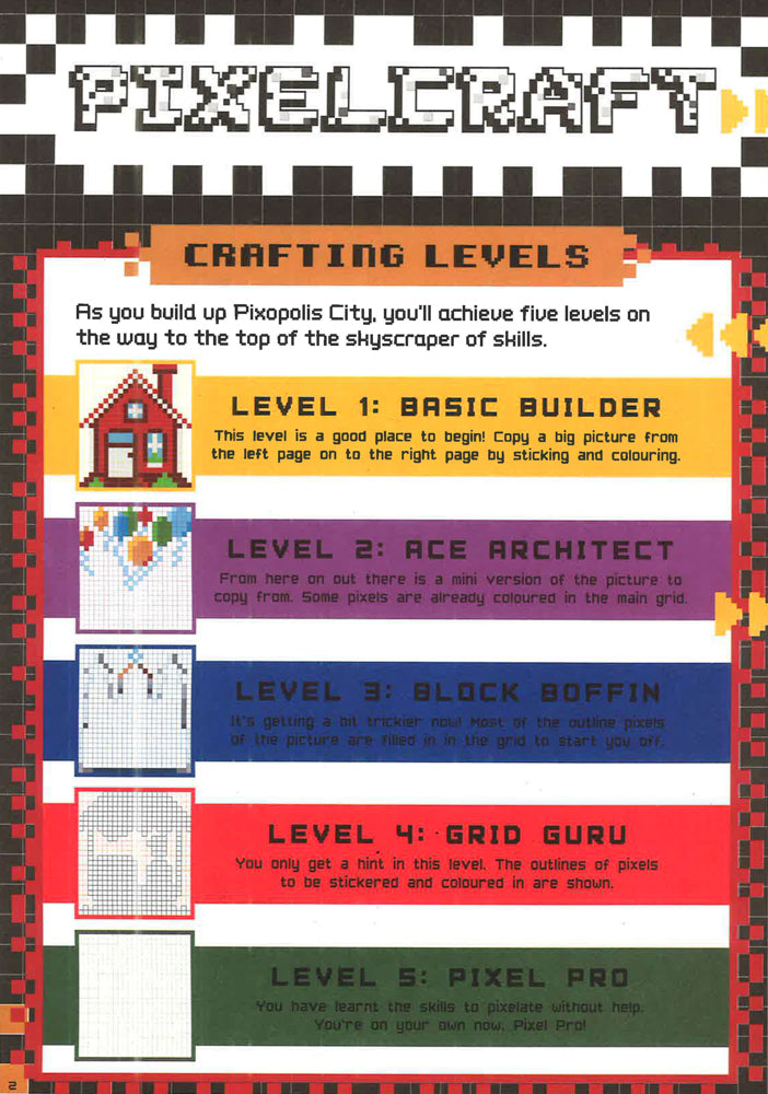 PixelCraft is a new range of sticker activity books that allow kids to build an 8-bit world with endless creative possibilities. Each book includes a card stencil sheet of characters, animals and objects, and more than 3000 colour brick stickers. Copy and build pixel images with stickers, colour in cube-y people and use the stencils to fill in scenes. Plus, there are blank gridded pages for readers to build their own works of Pixelcraft. Help build the city of Pixopolis in 'PixelCraft City' and see if you can make it from Level 1: Basic Builder to Level 5: Pixel Pro. From Pixopolian resident Melvin's blocky house to the ruined castle belonging to the Royal Family of Pixelania, the Pixopolian's need your help to build their city!
