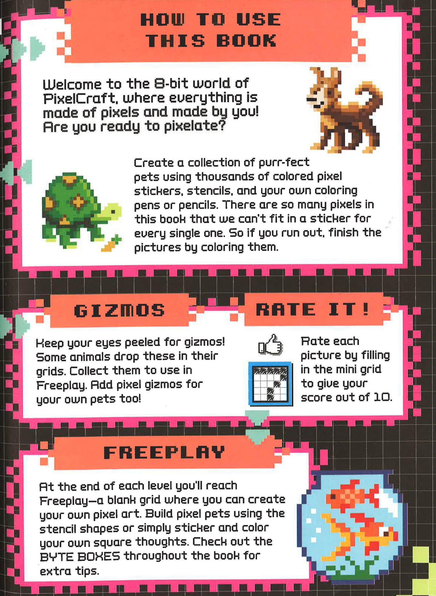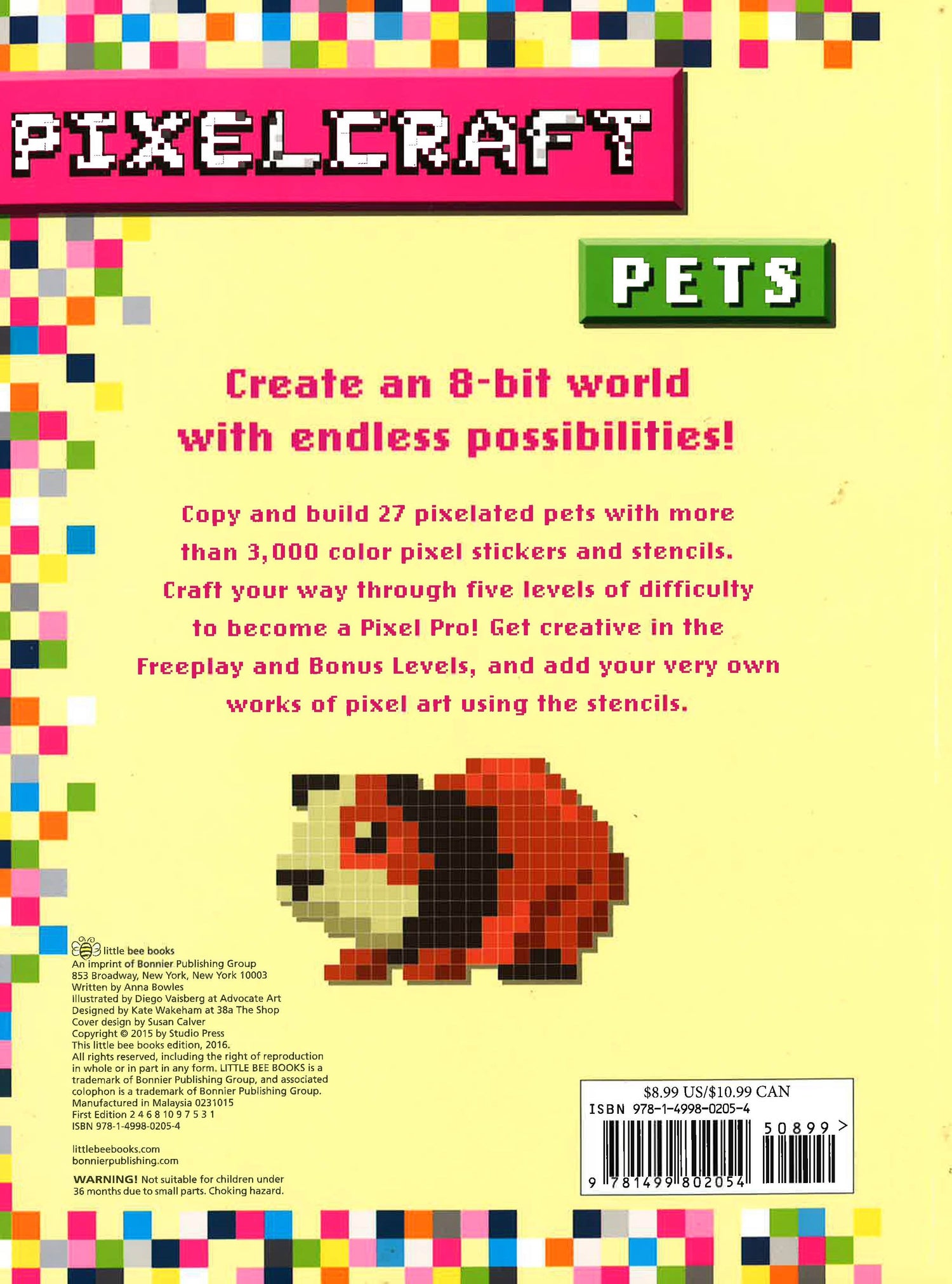 Build an 8-bit world in this sticker and activity book that's perfect for Minecraft fans! PixelCraft is a new brand of sticker and activity books that allows kids to build an 8-bit world with endless creative possibilities. Pets includes a stencil sheet of adorable animals such as cats, dogs, rabbits, insects, guinea pigs, fish, ponies, and more than 3,000 colorful, pixel-shaped stickers. Kids can copy and create pixel images with the stickers and use the stencils to fill in the scenes or use blank grid pages to build their own PixelCraft worlds from scratch.