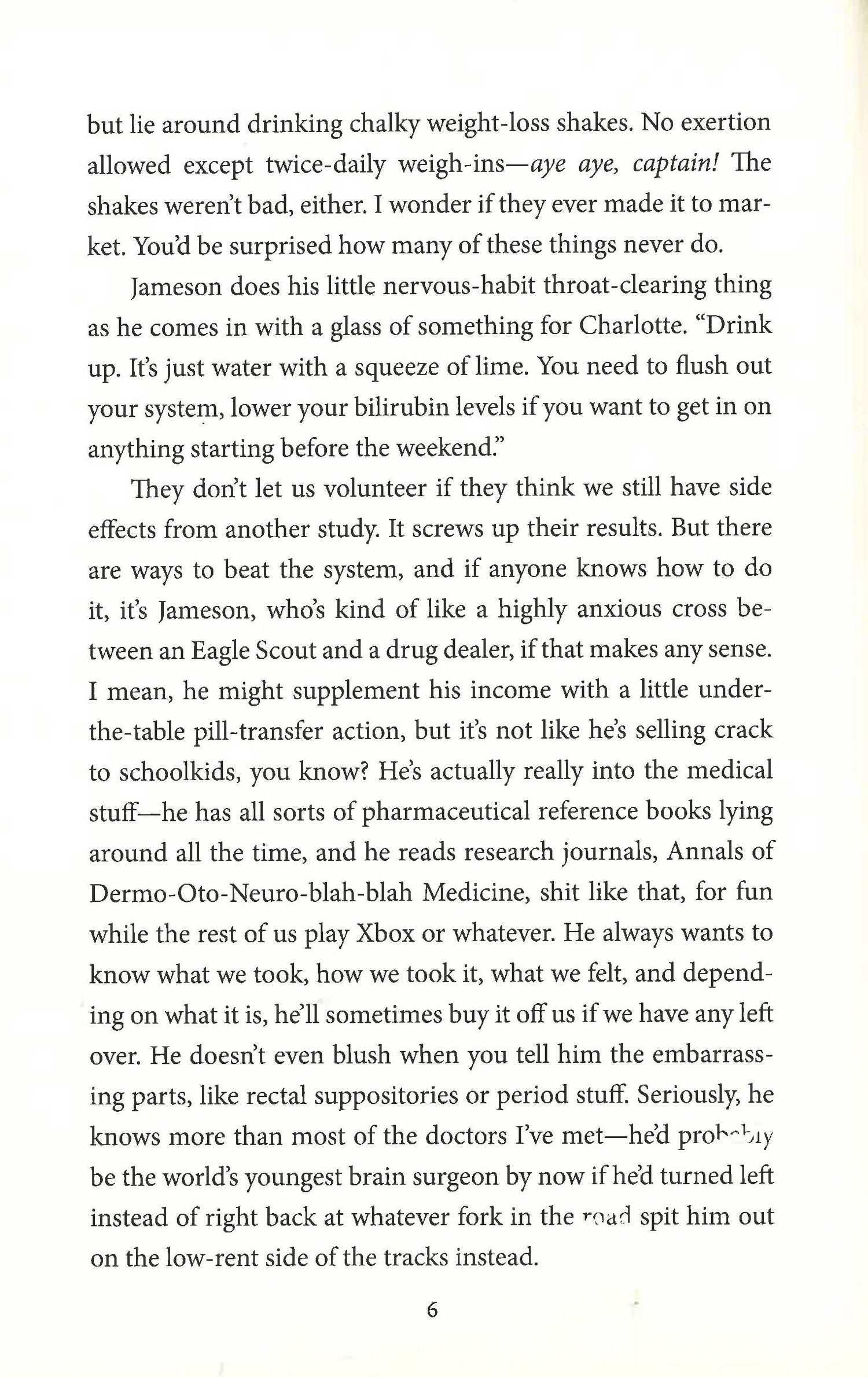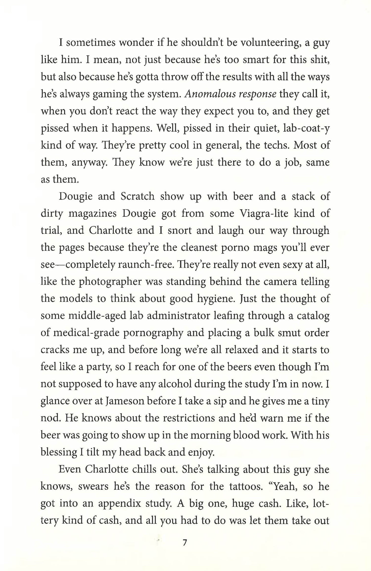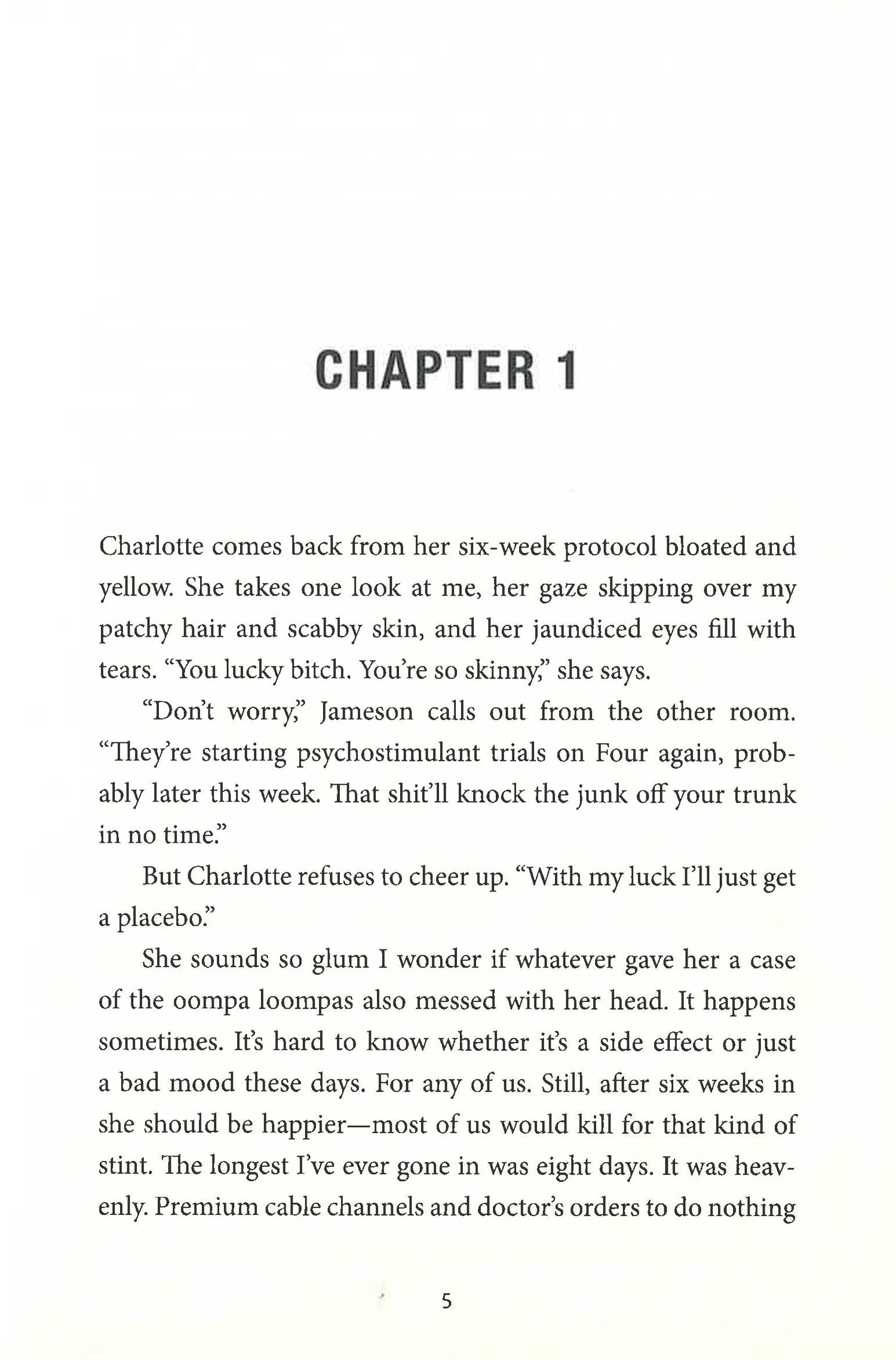 Going Bovine" meets "Trainspotting" in this gritty portrait of at-risk teens gaming the prescription drug trial system. Meet Audie: Professional lab rat. Guinea pig. Serial human test subject. For Audie and her friends, volunteering for pharmaceutical drug trials means a quick fix and easy cash. Sure, there s the occasional nasty side effect, but Audie s got things under control. If Monday s pill causes a rash, Tuesday s ointment usually clears it right up. Wednesday s injection soothes the sting from Tuesday s cure, and Thursday s procedure makes her forget all about Wednesday s headache. By the time Friday rolls around, there s plenty of cash in hand and perhaps even a slot in a government-funded psilocybin study, because WEEKEND! But the best fix of all is her boyfriend, Dylan, whose terminal illness just makes them even more compatible. He s turning eighteen soon, so Audie is saving up to make it an unforgettable birthday. That means more drug trials than ever before, but Dylan is worth it. No pain, no gain, Audie tells herself as the pills wear away at her body and mind. "No pain, no gain," she repeats as her grip on reality starts to slide. . . . Raw and irreverent, "Placebo Junkies" will captivate readers until the very end, when author J. C. Carleson leans in for a final twist of the knife. *This book may have remainder mark*