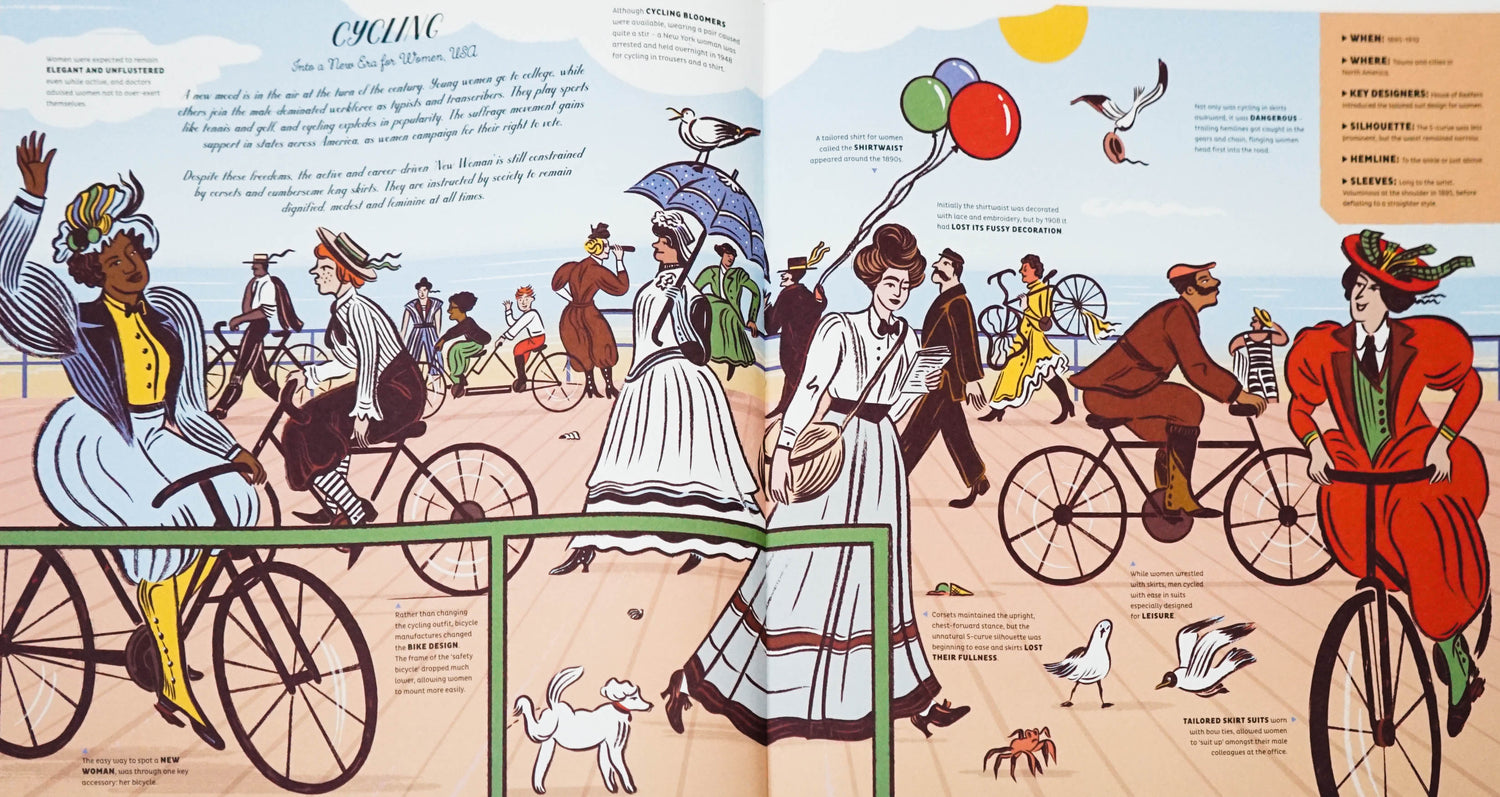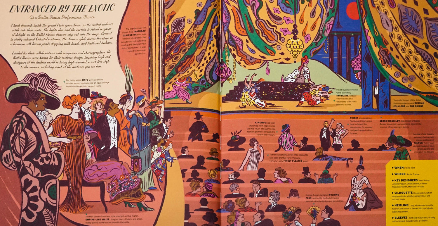 Hold onto your hats and lace up your boots; we're off on a fashion adventure! Travel through 25 scenes in fashion history, circling the globe with your two young stylish travel companions - one boy and one girl, dressed the part in every picture. Each lavishly illustrated scene captures the mood and style of a unique time and place, accompanied by a trove of fashion history facts. Your journey begins over one hundred years ago, twirling around the ballroom in gowns and tailcoats. Travel on to dress up in Oriental silks to see a performance of the Ballet Russes, shimmy down in the flapper fashion of the Harlem Renaissance, fling your feather boa as you schmooze with movies stars on the Hollywood red carpet and glue your hair into spikes as a London punk in this celebration of fashion and culture. Each vibrant, style-defining setting shows an array of characters showing off the distinguishing fashions of the time. Captions point out key fashion features, accessories and cultural influences - like the cycling bloomers of the active and career-driven New Woman at the start of the twentieth century, the morale-boosting felt hats worn during the Second World War and the plastic sunglasses inspired by space goggles from the Space Race era. Fact boxes give the time, place, key designers, and trends in silhouettes, hemlines, and sleeves for each fashion scene. Use the timelines at the back to see how historical events intersect with the evolution of fashion. One timeline summarizes the formative events of the twentieth century and three others highlight trends in shoes, hats and bags. A Can You Find? page gives you motivation to study the scenes even more closely. Can you find a waiter dropping his tray of coffee on the streets of Paris? And a pair of roller skates at the dazzling disco jam? From Bollywood to Hollwood, suburban Canada to the French Riviera - embark on a voyage of discovery. A century of inspiring style awaits...