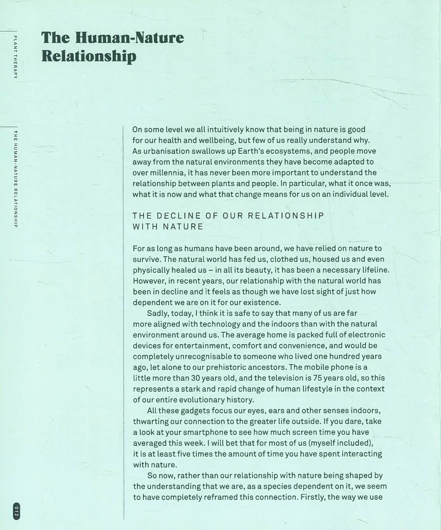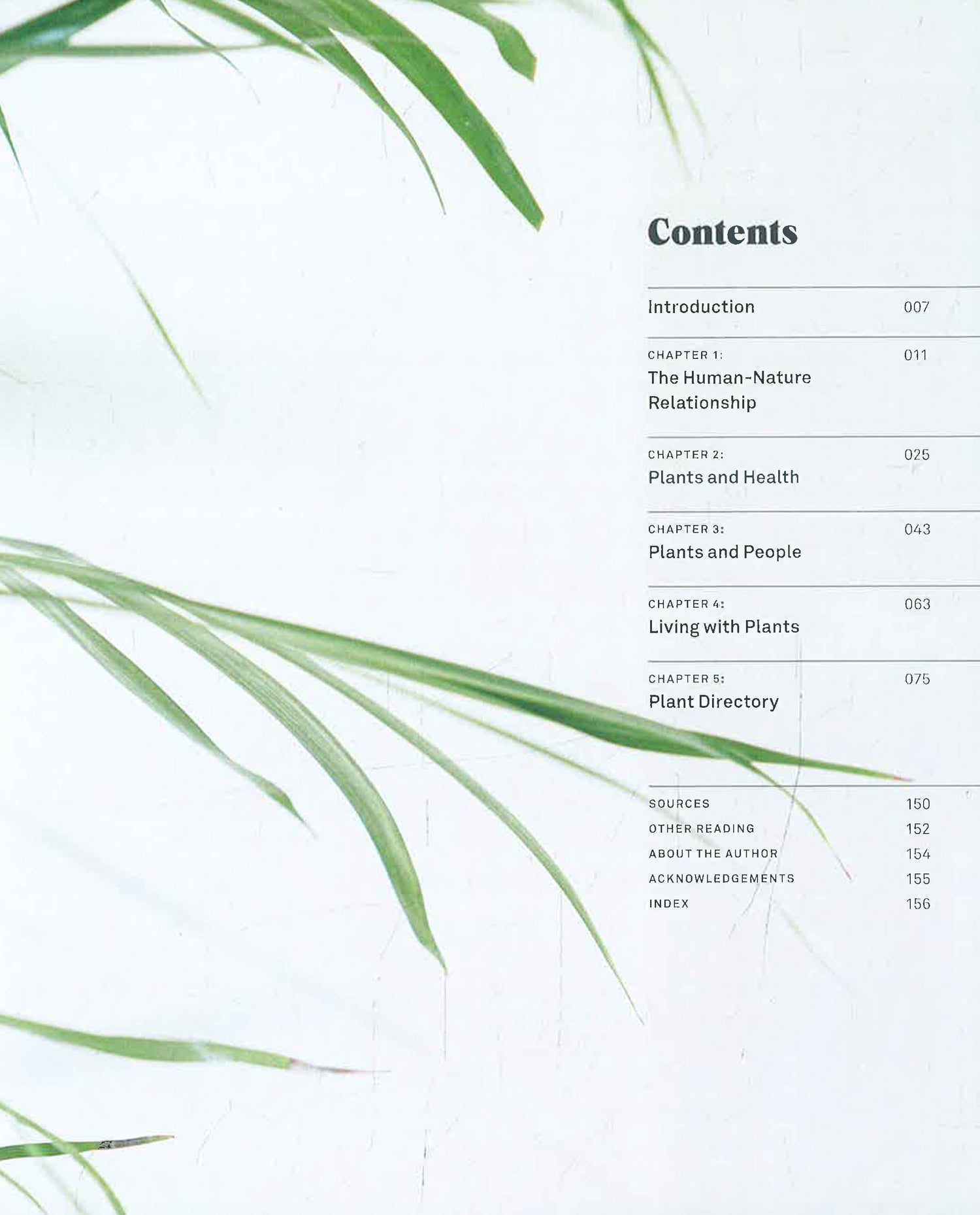 Broken down into three chapters: The Human-Nature Relationship, Living with Plants and an informative 'Plantopedia', the book first explains how we have come to exist in an environment that is at odds with our mental, emotional and physical needs, then explores how we can readjust this balance, before showcasing plants that help us to breathe, restore balance, and boost our wellbeing.