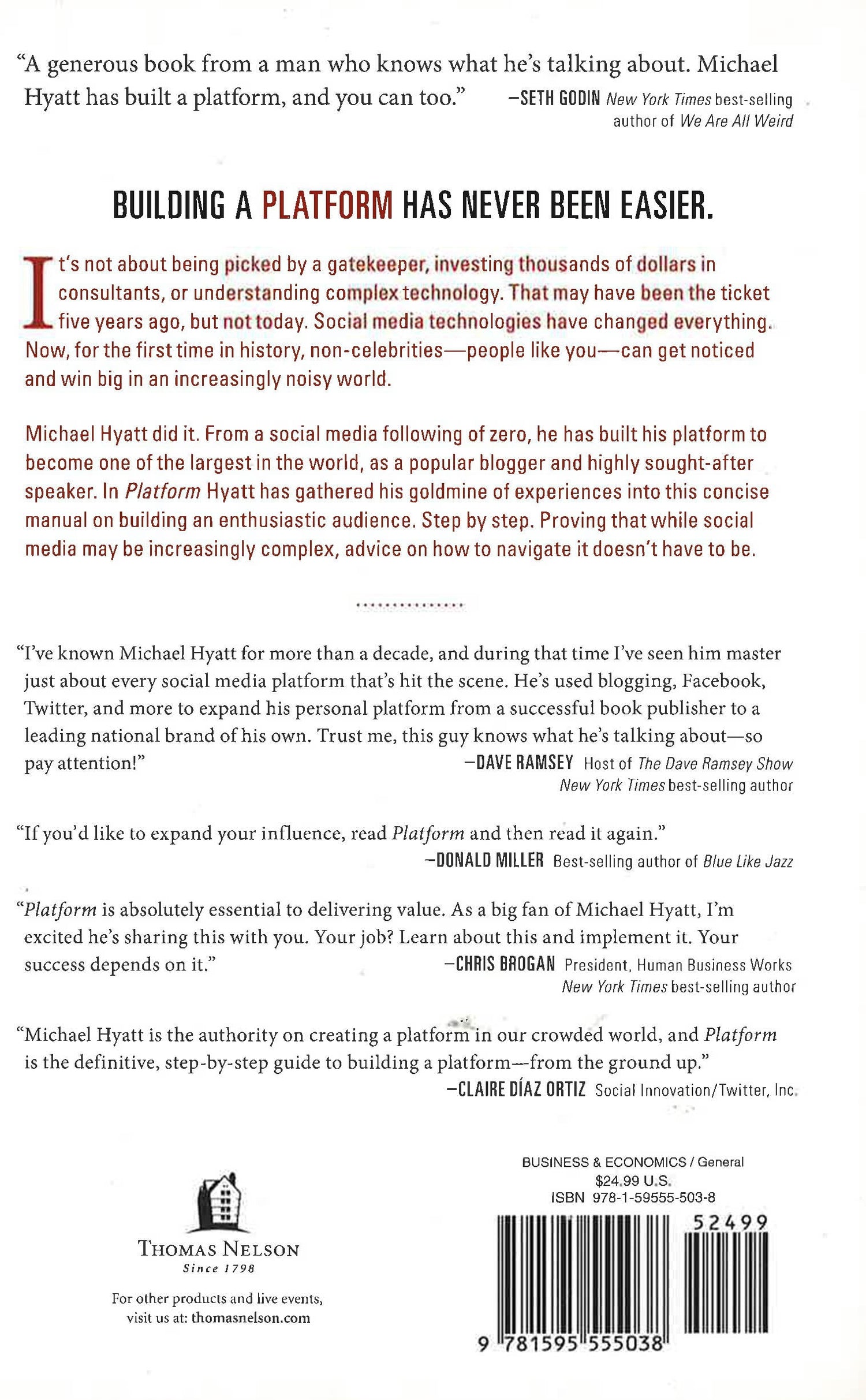 Michael Hyatt, one of the top business bloggers in the world, provides down-to-earth guidance for building and expanding a powerful platform. To be successful in the market today, you must possess two strategic assets: a compelling product and a meaningful platform. In this step-by-step guide, Michael Hyatt, former CEO and current Chairman of Thomas Nelson Publishers, takes readers behind the scenes, into the new world of social media success. He shows you what best-selling authors, public speakers, entrepreneurs, musicians, and other creatives are doing differently to win customers in today's crowded marketplace. Hyatt speaks from experience. He writes one of the top 800 blogs in the world and has more than 100,000 followers on Twitter. His large and growing platform serves as the foundation for his successful writing, speaking, and consulting practice. In Platform, Hyatt will teach readers not only how to extend their influence, but also how to monetize it and build a sustainable career. The key? By building a platform. It has never been easier, less expensive, or more possible than right now...The book includes: * proven strategies * easy-to-replicate formulas * practical tips Social media technologies have changed everything. Now, for the first time in history, non-celebrities can get noticed-and win big!-in an increasingly noisy world.
