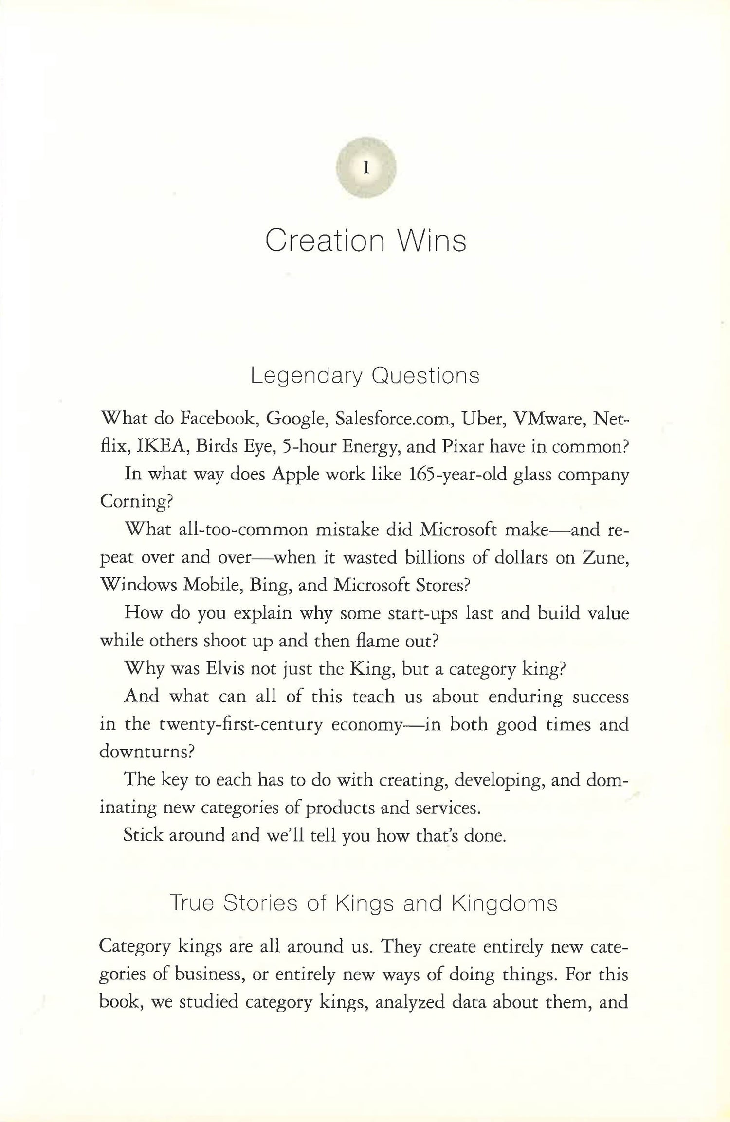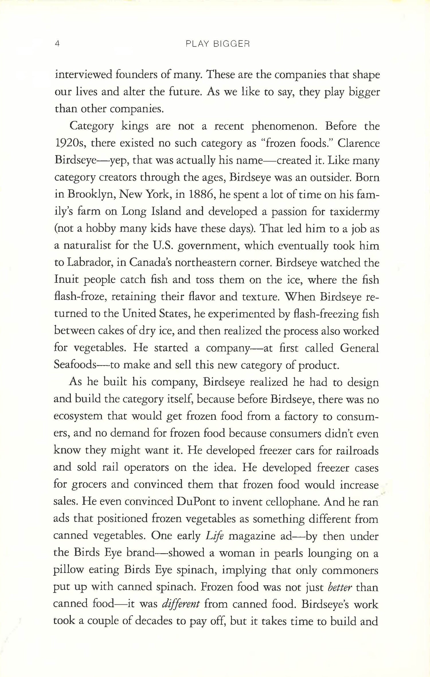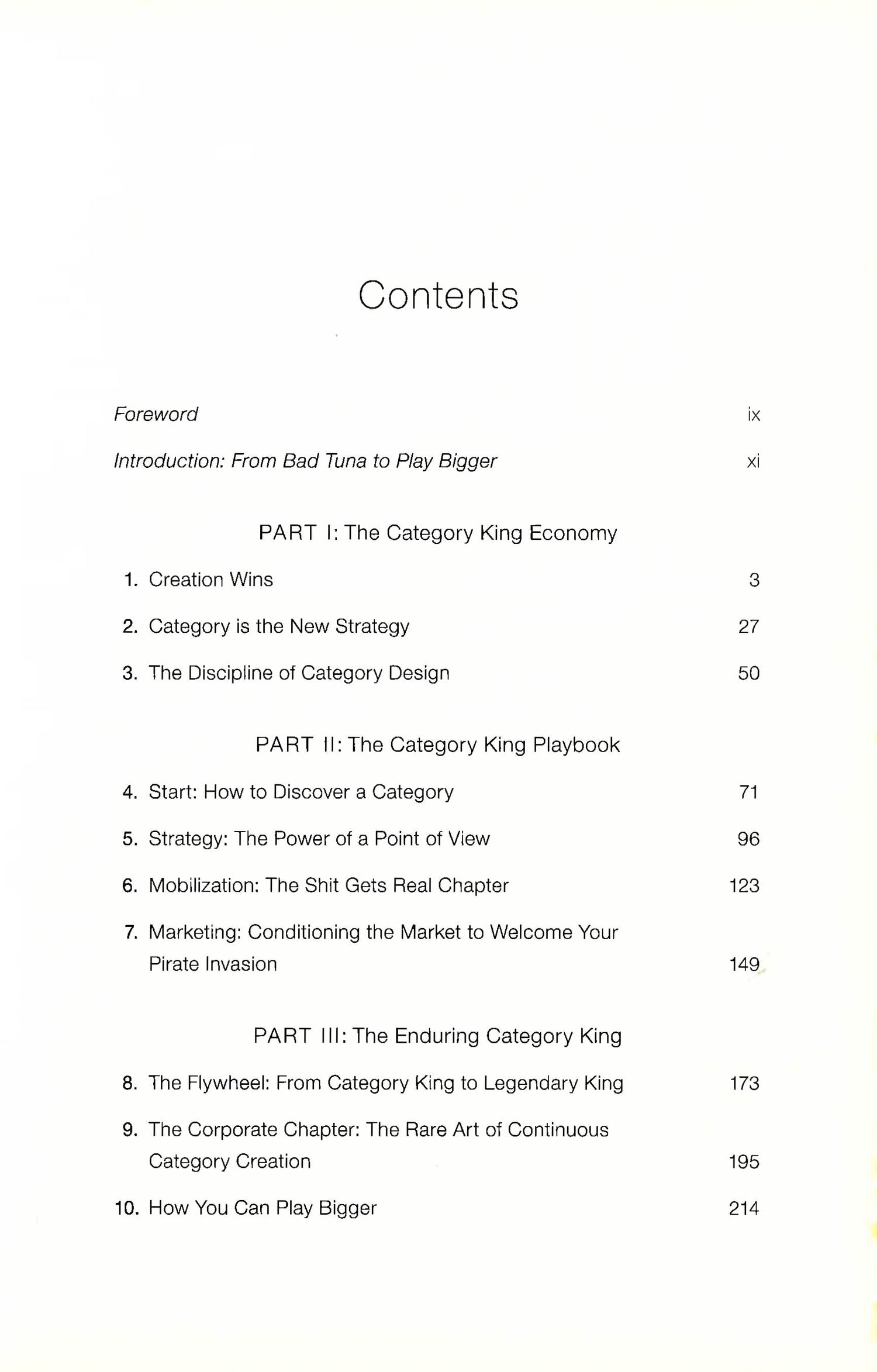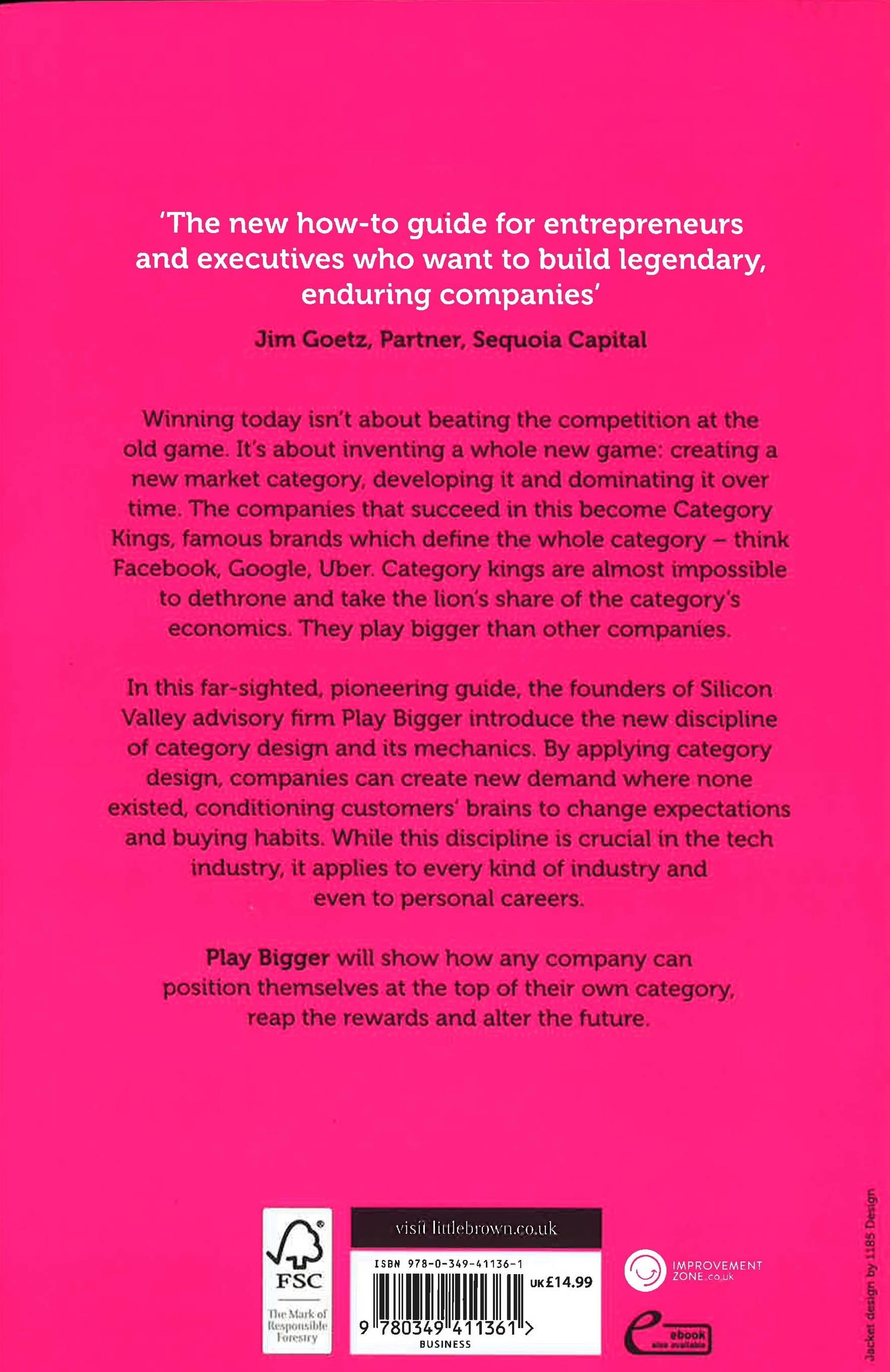 In today's world, it's no longer enough to create great new products; rather companies now must create whole new categories that destroy old ones. Uber created a new personal transportation category and destroyed taxis and limos. Salesforce.com created a new category of cloud-base sales automation, dethroning the old CRM industry. Airbnb, Workday, Tesla and Netflix are all winning by creating entirely new business categories that destabilise old ones. The category is the new strategy. The inclusion: If you want to build a legendary company, you need to design and build a legendary category at the same time, and dominate it over time. Your company needs to be a Category King. And if you don't design a Category King, you're creating a failure. Drawing on examples from within and beyond our own practice, PLAY BIGGER shows both entrepreneurs and established enterprises how to define, develop and rule a category over time.