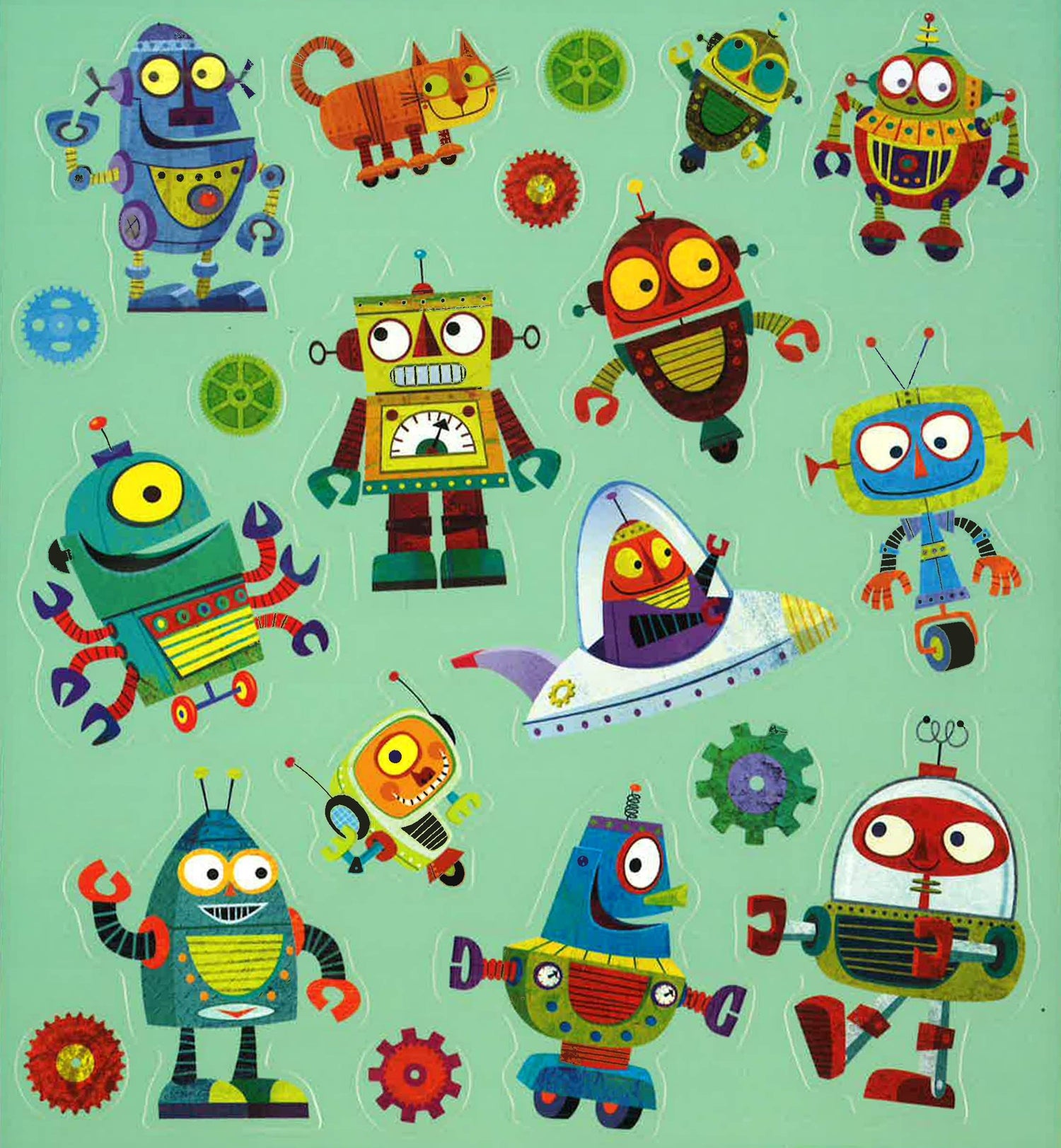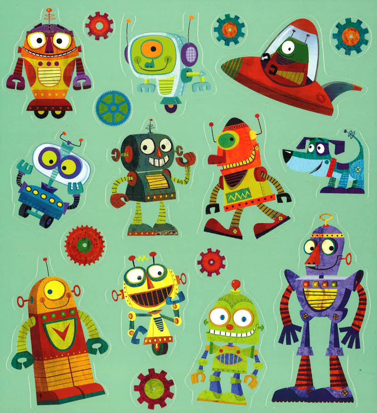 Gear up for hours of play with a Robots Play Scene from Mudpuppy. Michael Robertson illustrated lots of colorful, goofy automatons. Robot cats! Robot dogs! - Sticker board with handle, closed.