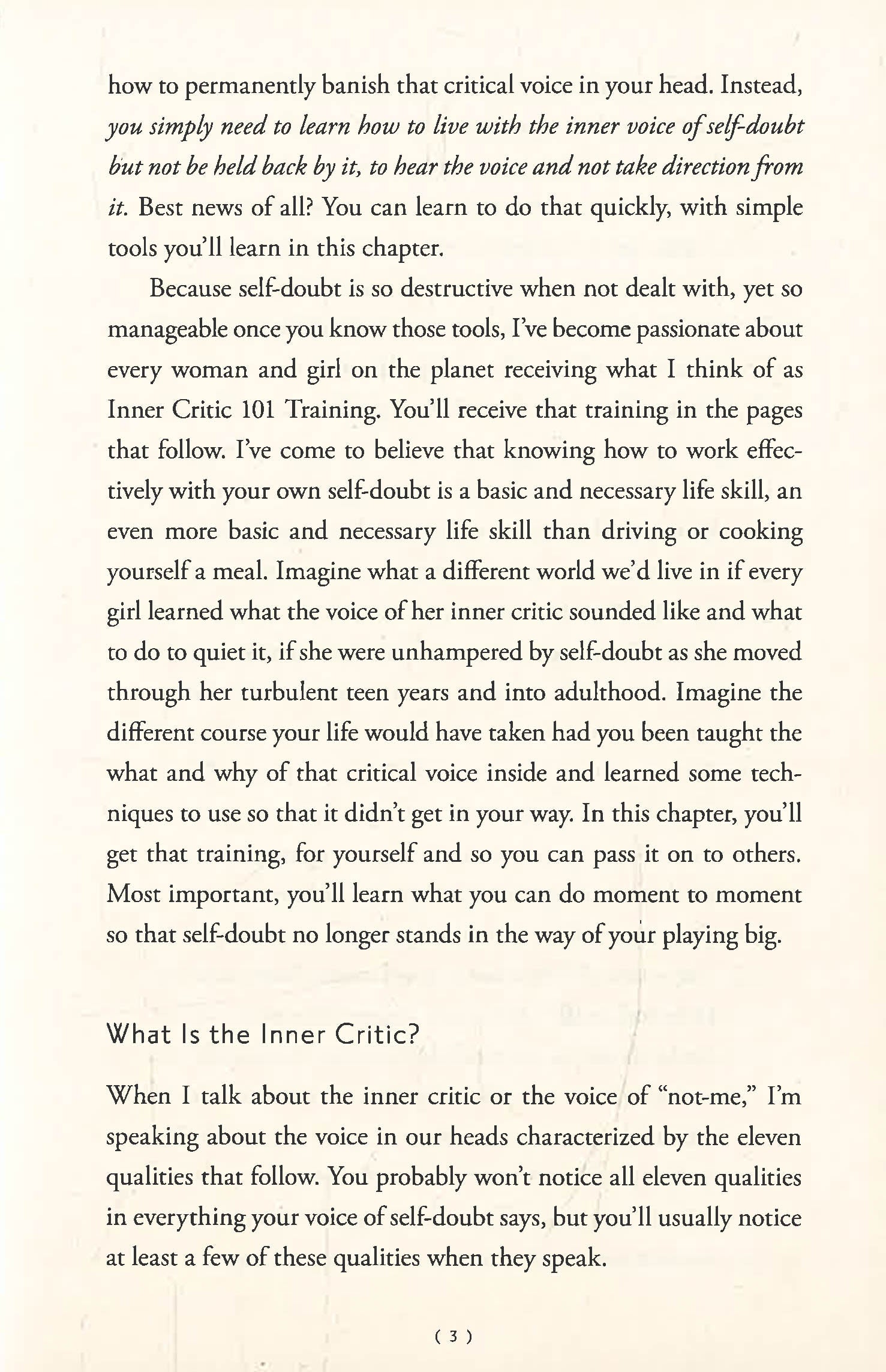 A groundbreaking women's leadership expert and popular conference speaker gives women the practical skills to voice and implement the changes they want to see--in themselves and in the world In her coaching and programs for women, Tara Mohr saw how women were "playing small" in their lives and careers, were frustrated by it, and wanted to "play bigger." She has devised a proven way for them to achieve their dreams by playing big from the inside out. Mohr's work helping women play bigger has earned acclaim from the likes of Maria Shriver and Jillian Michaels, and has been featured on the Today show, CNN, and a host of other media outlets. Sheryl Sandberg's Lean In gave many women new awareness about what kinds of changes they need to make to become more successful; yet most women need help implementing them. In the tradition of BrenŽ Brown's Daring Greatly, Playing Big provides real, practical tools to help women quiet self-doubt, identify their callings, "unhook" from praise and criticism, unlearn counterproductive good girl habits, and begin taking bold action.
