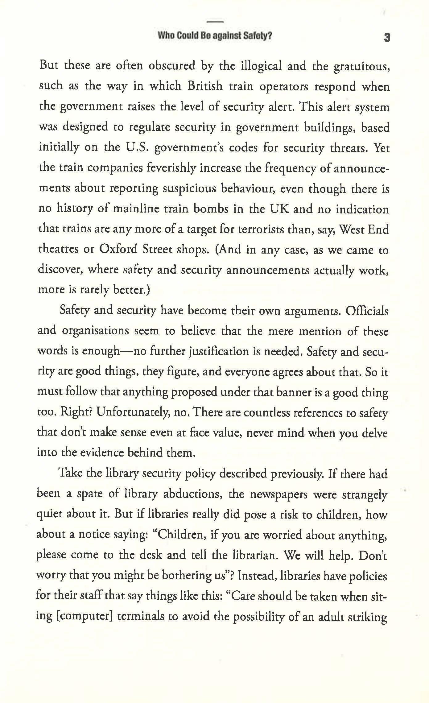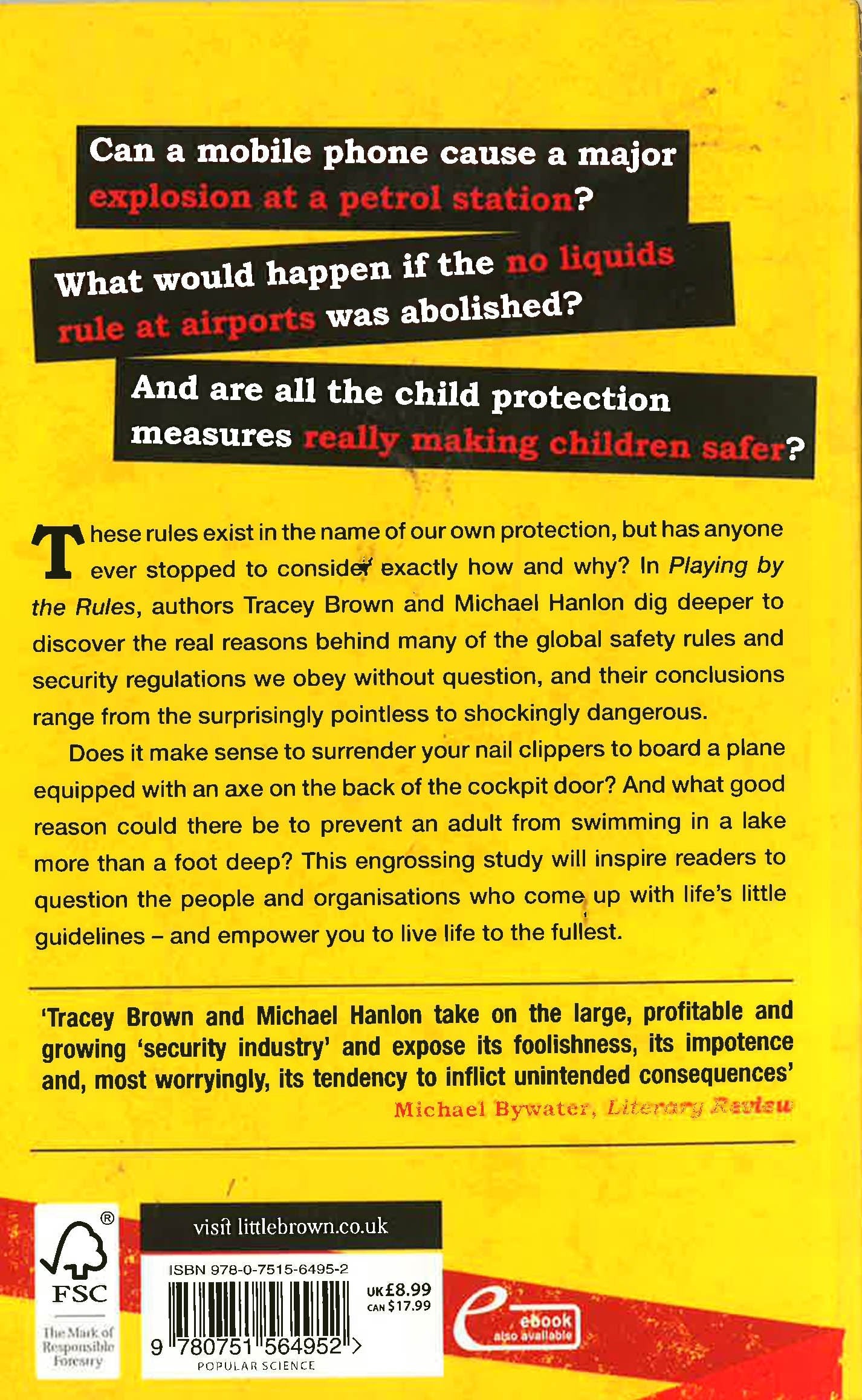 Does an airline pilot really need to surrender his tweezers at airport security when he's about to board an aircraft equipped with an axe on the back of the cockpit door? Can a mobile phone really cause a major explosion at a gas station? And is there really a good reason why you should be be prevented from swimming in a lake more than a foot deep? These rules exist, and they exist in the name of our own protection. But in this engrossing dissection of global health, safety and security regulations, authors Tracey Brown and Michael Hanlon dig a little deeper to discover the real reasons behind many of the instructions we obey without questioning their creators' motives. Their conclusions range from the startling to the staggering, and in presenting them the authors seek to empower readers to question the people and organisations who come up with them in the first place. Previously published as In the Interests of Safety.