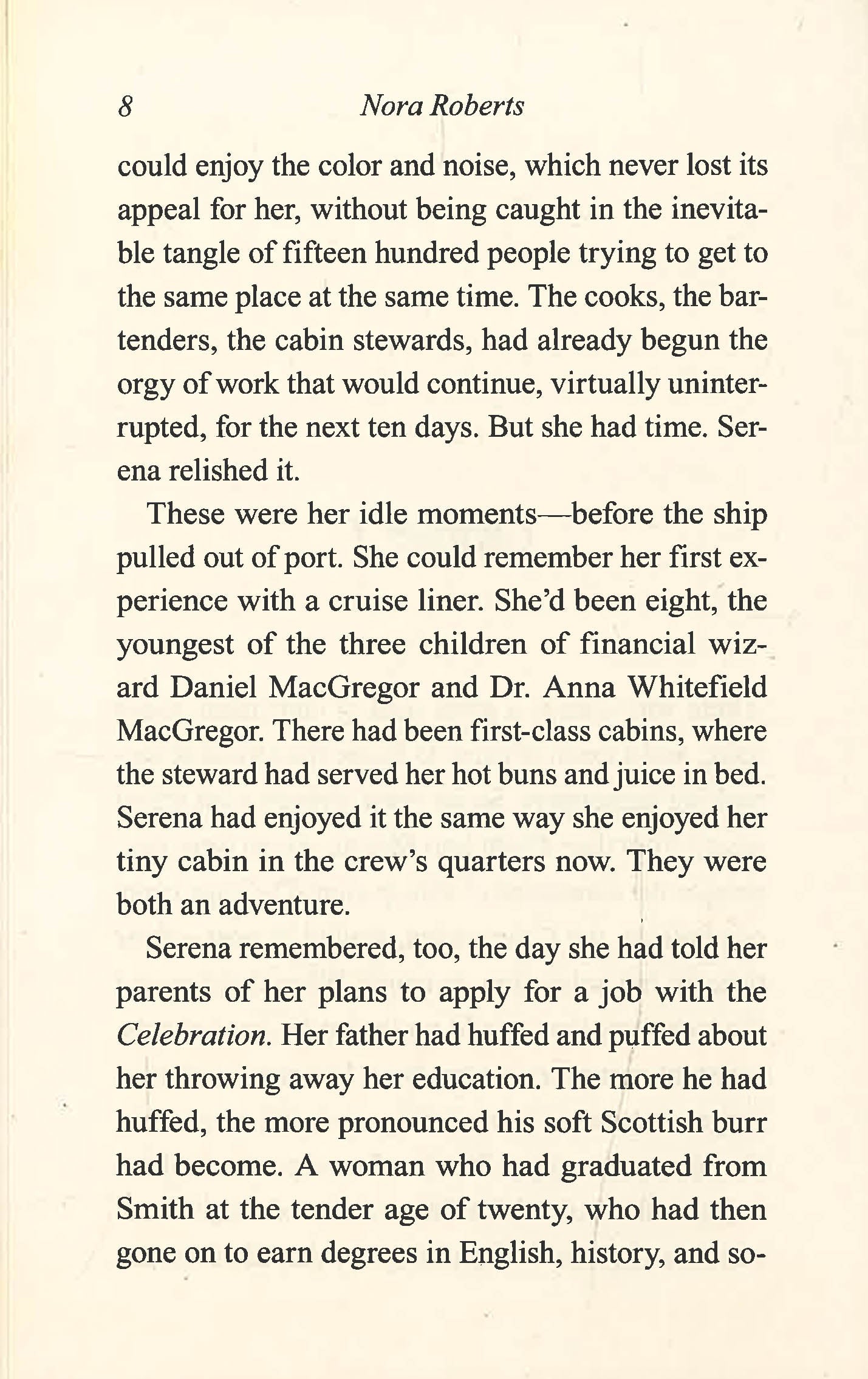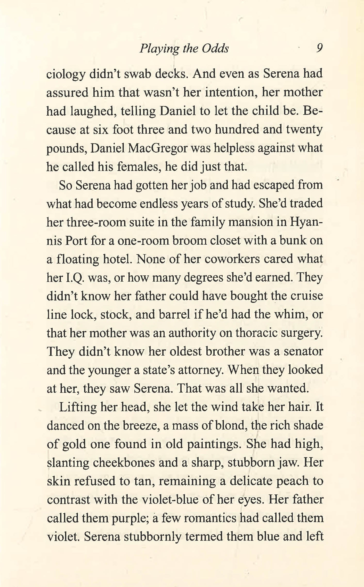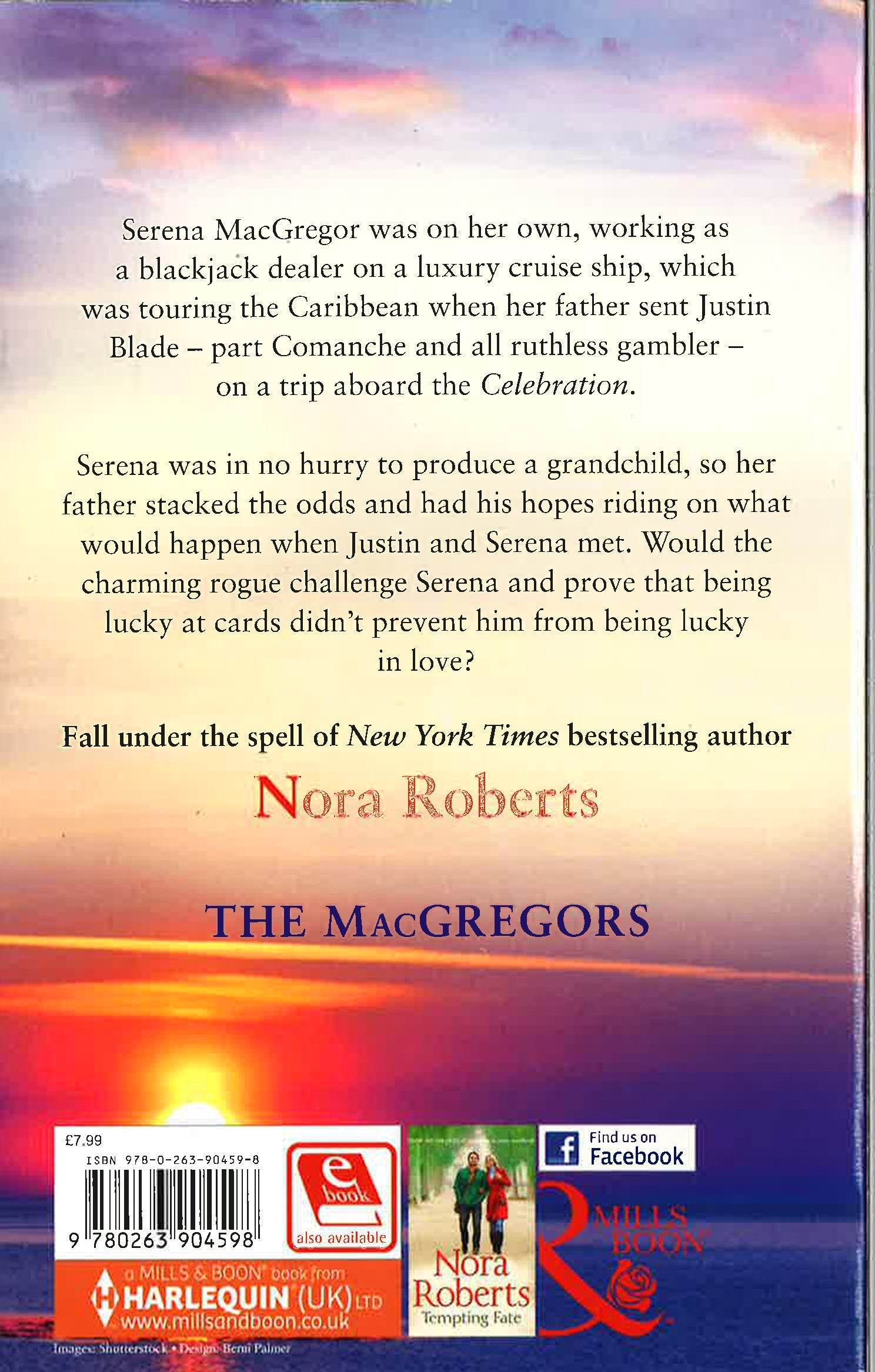 Serena MacGregor was on her own, working as a blackjack dealer on a luxury cruise ship, which was touring the Caribbean when her father sent Justin Blade - part Comanche and all ruthless gambler - on a trip aboard the Celebration. Serena was in no hurry to produce a grandchild, so her father stacked the odds and had his hopes riding on what would happen when Justin and Serena met. Would the charming rogue challenge Serena and prove that being lucky at cards didn't prevent him from being lucky in love? Fall under the spell of New York Times bestselling author Nora Roberts' THE MACGREGORS!