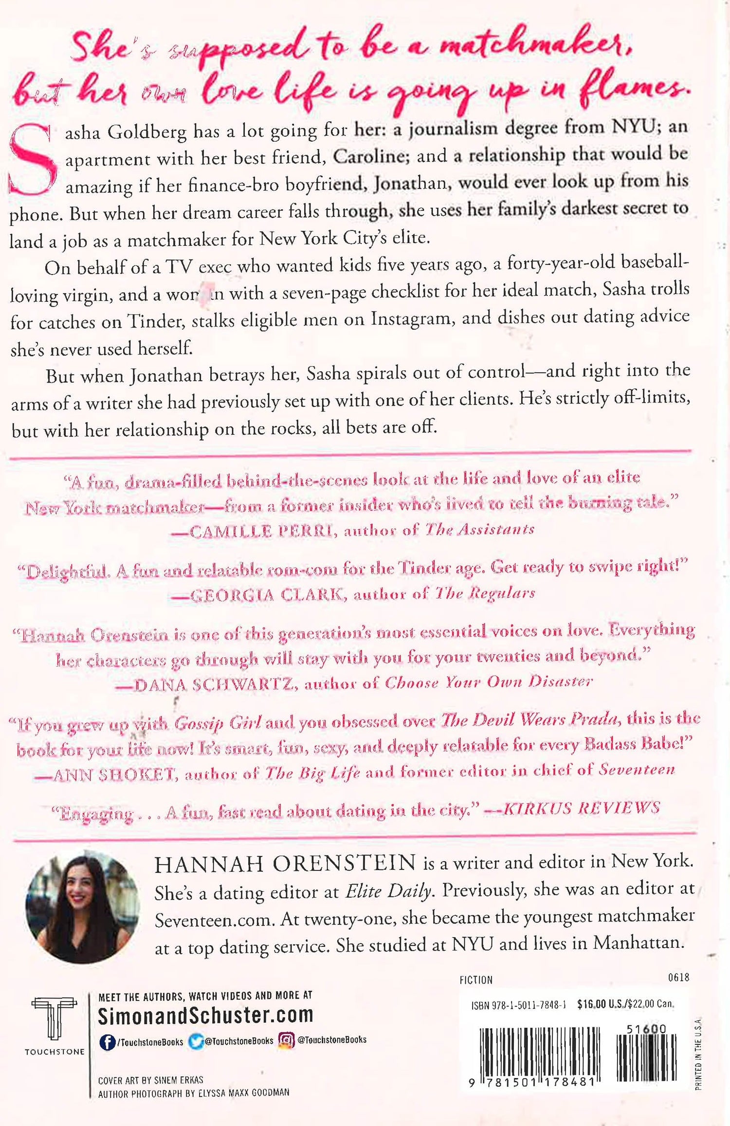 Sasha Goldberg has a lot going for her: a recent journalism degree from NYU, an apartment with her best friend Caroline, and a relationship that would be amazing if her finance-bro boyfriend Jonathan would ever look up from his BlackBerry. But when her dream career falls through, she uses her family’s darkest secret to land a job as a matchmaker for New York City’s elite at the dating service Bliss.Despite her inexperience, Sasha throws herself into her new career, trolling for catches on Tinder, coaching her clients through rejection, and dishing out dating advice to people twice her age. She sets up a TV exec who wanted kids five years ago, a forty-year-old baseball-loving virgin, and a consultant with a rigorous five-page checklist for her ideal match.Sasha hopes to find her clients The One, like she did. But when Jonathan betrays her, she spirals out of control - and right into the arms of a writer with a charming Southern drawl, who she had previously set up with one of her clients. He’s strictly off-limits, but with her relationship on the rocks, all bets are off.Fresh, sweet, and laugh-out-loud funny, Playing with Matches is the addictive story about dating in today’s swipe-heavy society, and a young woman trying to find her own place in the world.