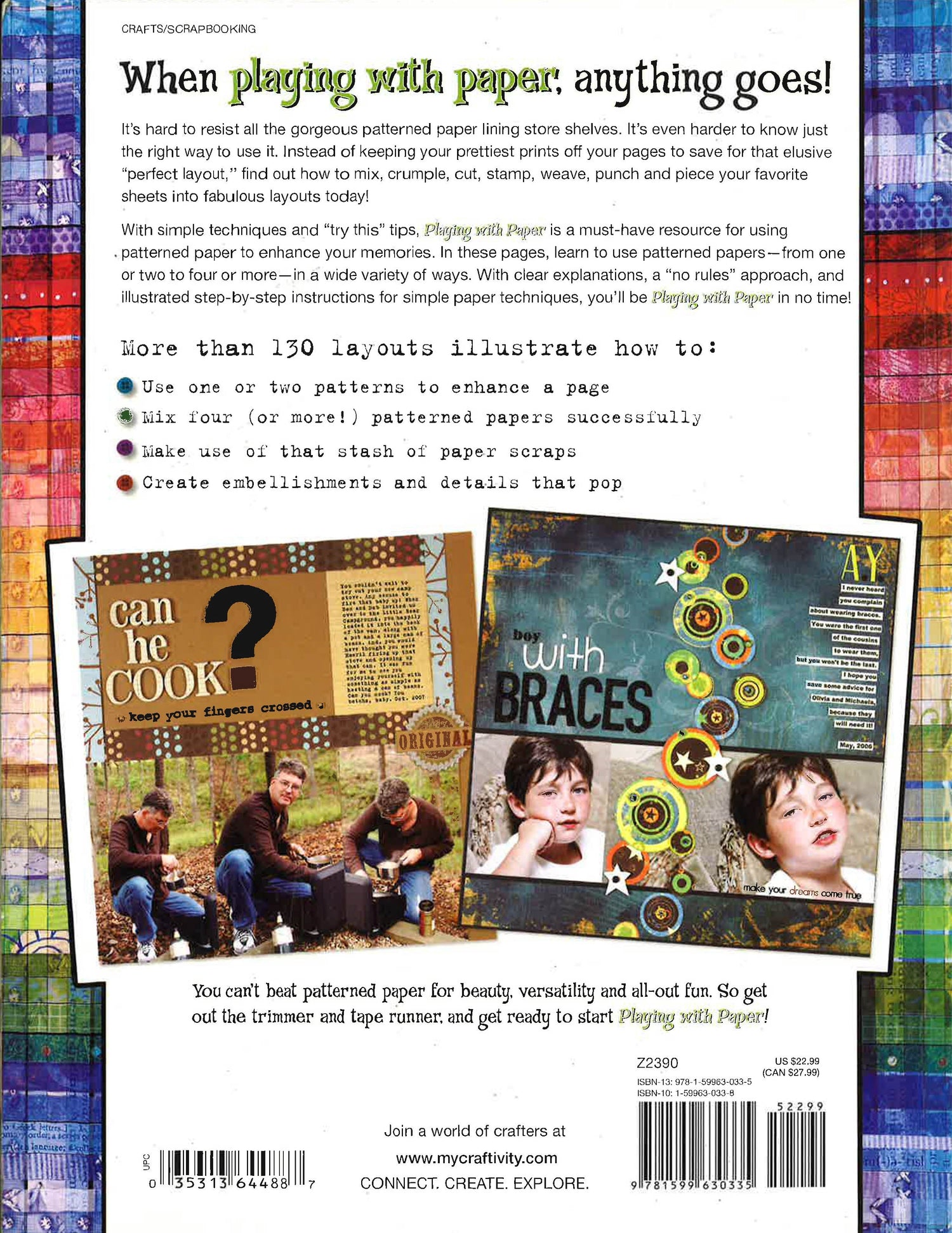 When playing with paper, anything goes! It's hard to resist all the gorgeous patterned paper lining store shelves. It's even harder to know just the right way to use it. Instead of keeping your prettiest prints off your pages to save for that elusive "perfect layout," find out how to mix, crumple, cut, stamp, weave, punch and piece your favorite sheets into fabulous layouts today! With simple techniques and "try this" tips, Playing with Paper is a must-have resource for using patterned paper to enhance your memories. In these pages, learn to use patterned papers-from one or two to four or more-in a wide variety of ways. With clear explanations, a "no rules" approach, and illustrated step-by-step instructions for simple paper techniques, you'll be Playing with Paper in no time! More than 130 layouts illustrate how to:Use one or two patterns to enhance a pageMix four (or more!) patterned papers successfullyMake use of that stash of paper scrapsCreate embellishments and details that pop You can't beat patterned paper for beauty, versatility and all-out fun. So get out the trimmer and tape runner, and get ready to start Playing with Paper!