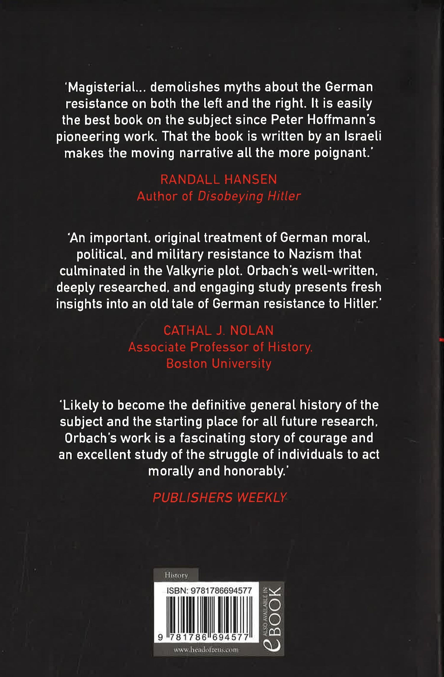 A new and definitive account of the anti-Nazi underground in Germany and its numerous efforts to assassinate Adolf Hitler. In 1933, Adolf Hitler became Chancellor of Germany. A year later, all parties but the Nazis had been outlawed, freedom of the press was but a memory, and Hitler's dominance seemed complete. Yet over the next few years, an unlikely clutch of conspirators emerged - soldiers, schoolteachers, politicians, diplomats, theologians, even a carpenter - who would try repeatedly to end the Fuhrer's genocidal reign. Danny Orbach's meticulously researched book tells the story of their noble, ingenious, and doomed efforts. This is history at its most suspenseful: we witness secret midnight meetings, crises of conscience, fierce debates among old friends about whether and how to dismantle Nazism, and the various plots themselves being devised and executed.