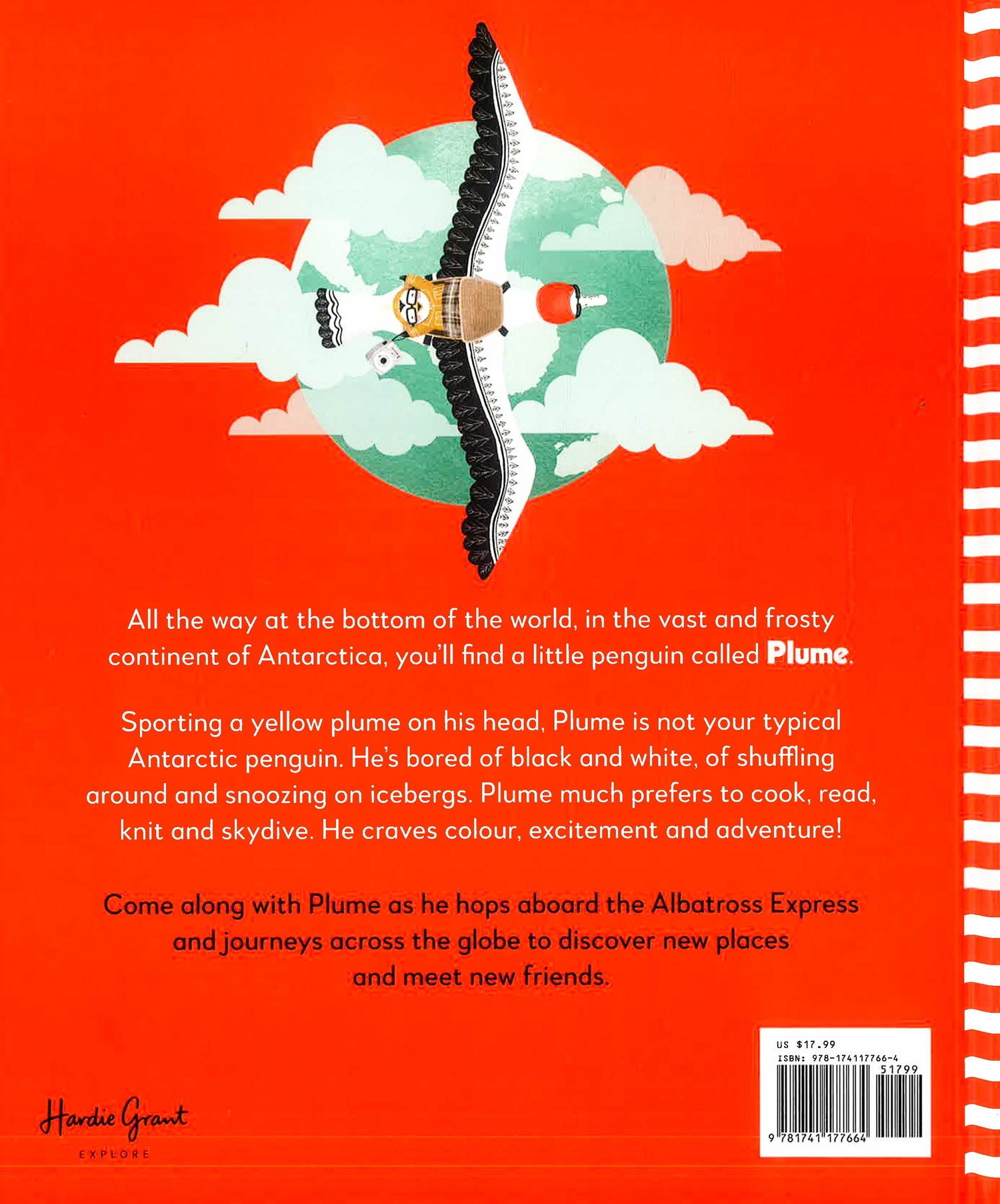 Hitch a ride on the Albatross Express and travel the globe with Plume: World Explorer. This exciting new series for little ones celebrates culture, diversity and the natural wonders of our world. Plume is not your typical Antarctic penguin. He loves to cook, read, knit sweaters and ice skate, and he sports a yellow plume on top of his head. Plume is bored of black and white, and of shuffling and snoozing on icebergs. He craves color, adventure, excitement! He wants to seize the world he's discovered between the pages of his fantastical Antarctic library (the largest in the Southern Hemisphere). Plume's greatest hope is to grow the hearts and minds of anyone who joins him in boarding the Albatross Express. Through his travels, children will engage with themes such as friendship, acceptance and the wellbeing of our planet. This is a book series for our times.