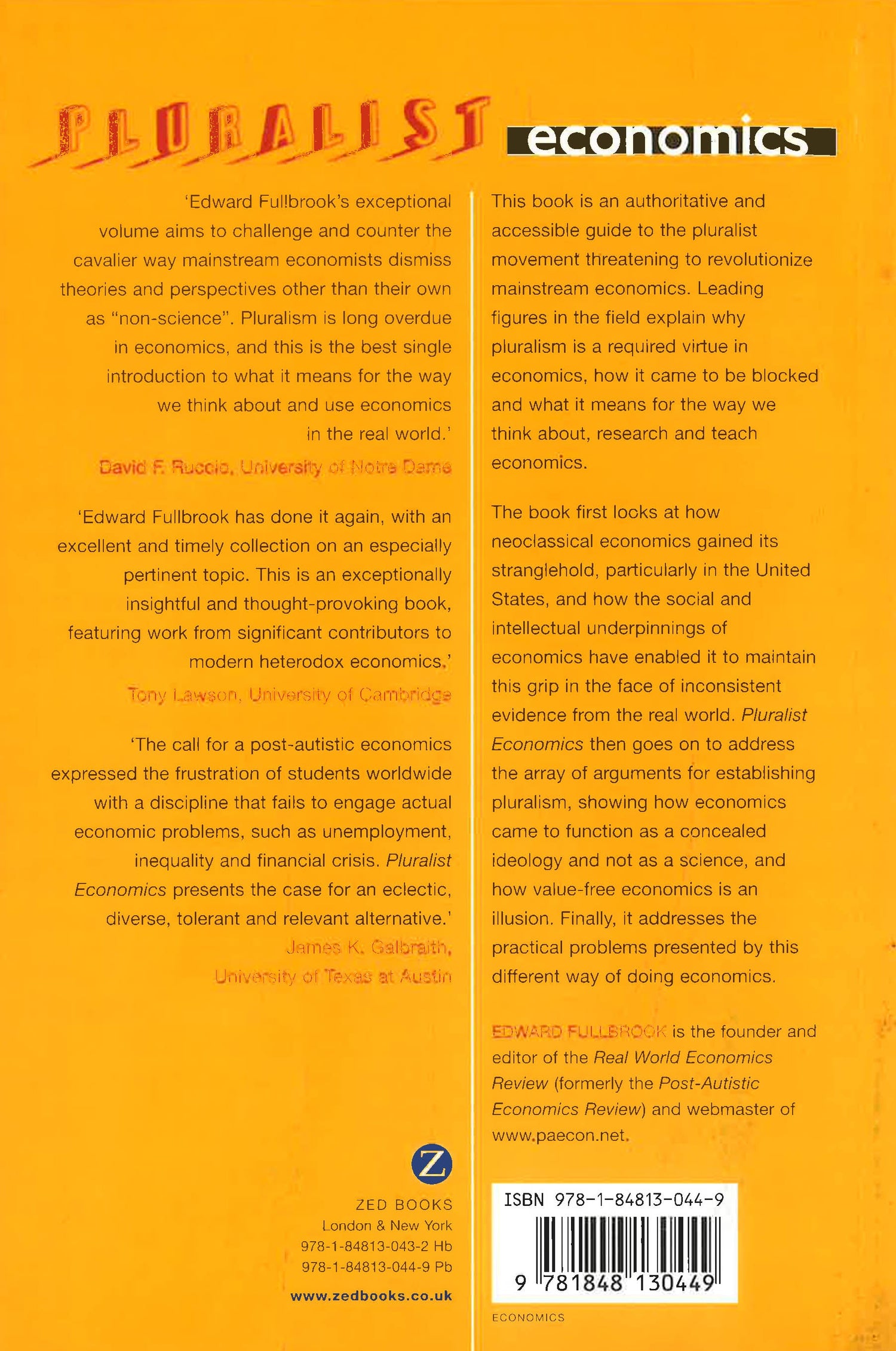 This book is an authoritative and accessible guide to the pluralist movement threatening to revolutionise mainstream economics. Leading figures in the field explain why pluralism is a required virtue in economics, how it came to be blocked and what it means for the way we think about, research and teach economics. The first part of the book looks at how neoclassical economics gained its stranglehold, particularly in the United States, and how the social and intellectual underpinnings of economics have enabled it to maintain this in the face of inconsistent evidence from the real world. This is then contrasted with different approaches to pluralism. Pluralist Economics then goes on to address the array of arguments for establishing pluralism, showing how economics came to function as a concealed ideology and not as a science, and how value-free economics is an illusion. Finally, it addresses the practical problems presented by this different way of doing economics.