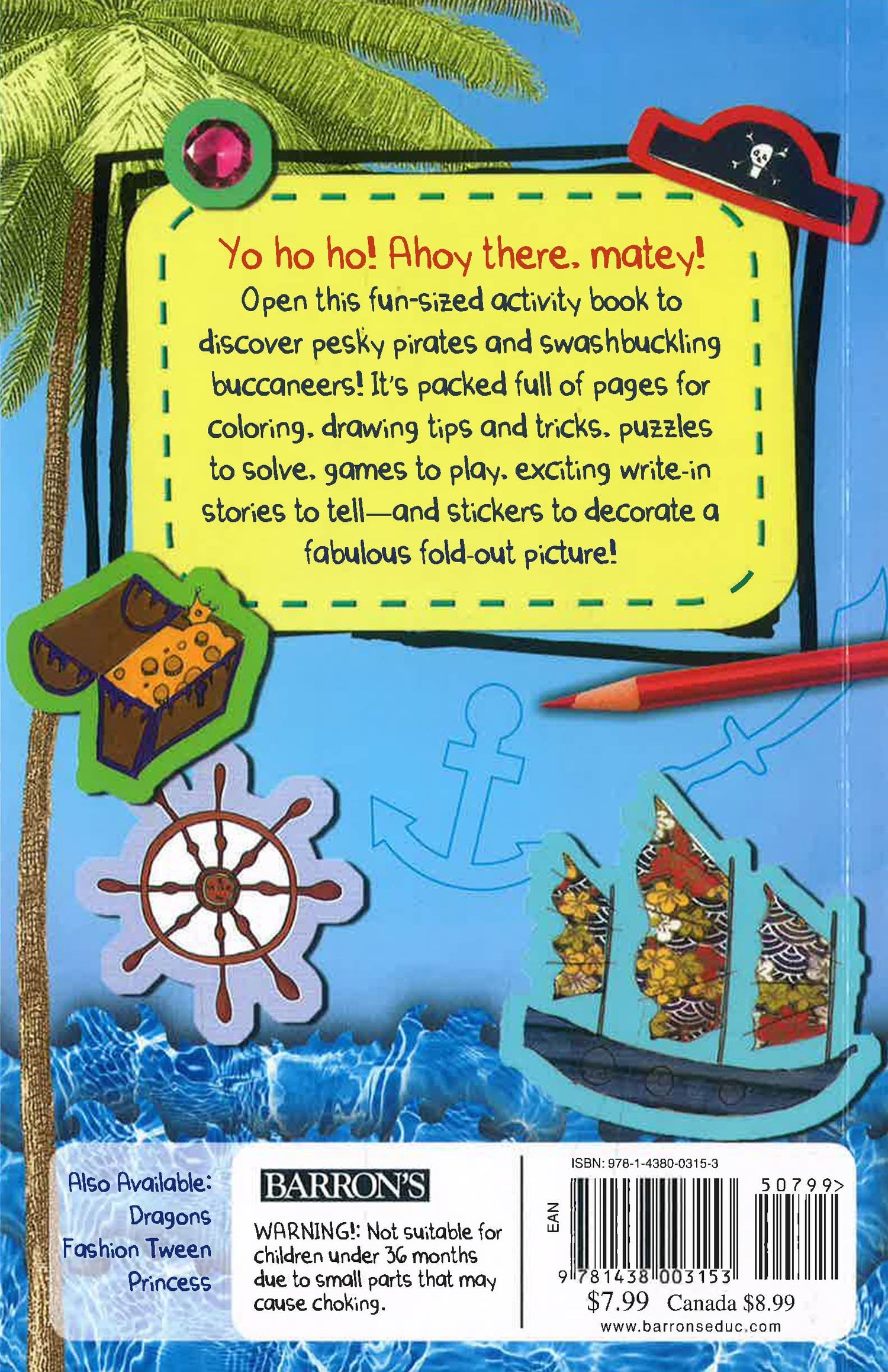 Small in size but bursting with fun activities to keep little boys creative, busy, and happy, Barron's Pirate Pocket Activity Fun & Games book has a pirate-theme stencil sheet, pirate stickers, a buried-treasure puzzle, and much more. Each title in Barron's series ofPocket Activity Fun & Games books is packed with pages to color, puzzles and mazes to solve, stickers for decorating each book's fold-out illustrations, projects to construct, and games to play.