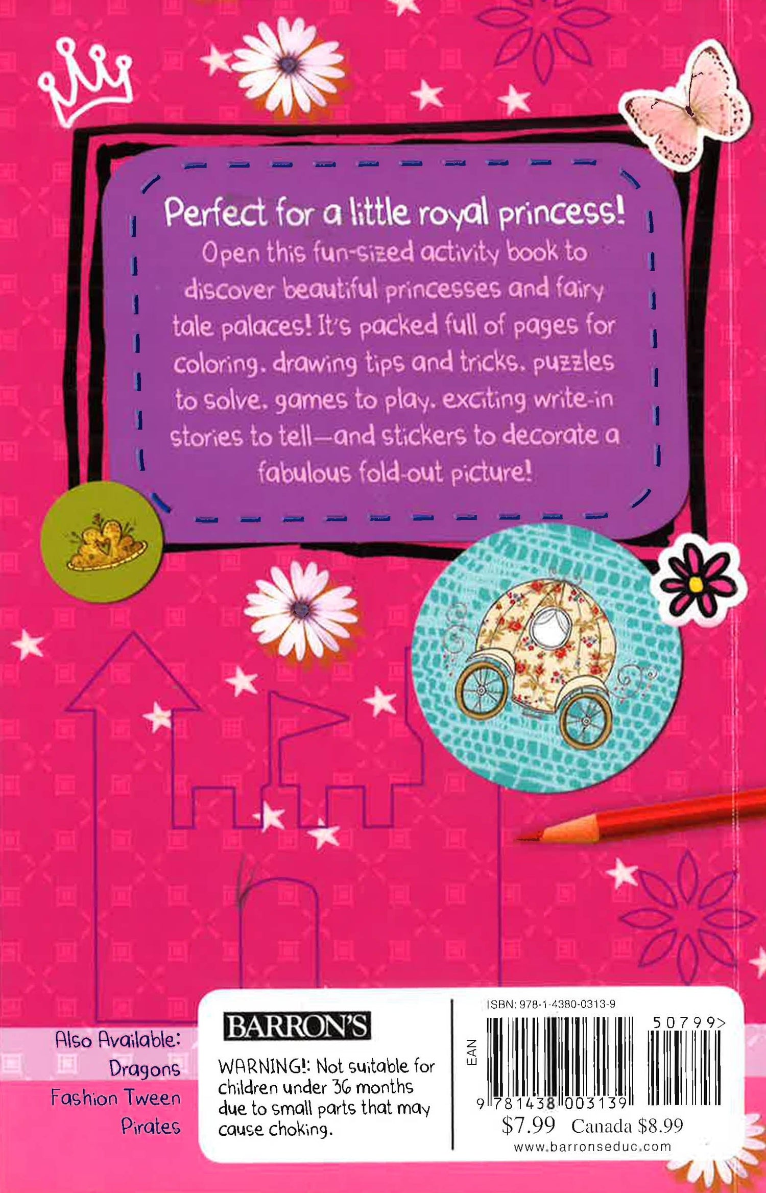 Small in size but bursting with fun activities to keep little girls creative, busy, and happy, Barron's Princess Pocket Activity Fun & Games book has a fun Are You a Real Princess? quiz to answer, princess pictures for coloring, prince and princess figures on press-out sheets, and dozens more princess-theme activities.
