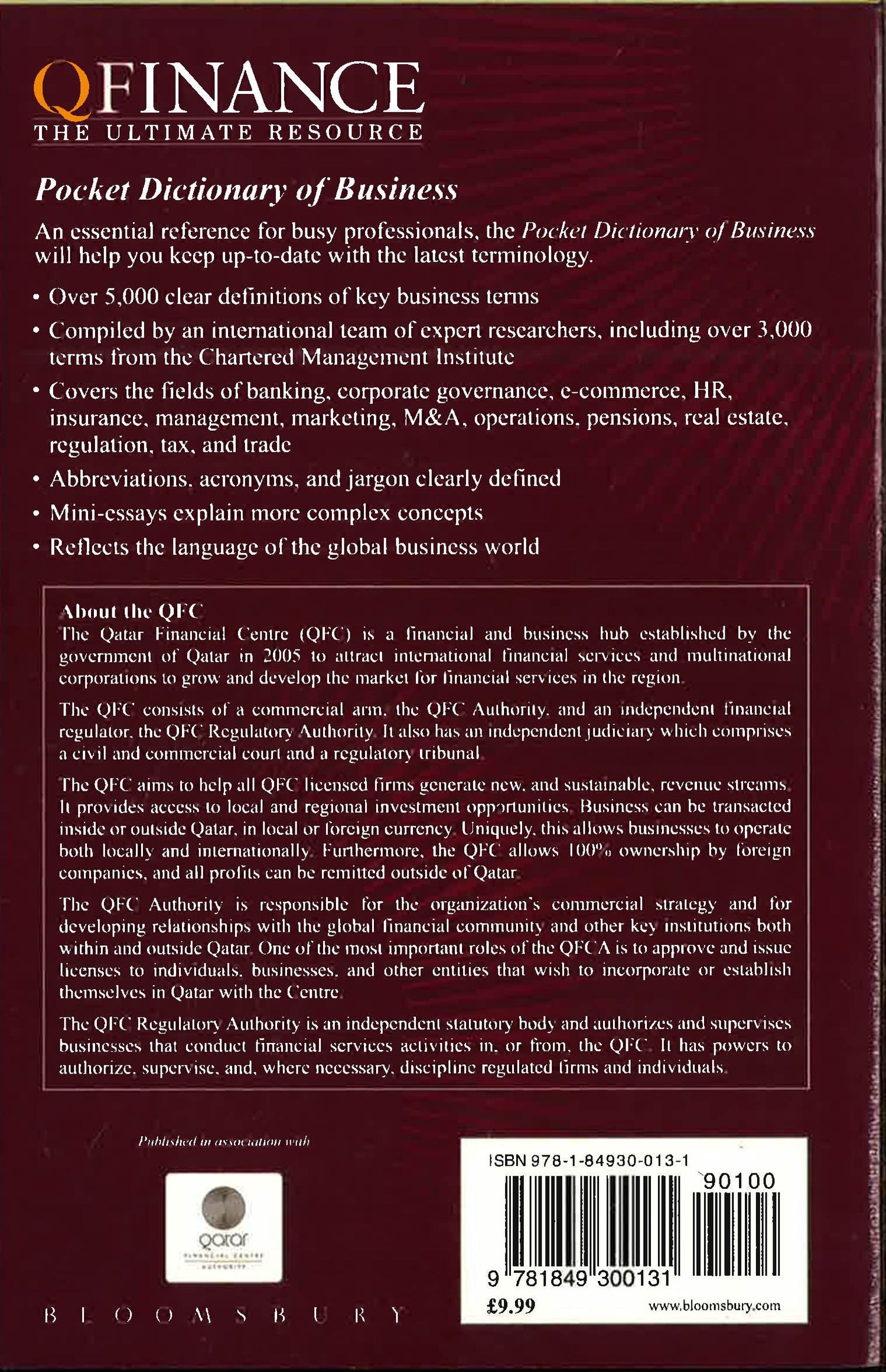 QFINANCE: The Pocket Dictionary of Business is designed for the business professional & students who needs quick concise definitions fast. With over 5,000 business terms packed into 224 pages this is an essential and comprehensive business reference, enabling you to be kept up-to-date with the latest business terminology. Main topics covered include: Accounting, Acquisitions, E-Commerce, Economics, Finance, Fraud, General Management, HR, Insurance, International Trade, Legal, Marketing, Mergers, Operations, Pensions, Personnel, Production, Real Estate, Risk, Statistics, Stockholding, Taxation and Treasury Management.