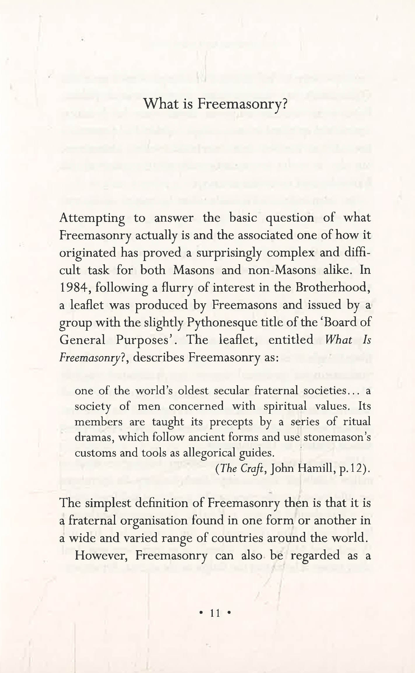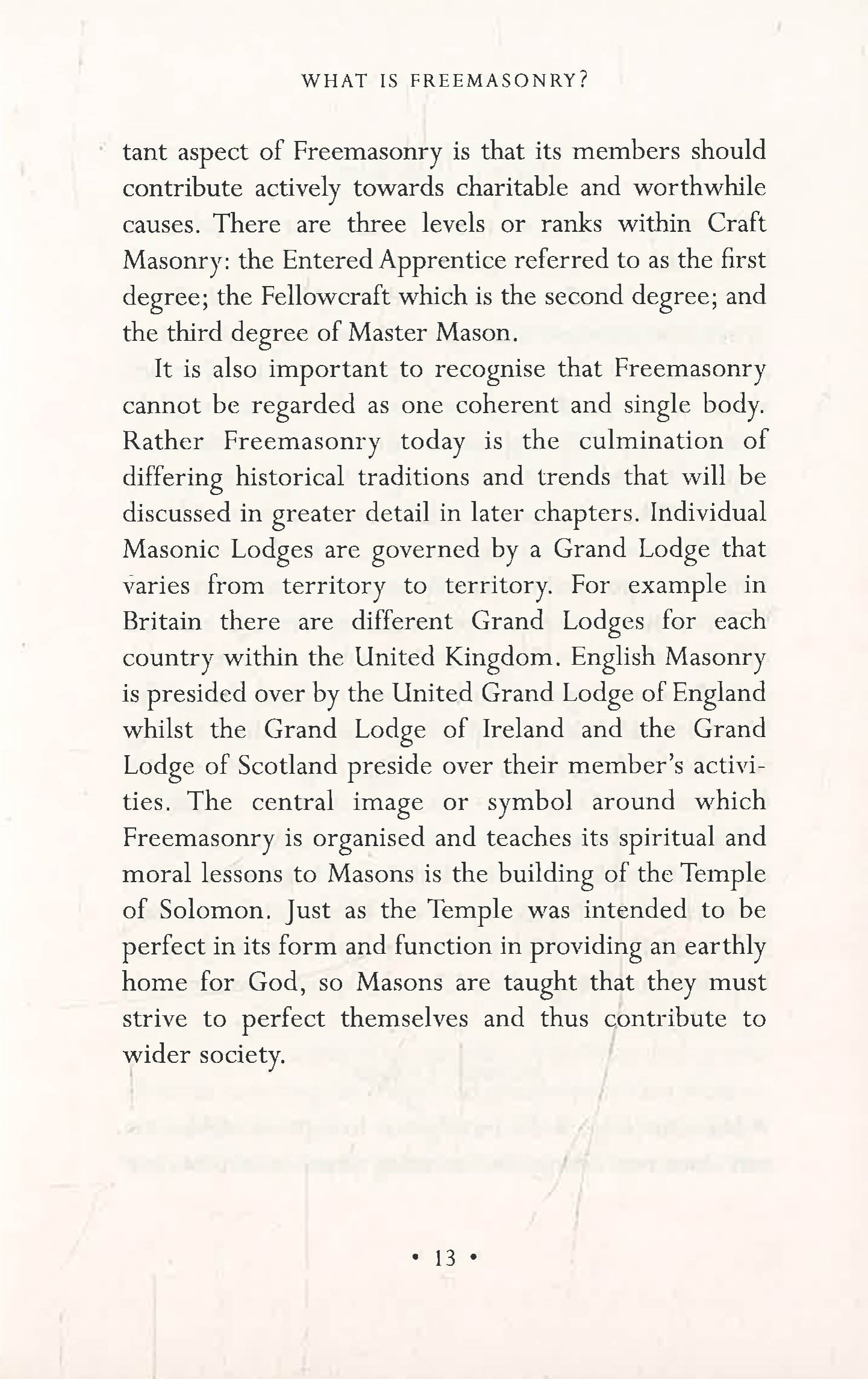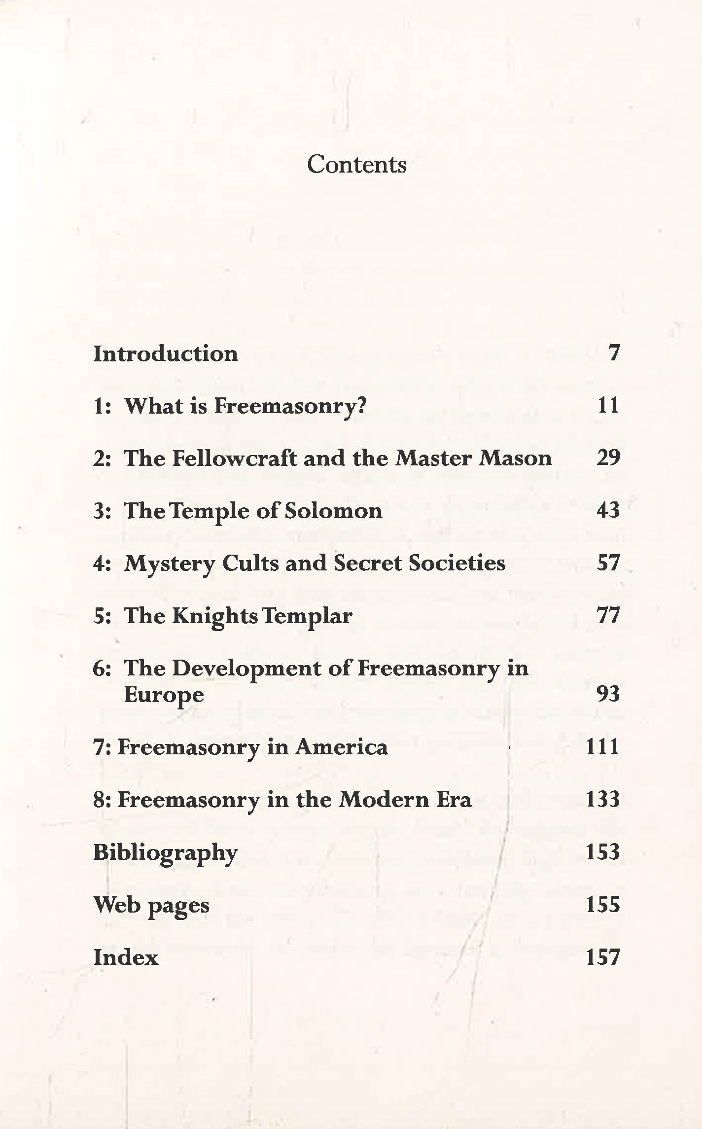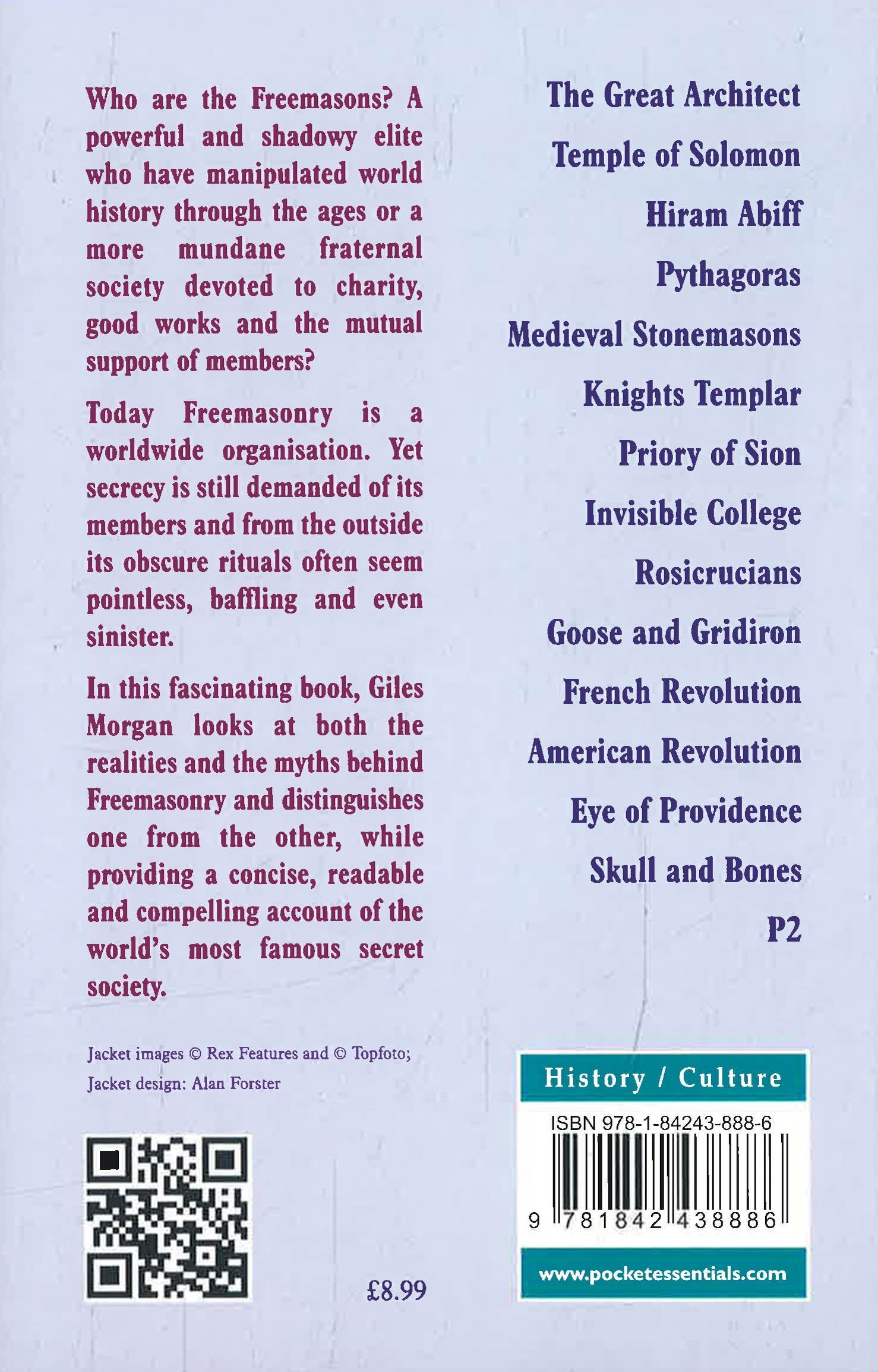 Giles Morgan begins by exploring the obscure and uncertain origins of Freemasonry. It has been variously argued that it derives from the practices of medieval stonemasons, that it dates to events surrounding the construction of the Temple of Solomon and that it is connected to ancient Mystery Cults. One of the major and often disputed claims made for Freemasonry is that it is directly attributable to the Knights Templar, generating a wealth of best-selling publications such as 'The Holy Blood and the Holy Grail' and more recently Dan Brown's 'The Da Vinci Code', linking Freemasonry to a supposed secret order known as the Priory of Sion who are the guardians of the true nature of the Holy Grail.