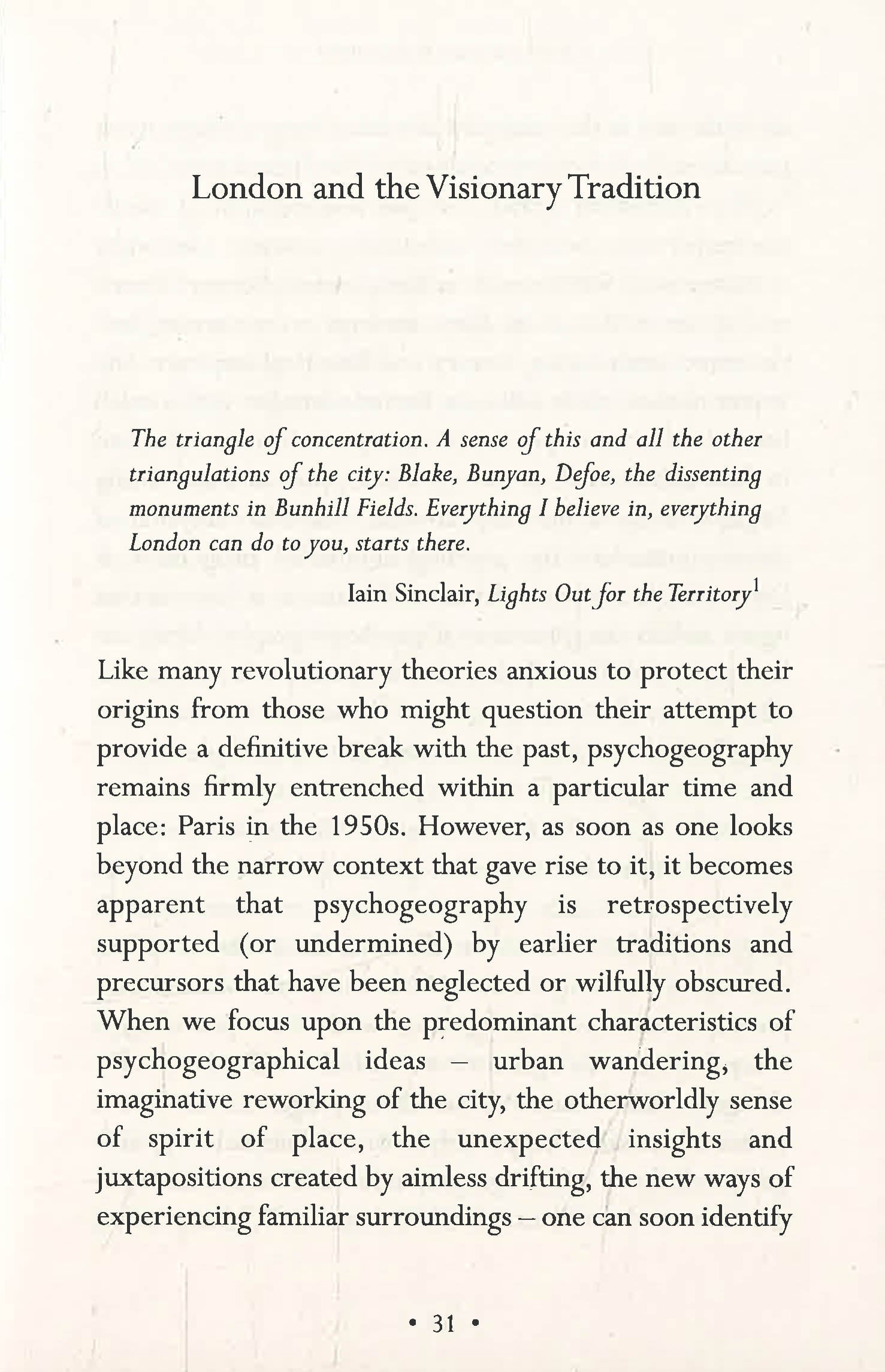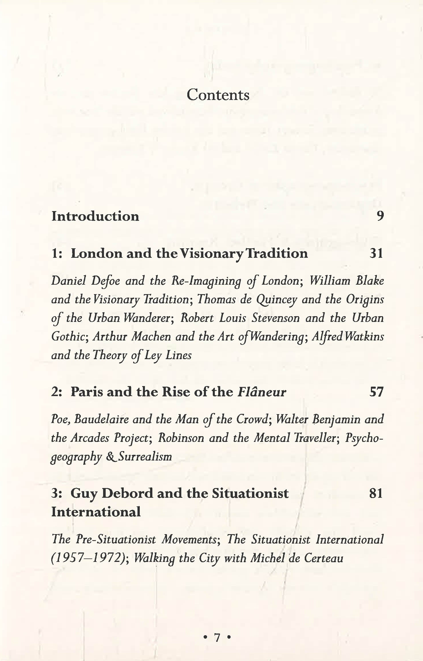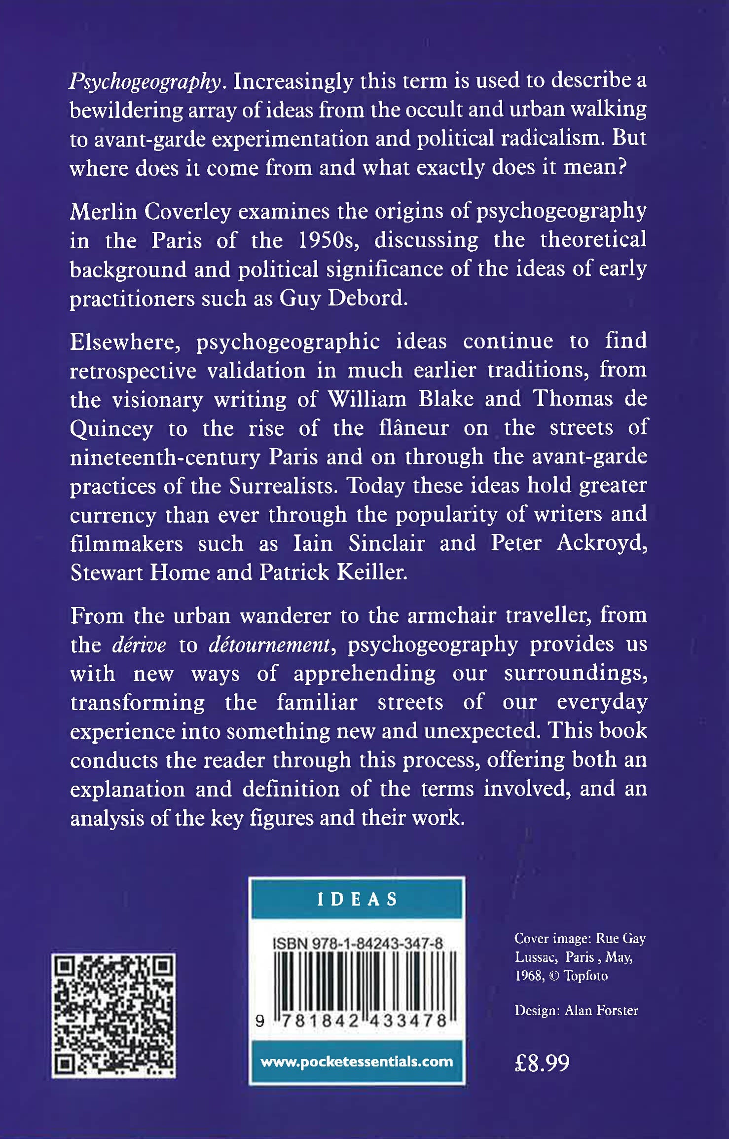 Elsewhere, psychogeographic ideas continue to find retrospective validation in much earlier traditions from the visionary writing of William Blake and Thomas De Quincey to the rise of the flâneur on the streets of 19th century Paris and on through the avant-garde experimentation of the Surrealists. These precursors are discussed here alongside their modern counterparts, for today these ideas hold greater currency than ever through the popularity of writers and filmmakers such as Iain Sinclair and Peter Ackroyd, Stewart Home and Patrick Keiller. This guide offers both an explanation and definition of the terms involved, an analysis of the key figures and their work, and practical information on psychogeographical groups and organizations.